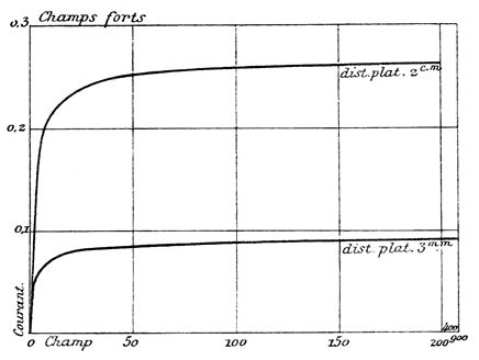 D'après des recherches récentes de M. Townsend, le phénomène est plus complexe quand la pression du gaz est faible. Le courant semble d'abord tendre vers une valeur limite constante quand la différence de potentiel augmente; mais, à partir d'une certaine différence de potentiel, le courant recommence à croître avec le champ, et cela avec une rapidité très grande. M. Townsend admet que cet accroissement est dû à une ionisation nouvelle produite par les ions eux-mêmes quand ceux-ci, sous l'action du champ électrique, prennent une vitesse suffisante pour qu'une molécule du gaz, rencontrée par un de ces projectiles, se trouve brisée et divisée en ses ions constituants. Un champ électrique intense et une pression faible favorisent cette ionisation par les ions déjà présents, et, aussitôt que celle-ci commence à se produire, l'intensité du courant croît constamment avec le champ moyen entre les plateaux[17]. Le courant limite ne saurait donc être obtenu qu'avec des causes ionisantes, dont l'intensité ne dépasse pas une certaine valeur, de telle façon que la saturation corresponde à des champs pour lesquels l'ionisation par choc des ions ne peut encore avoir lieu. Cette condition se trouvait réalisée dans mes expériences.