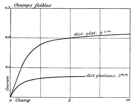En plus de la différence de potentiel que l'on établit entre les plateaux, il existe entre ces derniers une force électromotrice de contact, et ces deux causes de courant ajoutent leurs effets; c'est pourquoi la valeur absolue de l'intensité du courant change avec le signe de la différence de potentiel extérieure. Toutefois, pour des différences de potentiel notables, l'effet de la force électromotrice de contact est négligeable, et l'intensité du courant est alors la même, quel que soit le sens du champ entre les plateaux.