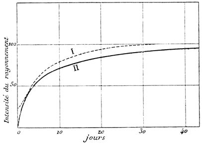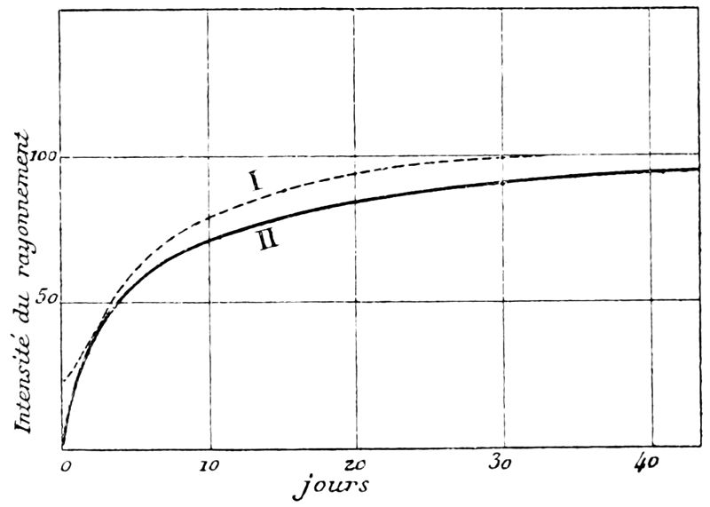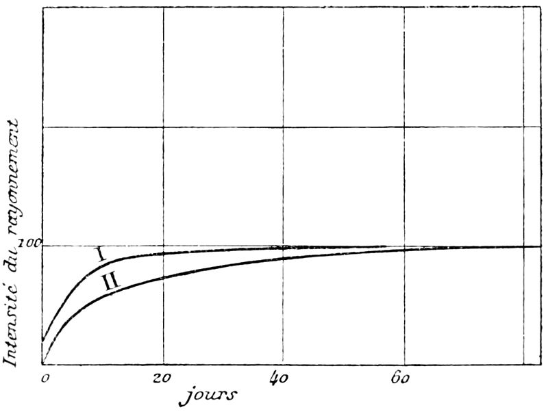 La spontanéité et la constance du rayonnement uranique se présentaient comme un phénomène physique tout à fait extraordinaire. M. Becquerel a conservé un morceau d'uranium pendant plusieurs années dans l'obscurité et il a constaté qu'au bout de ce temps l'action sur la plaque photographique n'avait pas varié sensiblement. MM. Elster et Geitel ont fait une expérience analogue et ont trouvé également que l'action était constante[7].