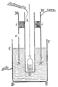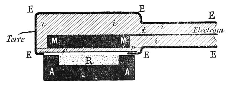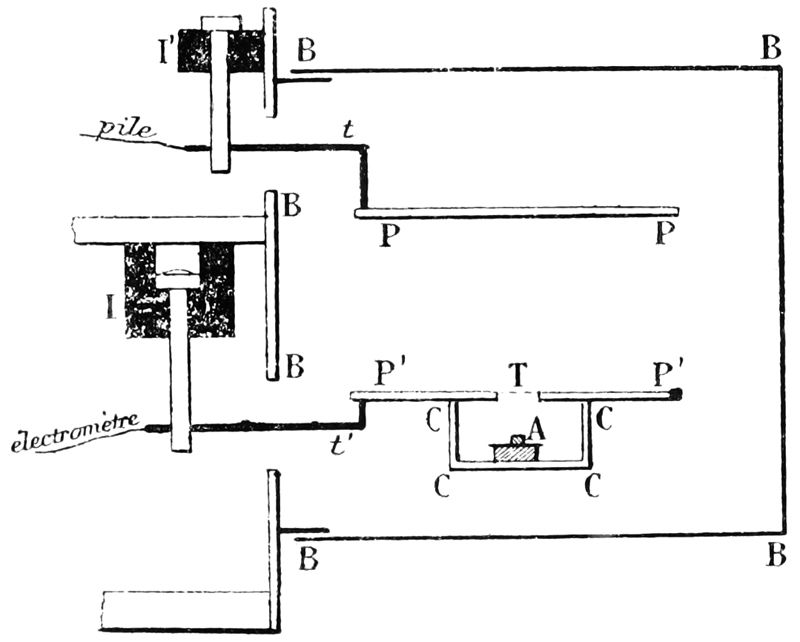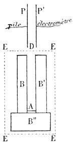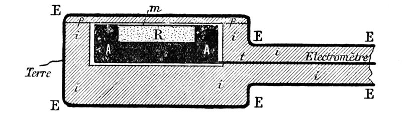 [47] A vrai dire, dans ces expériences, on observe toujours une déviation à l'électromètre, mais il est facile de se rendre compte que ce déplacement est un effet de la force électromotrice de contact qui existe entre le plateau relié à l'électromètre et les conducteurs voisins; cette force électromotrice fait dévier l'électromètre, grâce à la conductibilité de l'air soumis au rayonnement du radium.