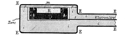 [49] L'enveloppe isolante doit être parfaitement continue. Toute fissure remplie d'air allant du conducteur intérieur jusqu'à l'enveloppe métallique est une cause de courant dû aux forces électromotrices de contact utilisant la conductibilité de l'air sous l'action du radium.