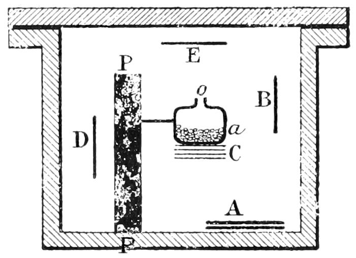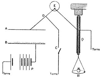 Mesure de l'intensité du rayonnement.—La méthode employée consiste à mesurer la conductibilité acquise par l'air sous l'action des substances radioactives; cette méthode a l'avantage d'être rapide et de fournir des nombres qu'on peut comparer entre eux. L'appareil que j'ai employé à cet effet se compose essentiellement d'un condensateur à plateaux AB (fig. 1). La substance active finement pulvérisée est étalée sur le plateau B; elle rend conducteur l'air entre les plateaux. Pour mesurer cette conductibilité, on porte le plateau B à un potentiel élevé, en le reliant à l'un des pôles d'une batterie de petits accumulateurs P, dont l'autre pôle est à la terre. Le plateau A étant maintenu au potentiel du sol par le fil CD, un courant électrique s'établit entre les deux plateaux. Le potentiel du plateau A est indiqué par un électromètre E. Si l'on interrompt en C la communication avec le sol, le plateau A se charge, et cette charge fait dévier l'électromètre. La 9 vitesse de la déviation est proportionnelle à l'intensité du courant et peut servir à la mesurer.
