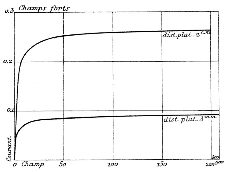 2º Pour obtenir le courant limite relatif à un rayonnement 13 donné, il faut, d'une part, faire absorber intégralement ce rayonnement par le gaz, en employant une masse absorbante suffisante; d'autre part, il faut utiliser pour la production du courant tous les ions créés, en établissant un champ électrique assez fort pour que le nombre des ions qui se recombinent devienne une fraction insignifiante du nombre total des ions produits dans le même temps, qui sont presque tous entraînés par le courant et amenés aux électrodes. Le champ électrique moyen nécessaire pour obtenir ce résultat est d'autant plus élevé que l'ionisation est plus forte.