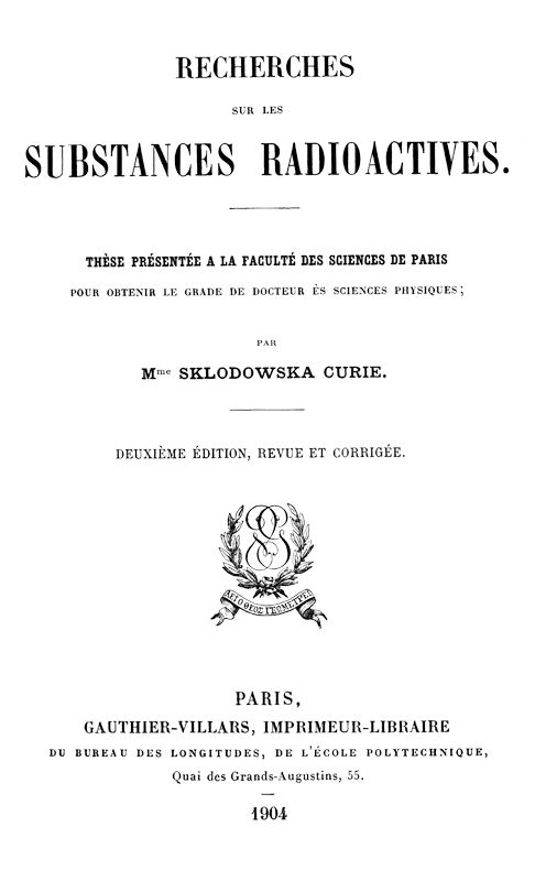 Nous dirons que l'uranium, le thorium et leurs composés émettent des rayons de Becquerel. J'ai appelé radioactives les substances qui donnent lieu à une émission de ce genre[11]. Ce nom a été depuis généralement adopté.
