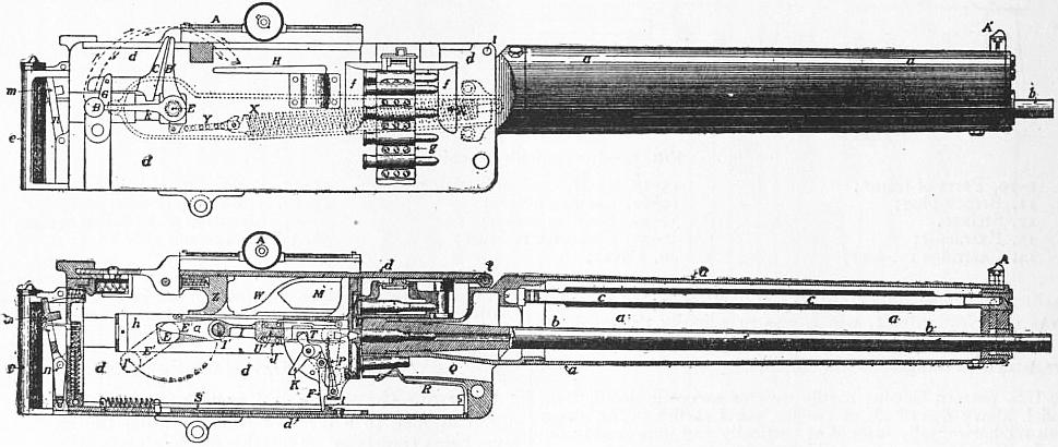 The great difficulty which has to be met in all single-barrel machine guns is the heating of the barrel. The 7½ pints of water in the water-jacket of the Maxim gun are raised to boiling point by 600 rounds of rapid fire—i.e. in about 1½ minutes—and if firing be continued, about 1½ pints of water are evaporated for every 1000 rounds. Assuming that the operation is continuous, the rate of waste of energy due to heat expended on the water alone is equivalent to about 20 horse-power (294 foot tons per minute). The water-jacket acts well in keeping down the temperature of the barrel; but apart from the complications entailed by its use, the provision of water for this purpose is at times exceedingly troublesome on service. In the Hotchkiss and Colt guns, which have no water-jacket, an attempt is made to meet the heating, in the one by the radiator, and in the other by a very heavy barrel.