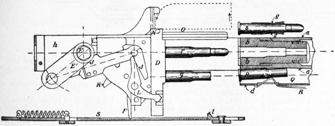 The retracting springs now react and pull the slide forwards; the cam (98) strikes the dog (23), which, as the spring arrangement is of the “non-return” class, does not yield but is depressed, and the front of the carrier and the cartridge on it are therefore raised sharply, and the latter placed in the path of the bolt. The bolt being now pulled forwards, the cartridge is driven off the carrier into the breech, and the bolt locked by the pin (14), causing the bolt to drop in front of the recoil blocks; the carrier is pushed down flat by the advance of the cam lug (98), the trip releases the sear (10), and the projection (96) pushes back the feed lever, completing the action of feeding a fresh cartridge forward. The position shown in fig. 17 is now resumed.