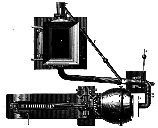 The gas from the generator is brought to the mouth of the pot by the tubes, k and m. The air necessary for the combustion of the gas is brought in by a tube, l, branching from the air main, l''. The air tube, l, passes into the gas tube and is continued concentrically within the latter. The gas and air tubes both have joints at m' and m''. By means of the bar, n, which has a counterpoise to keep the moving parts in position, the tubes can be brought from or toward the mouth of the pot, so as to make it free of access to the workman. With a key fitting on the stem, n', the tubes can be turned in m', so as to give the currents of gas and air a more or less oblique direction. To screen the workmen from the heat of the pot a disk of iron, o, lined with fire clay on the side next the pot, is fitted to the end of the tubes.