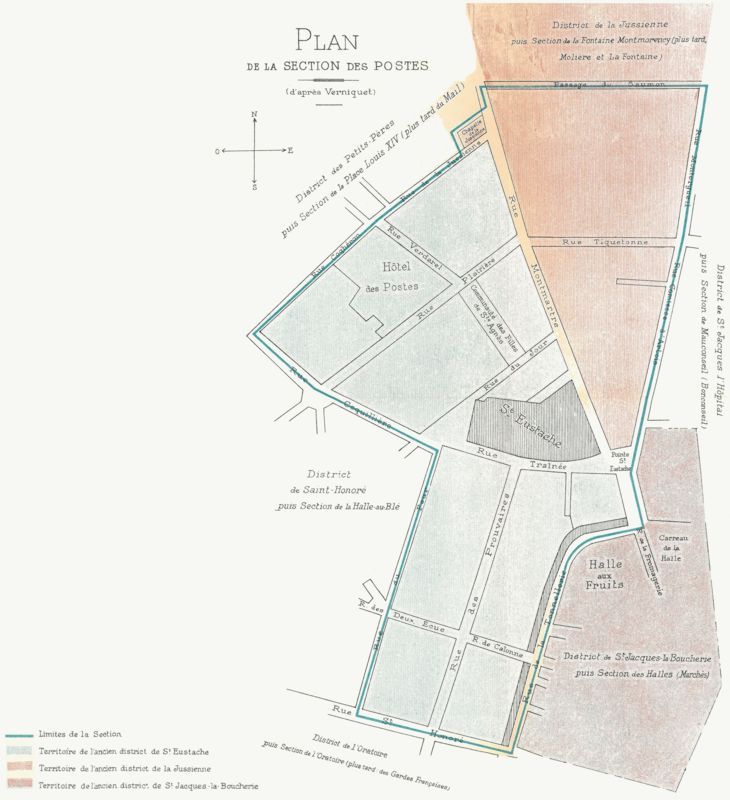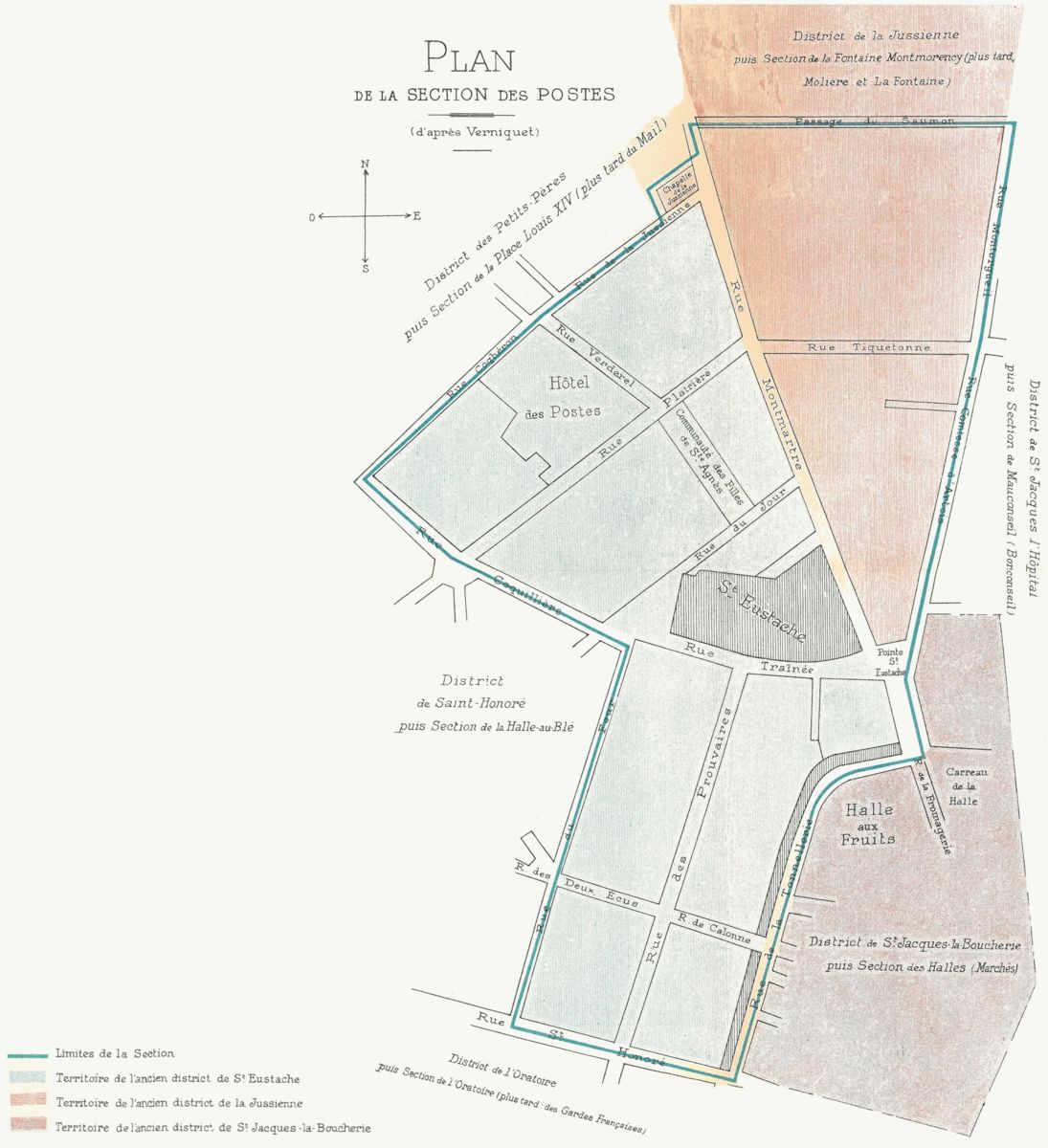 Il est inutile d'entrer dans de longs détails pour dire ici ce qu'était à cette époque la section des Postes. C'était une section du centre, située dans un quartier commerçant, et habitée surtout par des bourgeois et des boutiquiers. La topographie en sera plus clairement indiquée, dans le plan joint à ce travail, qu'elle ne pourrait l'être par une description. VIII On n'a qu'à se reporter à ce plan pour connaître la situation de l'église Saint-Eustache ou de la chapelle de la Jussienne où fut transporté le lieu des séances de l'Assemblée générale, la distribution des districts qui formèrent la section ou qui en étaient voisins (et par conséquent celle des bataillons de la garde nationale: Saint-Eustache, La Jussienne, Saint-Jacques-la-Boucherie), l'emplacement des rues, etc. D'autre part on trouvera, dans les notes, les renseignements biographiques nécessaires sur quelques-uns des principaux personnages qui jouèrent un rôle dans la section, tels que Deslauriers, Cerfvol, Desvieux, etc. Enfin, pour guider le lecteur dans le dépouillement de ce volume, je donne, à la fin de l'ouvrage, dans la table des matières, l'indication des principales affaires traitées dans chaque séance et un index alphabétique des noms propres.