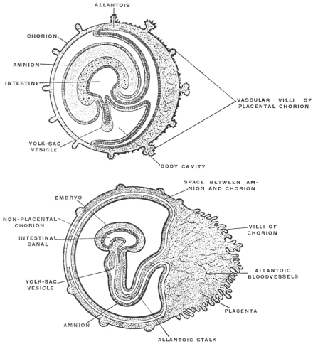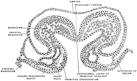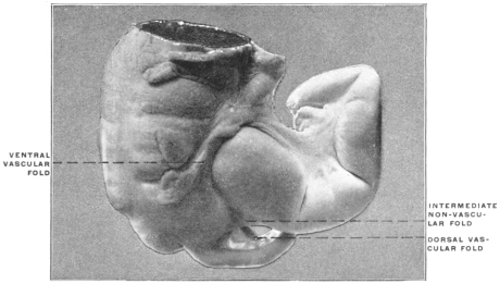 1 In the embryos of reptiles, birds and mammals folds of the somatopleure arise externally to the constricting furrows by means of which the embryo is gradually separated from the yolk-sac, with the resulting formation of the intestinal and abdominal walls. These folds, situated at the head, tail and on the sides, grow upwards and finally meet and unite to form a membranous sac called the amnion. Hence these higher vertebrates (reptiles, birds and mammals) are called Amniota, in contradistinction to fishes and amphibia who have no amnion and are hence known as Anamnia.