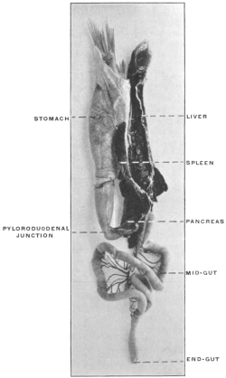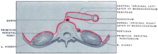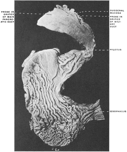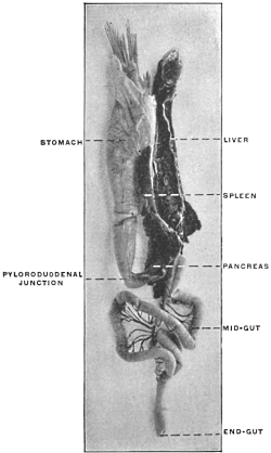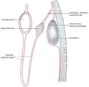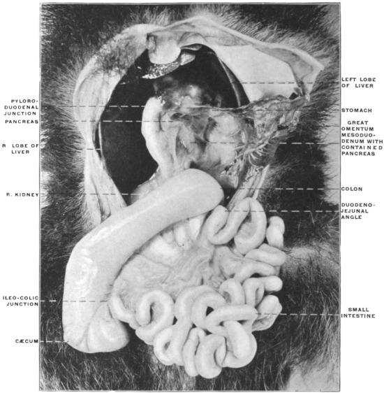 2 The student should not be confused by the fact that a considerable portion of the pancreatic gland in the cat will be found included between the layers of the great omentum, extending over to the left side of the abdomen. This circumstance will be found of importance in studying the development of the dorsal mesogastrium and of the structures connected with it. For the present attention should only be given to the right extremity or head of the pancreas, situated close to the duodenum and included between the layers of the mesoduodenum.