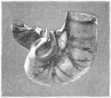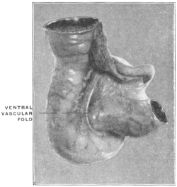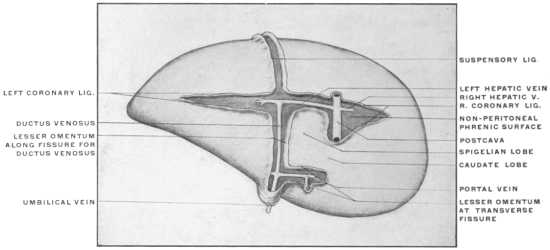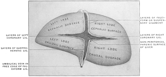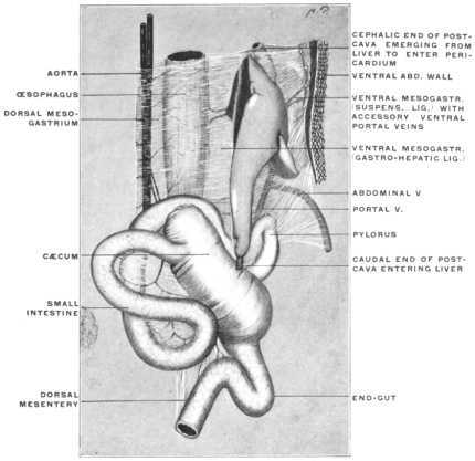 7 It should be remembered that in the final adult arrangement of the abdominal viscera the liver shifts relatively backwards, so that the diaphragmatic attachment, originally directed cephalad, now looks dorsad and forms part of the dorsal or “posterior” surface of the adult organ. The original ventral surface looks cephalad, as well as ventrad, forming the convex surface which in the adult rests in contact with the abdominal wall and diaphragmatic vault, while the surface originally directed dorsad toward the stomach finally in large part has an inclination caudad forming the “inferior” surface of human anatomy.