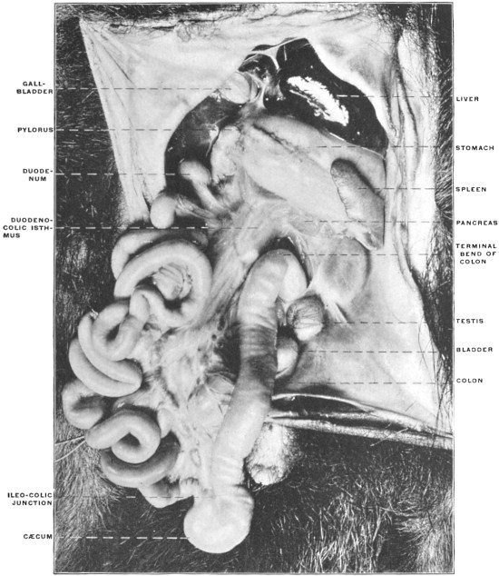 A few spelling typos have been corrected silently (e.g. improtant-->important, mecocolon-->mesocolon) and missing letters have been inserted inside square brackets (e.g. junct[i]on, t[r]ansverse). Some spelling inconsistencies possibly represent contemporarily acceptable spelling alternatives (e.g. coati/coaiti, mesal/mesial, præcava/precava, hyæna/hyena). The term STOMADÆUM is incorrectly spelt as STOMADŒUM in Figs. 27 and 101, and Fig. 250 has an incorrect label on the R. vitelline vein.
