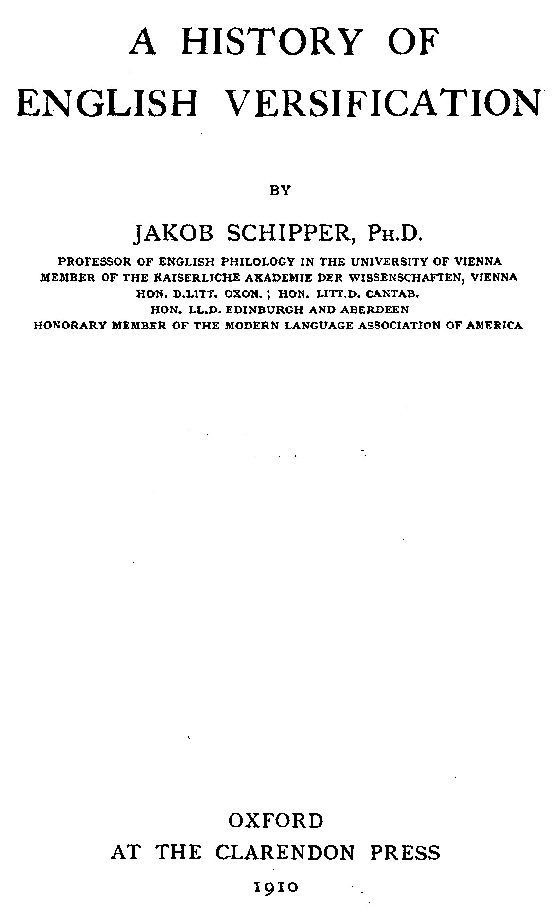 Much livelier, on the other hand, was the demand for an abridged edition of it which appeared under the title Grundriss der englischen Metrik (Wien, 1895). It was therefore found possible, several years after its publication, to make arrangements with the Delegates of the Clarendon Press for an English edition of this smaller book. Unfortunately, however, the printing of the manuscript, which was submitted to the supervision of the late Professor York Powell, was delayed, first by the illness and the untimely death of that eminent scholar, and afterwards by other circumstances which it is not necessary to mention here.