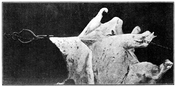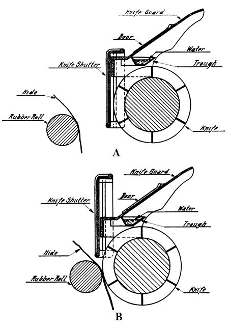 In tanning hides for belting, the shoulders and bellies are cut off and usually dressed for sole or harness leather, leaving the butt, the prime part of the hide, 4-1/2 ft. in length (Fig. 23). The tanned butt is first shaved to level the substance, then washed in a solution 135 of borax, and sumached in the drum. After smoothing the leather in the striking-out machine, it is partially dried ("sammed") and then rubbed on both sides with a dubbin of cod oil and tallow. In this condition the butts are left piled up for a few days, so that the dubbin penetrates the leather, which is then extended with the sleeker (Fig. 32) to make it smooth and to remove surplus grease, which is sold to soap-makers under the currier's name of "moisings." The leather is finally dried, rolled (optional), stretched by machine, and cut up in the width of belting required. Instead of "hand-stuffing" the leather with cod oil and tallow, which is still the best method, a large quantity of butts are now "drum-stuffed," the object being to make use of stearines, which are harder and heavier greases than 136 tallow. The type of drum shown in Figure 35, in which the grease is incorporated with the leather by means of live steam, gives satisfactory results, although hot air apparatus is now replacing the steam injector.