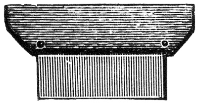 If done by hand, the skins are placed on a sloping glass or slate table, with the flesh side uppermost, which is then stretched out by strong pressure with a tool known as a sleeker, the strokes being made downward in the direction of the hair growth. The flesh side done, the whole skin is turned over and the grain side is similarly treated. Sometimes only the flesh side is struck out, especially if the grain is soft and tender. The sleeker consists of an iron, steel, or copper blade, about 6 in. square, fitted in a wood handle (Fig. 32). The skins are hung up in the drying-room immediately 142 they are extended and smoothed by sleeking, and are then either allowed to dry completely, or, as is generally the case with best leather, they are hung up until a great deal of the moisture is evaporated and the skins are left in a slightly moist, or, as it is generally termed, "sammed" condition. The skins are then taken down, damped in dry parts, folded over, laid in piles to equalise the moisture, and finally smoothed out and stretched again by hand or machine. This second operation after the dyeing is known as "setting."