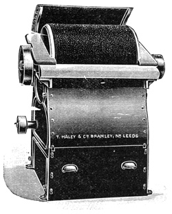 The thoroughly softened leather is then dried, mordanted with a solution of logwood, or haematin crystals, blacked with levant ink, a specially prepared black dye, or with a suitable aniline dye, and dried again. It is finally seasoned with a glutinous or albuminous mixture (blood albumen, milk, and a little aniline black 144 dye make a good mixture), dried, glazed, seasoned a second time, and reglazed. A light coating of mineral oil turns the finish into a jet black, and the leather is ready for the warehouse. There are several types of glazing machines, but the "grasshopper" (so called owing to its action) is the most popular for box calf. This machine is the same as shown in Figure 36, except that the working tool is replaced with a smooth glass or agate roller.