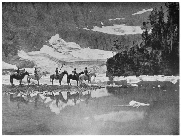 And so, where we once had rude rafts of logs, lashed together with rawhide ropes, we this morning embarked in good boats and went all up the beautiful lake, past Red Eagle, and Little [Pg 212] Chief, and Almost-a-Dog Mountains to the head of the lake, and looking back at the slope of Milk River Ridge saw the far-apart, enormous footprints of Heavy Runner, keeper of the buffalo.