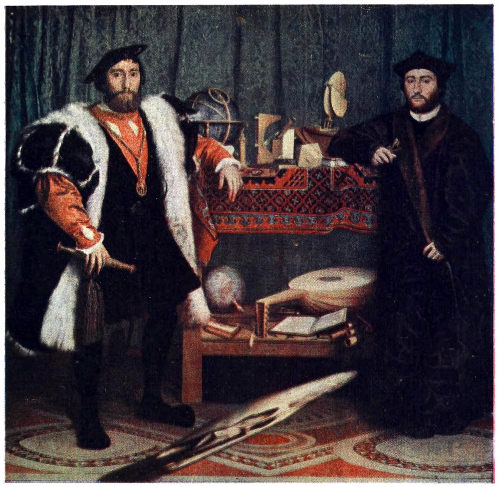 Whether Holbein's work outside the circle of the merchants was the result of his earlier association, or came to him through the intimate connection between the great guild and a certain section of the aristocracy, is a disputed point; but we incline to the belief that the painter's position was fully recognised, and that if work was rather slow in reaching him from the ranks of the men he had known on the occasion of his first visit, the times were to blame. Statesmen and churchmen had been his patrons, now they were fighting for their lives. But very soon after he had painted the portrait of [74] George Gisze, Holbein gave to the world the famous picture known as "The Ambassadors," now hanging in our National Gallery, and reproduced here. The man on the left is generally held to be Sieur Jean de Dinteville, French Ambassador to the Court of Henry VIII., and his companion is said to be George de Selve, who was French Ambassador to the Court of the great Emperor Charles V.