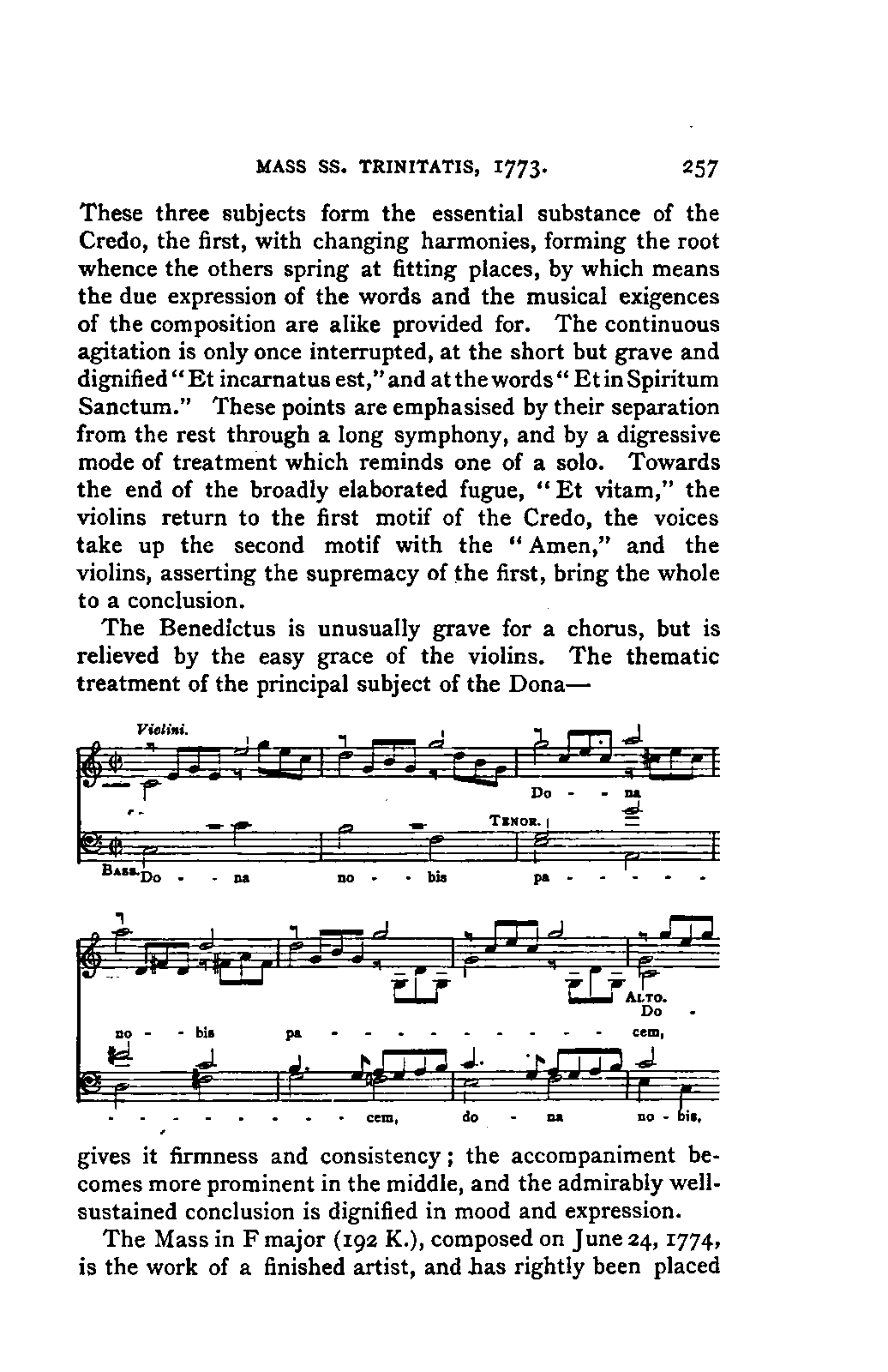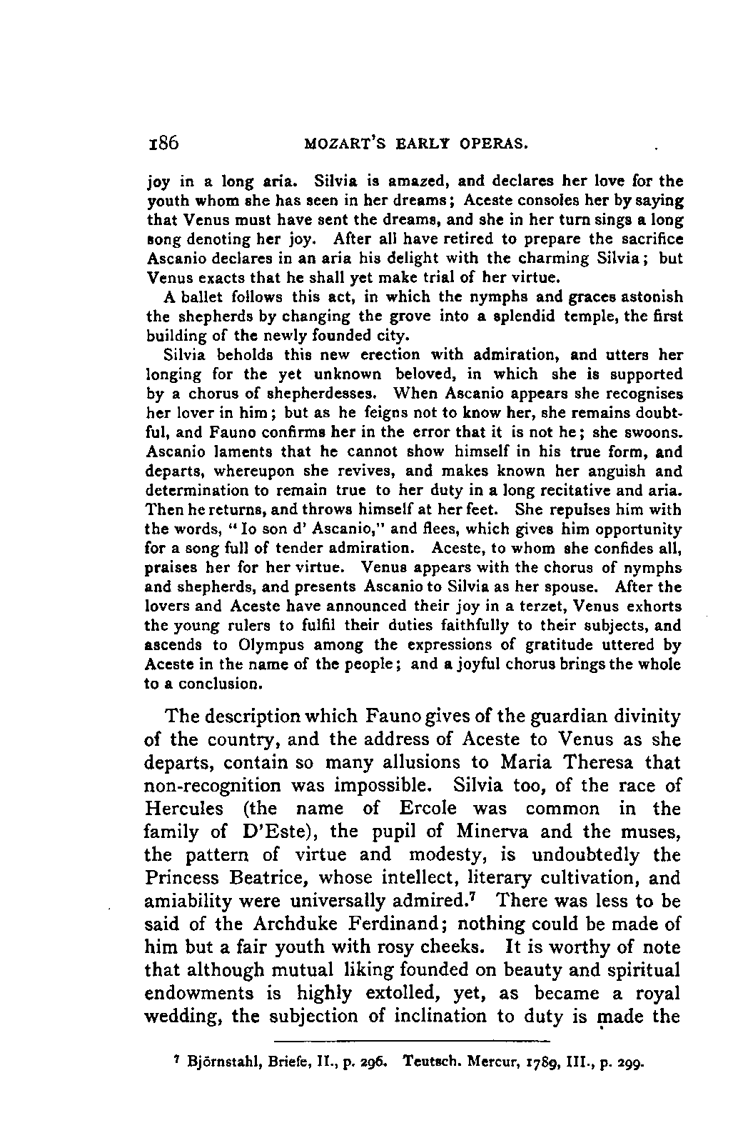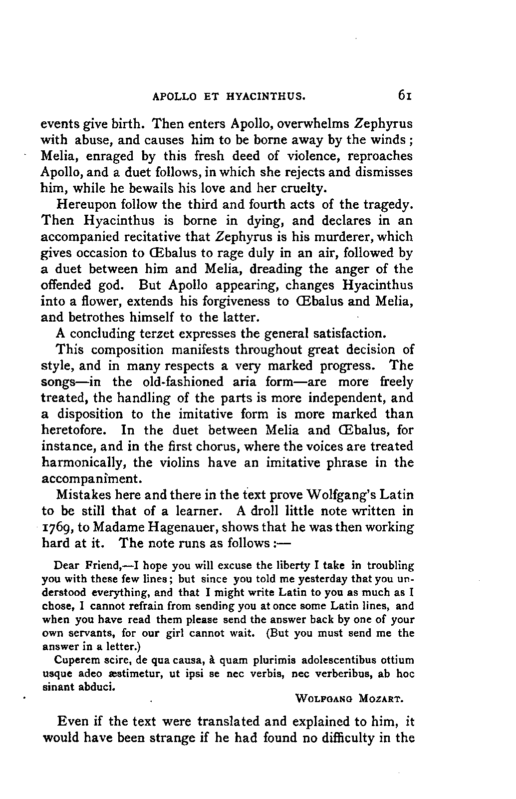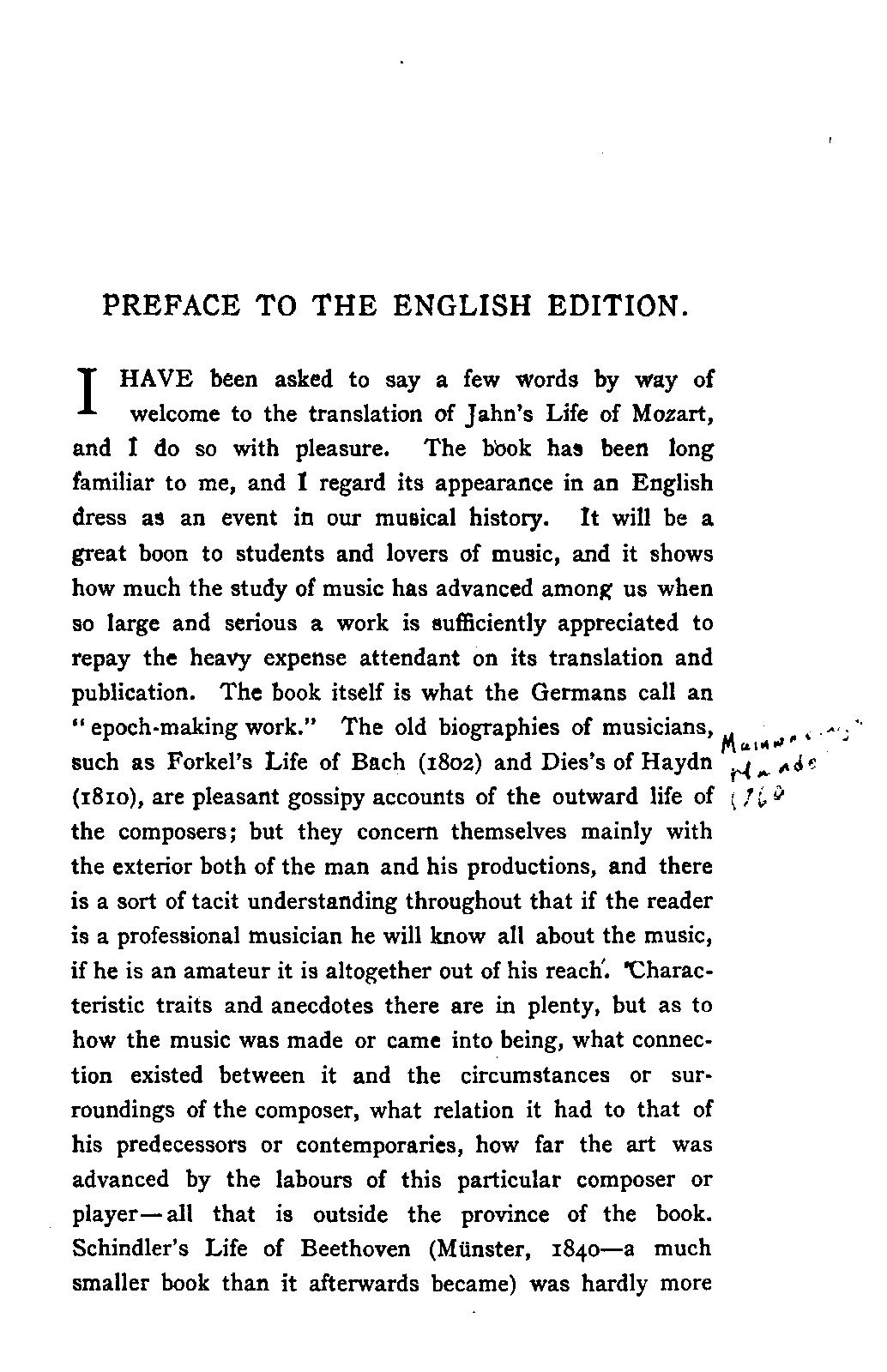 I HAVE been asked to say a few words by way of welcome to the translation of Jahn's Life of Mozart, and I do so with pleasure. The book has been long familiar to me, and I regard its appearance in an English dress as an event in our musical history. It will be a great boon to students and lovers of music, and it shows how much the study of music has advanced among us when so large and serious a work is sufficiently appreciated to repay the heavy expense attendant on its translation and publication. The book itself is what the Germans call an "epoch-making work." The old biographies of musicians, such as Forkel's Life of Bach (1802) and Dies's of Haydn (1810), are pleasant gossipy accounts of the outward life of the composers; but they concern themselves mainly with the exterior both of the man and his productions, and there is a sort of tacit understanding throughout that if the reader is a professional musician he will know all about the music, if he is an amateur it is altogether out of his reach. Characteristic traits and anecdotes there are in plenty, but as to how the music was made or came into being, what connection existed between it and the circumstances or surroundings of the composer, what relation it had to that of his predecessors or contemporaries, how far the art was advanced by the labours of this particular composer or player—all that is outside the province of the book. Schindler's Life of Beethoven (Münster, 1840—a much smaller book than it afterwards became) was hardly more PREFACE. [p3] than this, and in addition is so deformed by want of method and by faults of style as to be very uninviting to the reader. A step in the right direction was taken in Moscheles' English translation (or rather adaptation) of Schindler (1841). Moscheles' residence in London had shown him that there was even then a public outside the professional musician to whom such works would be interesting, and he accordingly took pains, by inserting musical examples and other means, to make his edition attractive to this class. But the inherent defects of the original work prevented more than a moderate success.