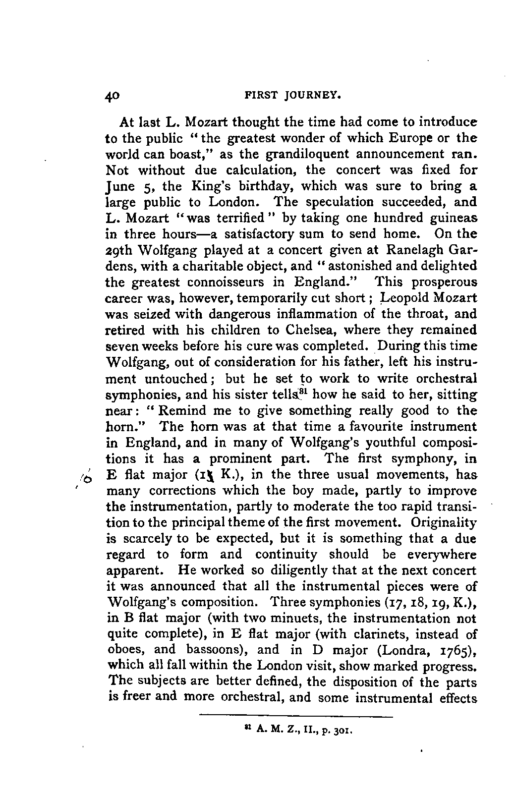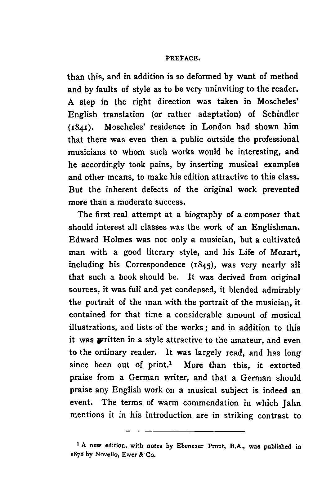 The first real attempt at a biography of a composer that should interest all classes was the work of an Englishman. Edward Holmes was not only a musician, but a cultivated man with a good literary style, and his Life of Mozart, including his Correspondence (1845), was very nearly all that such a book should be. It was derived from original sources, it was full and yet condensed, it blended admirably the portrait of the man with the portrait of the musician, it contained for that time a considerable amount of musical illustrations, and lists of the works; and in addition to this it was written in a style attractive to the amateur, and even to the ordinary reader. It was largely read, and has long since been out of print.* More than this, it extorted praise from a German writer, and that a German should praise any English work on a musical subject is indeed an event. The terms of warm commendation in which Jahn mentions it in his introduction are in striking contrast to