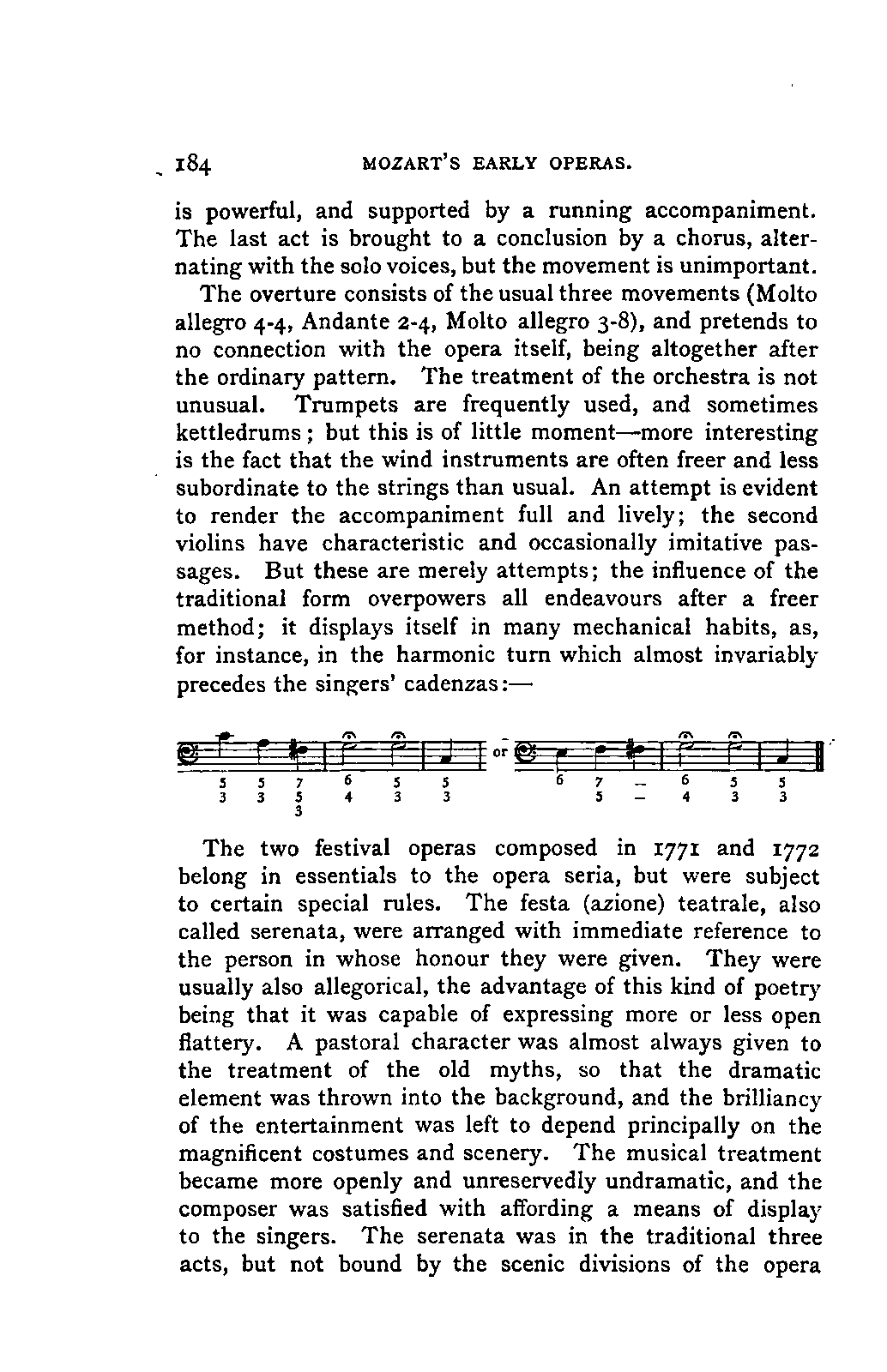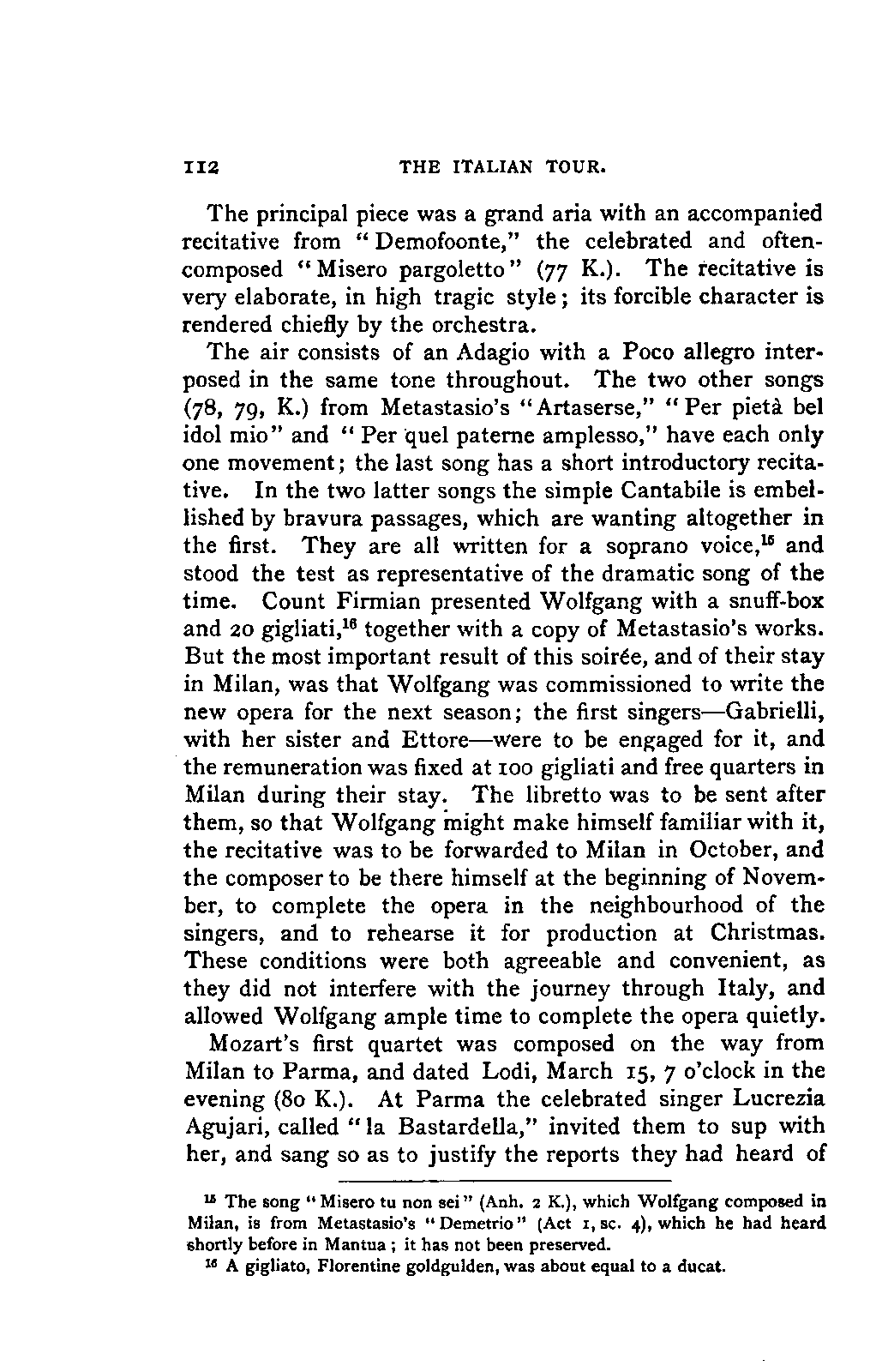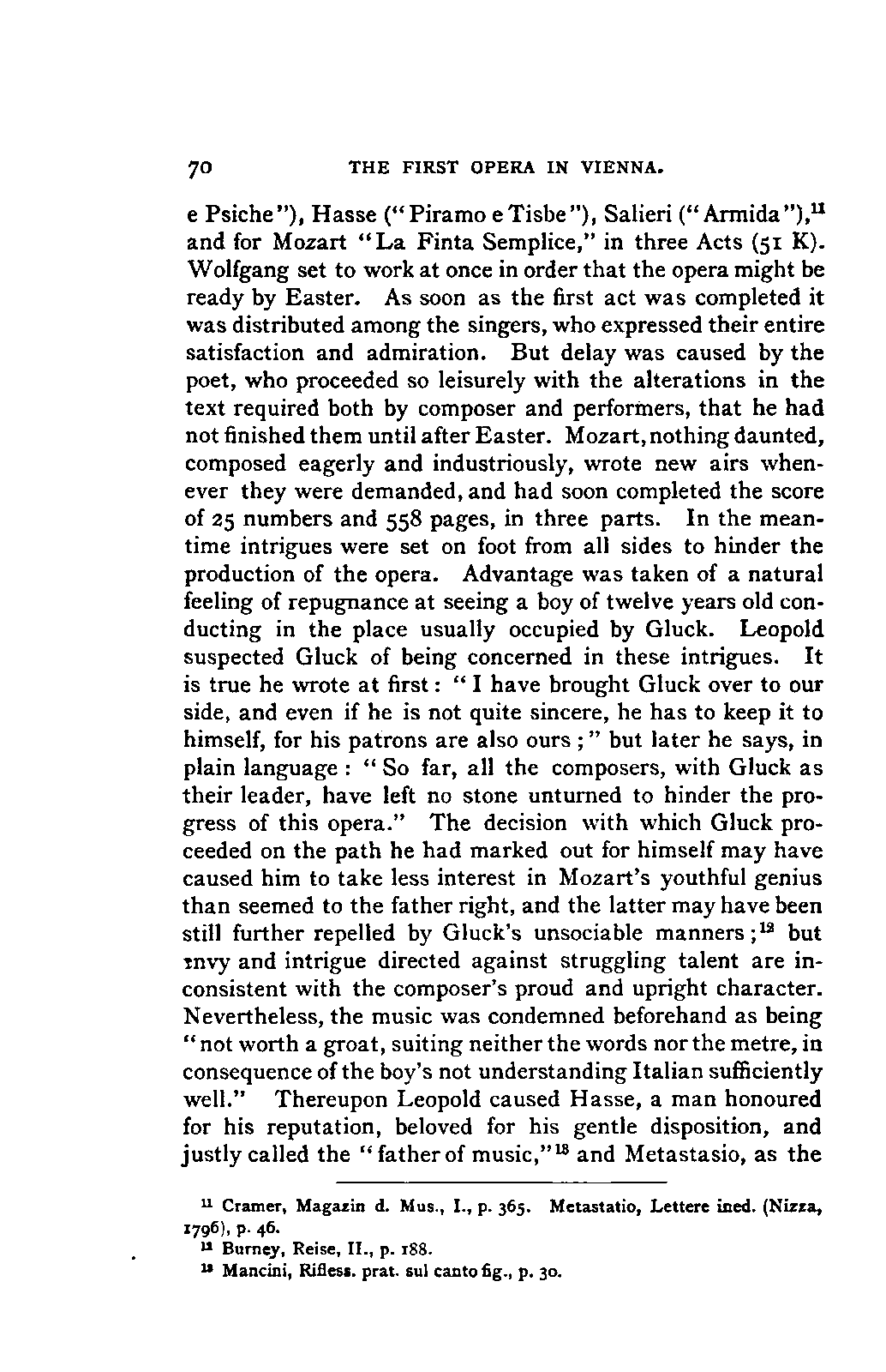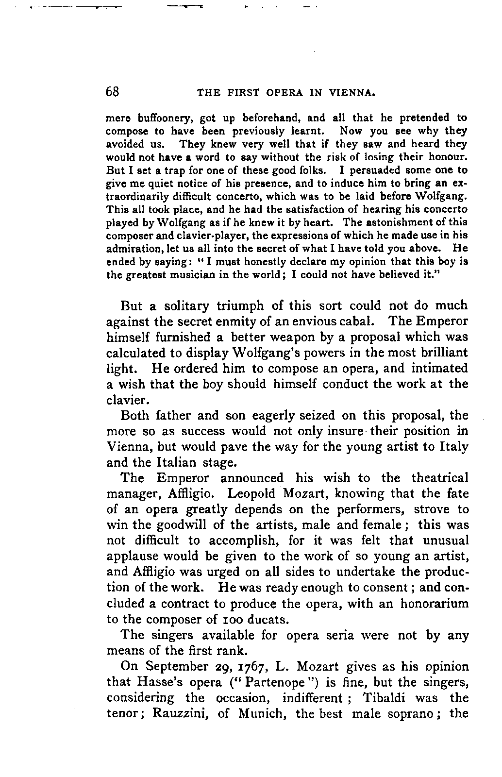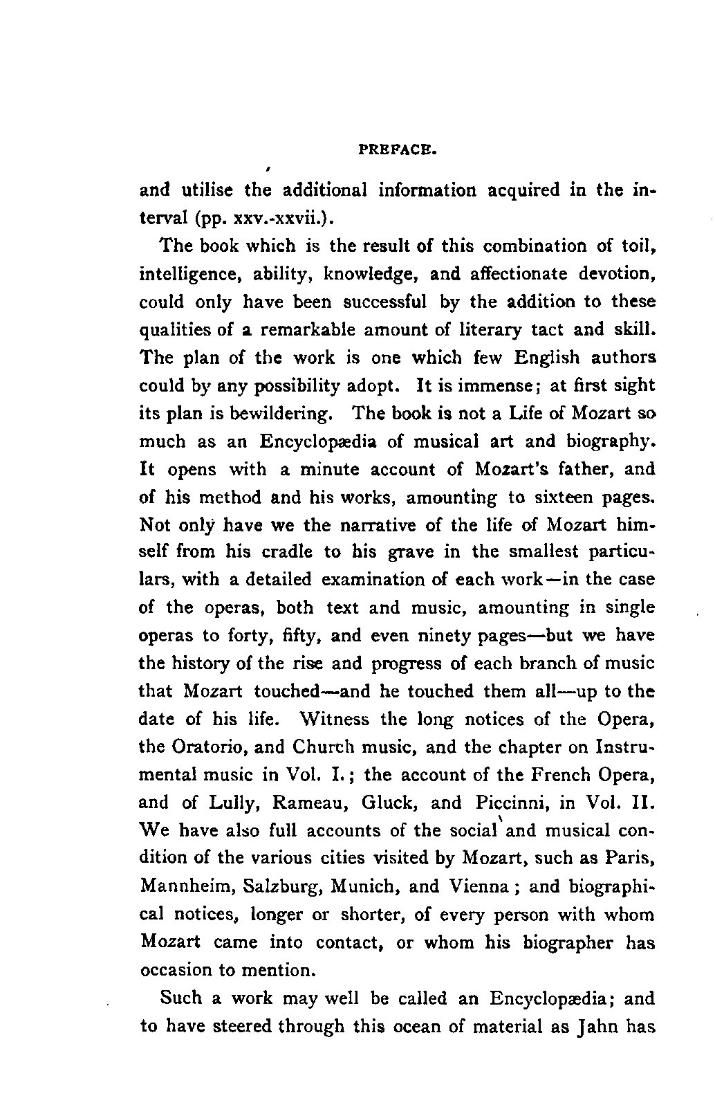 The book which is the result of this combination of toil, intelligence, ability, knowledge, and affectionate devotion, could only have been successful by the addition to these qualities of a remarkable amount of literary tact and skill. The plan of the work is one which few English authors could by any possibility adopt. It is immense; at first sight its plan is bewildering. The book is not a Life of Mozart so much as an Encyclopaedia of musical art and biography. It opens with a minute account of Mozart's father, and of his method and his works, amounting to sixteen pages. Not only have we the narrative of the life of Mozart himself from his cradle to his grave in the smallest particulars, with a detailed examination of each work—in the case of the operas, both text and music, amounting in single operas to forty, fifty, and even ninety pages—but we have the history of the rise and progress of each branch of music that Mozart touched—and he touched them all—up to the date of his life. Witness the long notices of the Opera, the Oratorio, and Church music, and the chapter on Instrumental music in Vol. I.; the account of the French Opera, and of Lully, Rameau, Gluck, and Piccinni, in Vol. II. We have also full accounts of the social and musical condition of the various cities visited by Mozart, such as Paris, Mannheim, Salzburg, Munich, and Vienna; and biographical notices, longer or shorter, of every person with whom Mozart came into contact, or whom his biographer has occasion to mention.