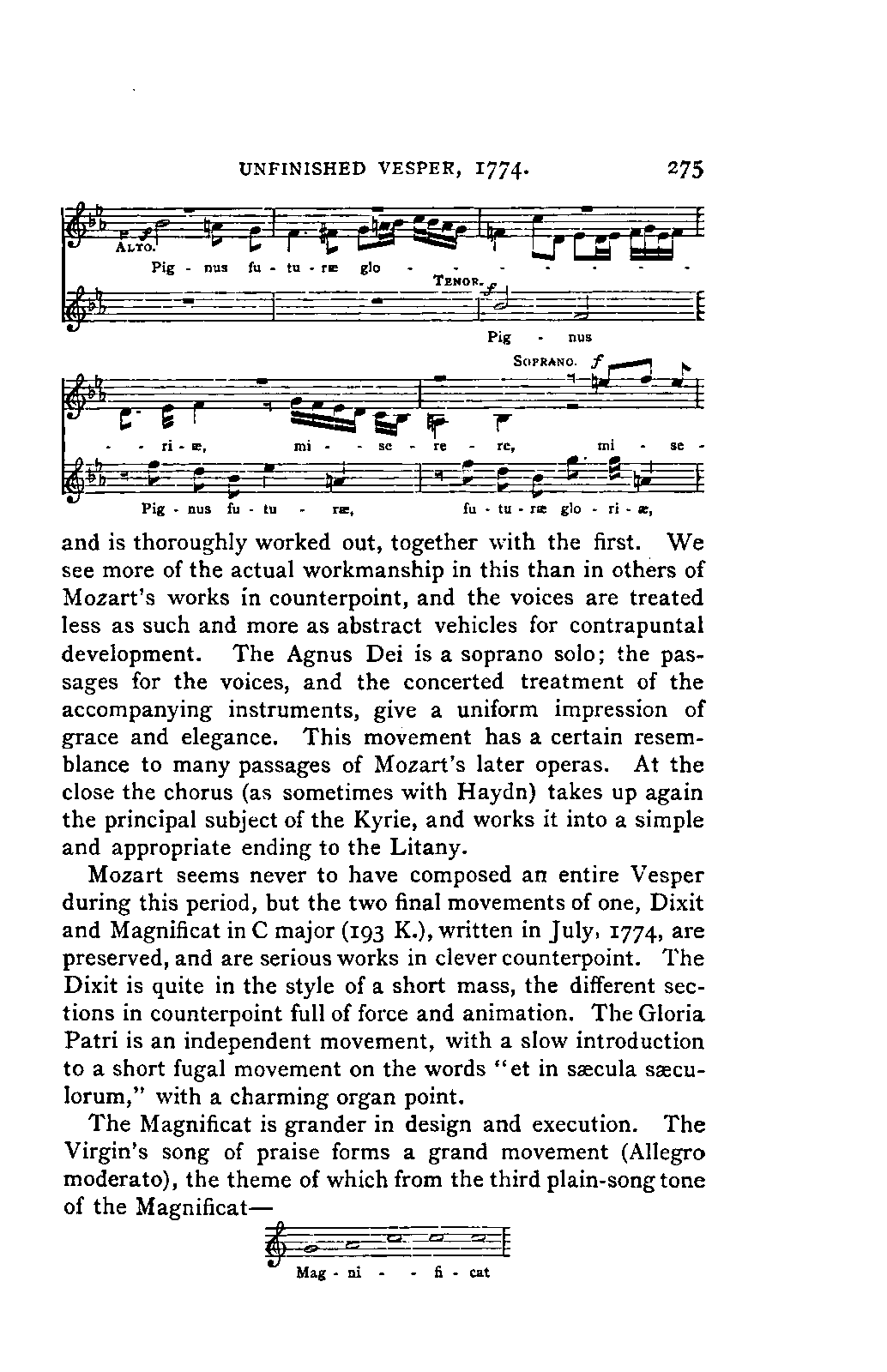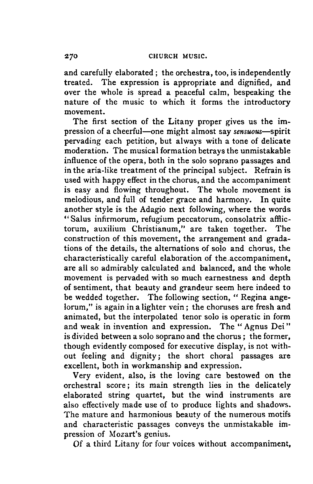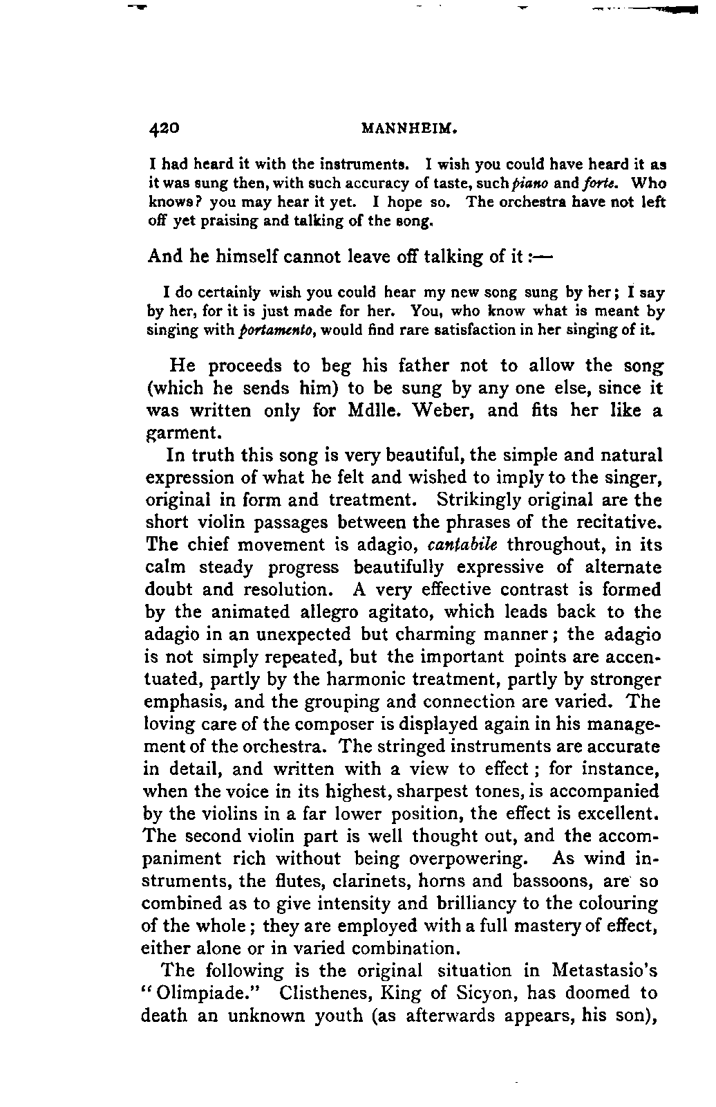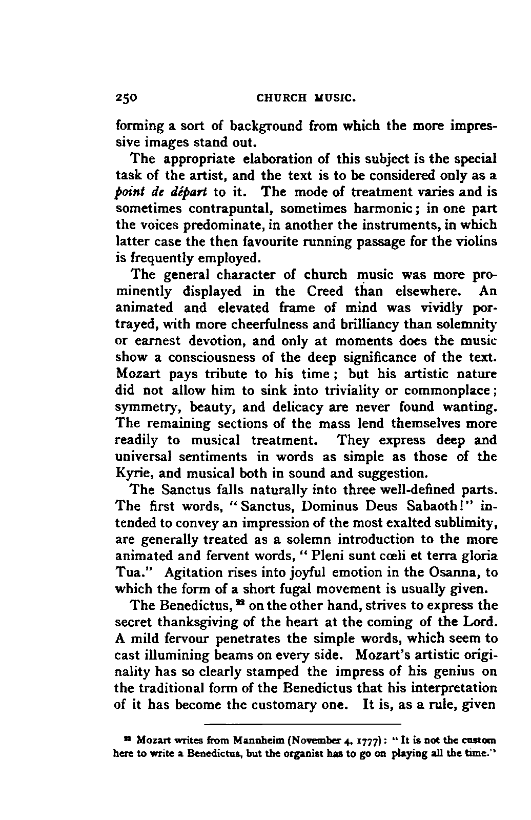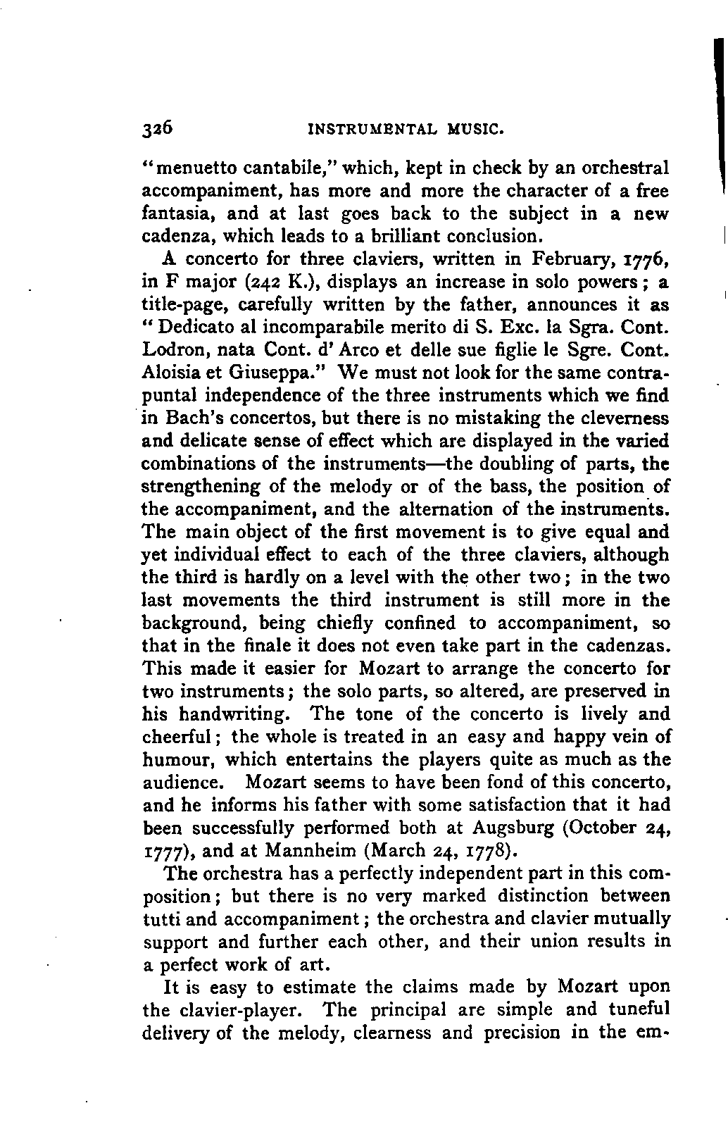 The book which is the result of this combination of toil, intelligence, ability, knowledge, and affectionate devotion, could only have been successful by the addition to these qualities of a remarkable amount of literary tact and skill. The plan of the work is one which few English authors could by any possibility adopt. It is immense; at first sight its plan is bewildering. The book is not a Life of Mozart so much as an Encyclopaedia of musical art and biography. It opens with a minute account of Mozart's father, and of his method and his works, amounting to sixteen pages. Not only have we the narrative of the life of Mozart himself from his cradle to his grave in the smallest particulars, with a detailed examination of each work—in the case of the operas, both text and music, amounting in single operas to forty, fifty, and even ninety pages—but we have the history of the rise and progress of each branch of music that Mozart touched—and he touched them all—up to the date of his life. Witness the long notices of the Opera, the Oratorio, and Church music, and the chapter on Instrumental music in Vol. I.; the account of the French Opera, and of Lully, Rameau, Gluck, and Piccinni, in Vol. II. We have also full accounts of the social and musical condition of the various cities visited by Mozart, such as Paris, Mannheim, Salzburg, Munich, and Vienna; and biographical notices, longer or shorter, of every person with whom Mozart came into contact, or whom his biographer has occasion to mention.