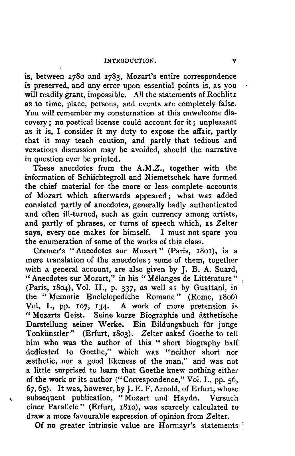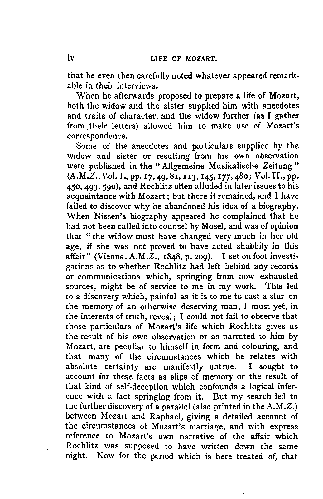 Some of the anecdotes and particulars supplied by the widow and sister or resulting from his own observation were published in the "Allgemeine Musikalische Zeitung" (A.M.Z., Vol. I., pp. 17,49,81,113,145,177,480; Vol. II., pp. 450, 493, 590), and Rochlitz often alluded in later issues to his acquaintance with Mozart; but there it remained, and I have failed to discover why he abandoned his idea of a biography. When Nissen's biography appeared he complained that he had not been called into counsel by Mosel, and was of opinion that "the widow must have changed very much in her old age, if she was not proved to have acted shabbily in this affair" (Vienna, A.M.Z., 1848, p. 209). I set on foot investigations as to whether Rochlitz had left behind any records or communications which, springing from now exhausted sources, might be of service to me in my work. This led to a discovery which, painful as it is to me to cast a slur on the memory of an otherwise deserving man, I must yet, in the interests of truth, reveal; I could not fail to observe that those particulars of Mozart's life which Rochlitz gives as the result of his own observation or as narrated to him by Mozart, are peculiar to himself in form and colouring, and that many of the circumstances which he relates with absolute certainty are manifestly untrue. I sought to account for these facts as slips of memory or the result of that kind of self-deception which confounds a logical inference with a fact springing from it. But my search led to the further discovery of a parallel (also printed in the A.M.Z.) between Mozart and Raphael, giving a detailed account of the circumstances of Mozart's marriage, and with express reference to Mozart's own narrative of the affair which Rochlitz was supposed to have written down the same night. Now for the period which is here treated of, that INTRODUCTION. [v] is, between 1780 and 1783, Mozart's entire correspondence is preserved, and any error upon essential points is, as you will readily grant, impossible. All the statements of Rochlitz as to time, place, persons, and events are completely false. You will remember my consternation at this unwelcome discovery; no poetical license could account for it; unpleasant as it is, I consider it my duty to expose the affair, partly that it may teach caution, and partly that tedious and vexatious discussion may be avoided, should the narrative in question ever be printed.