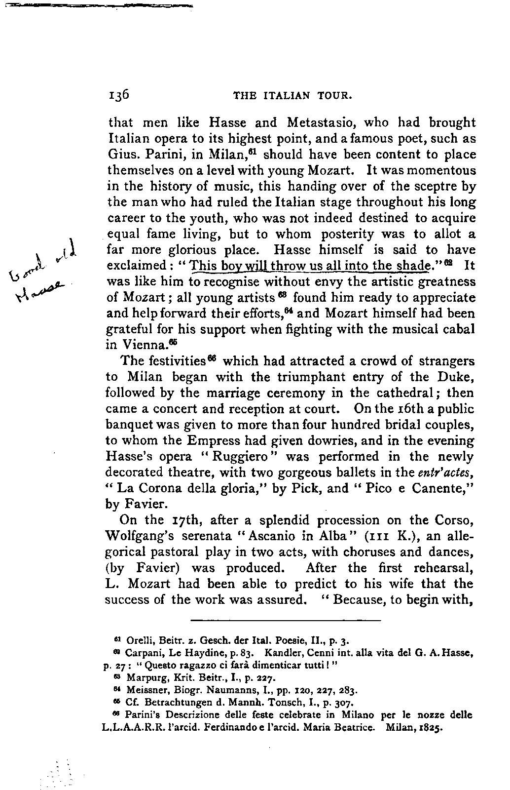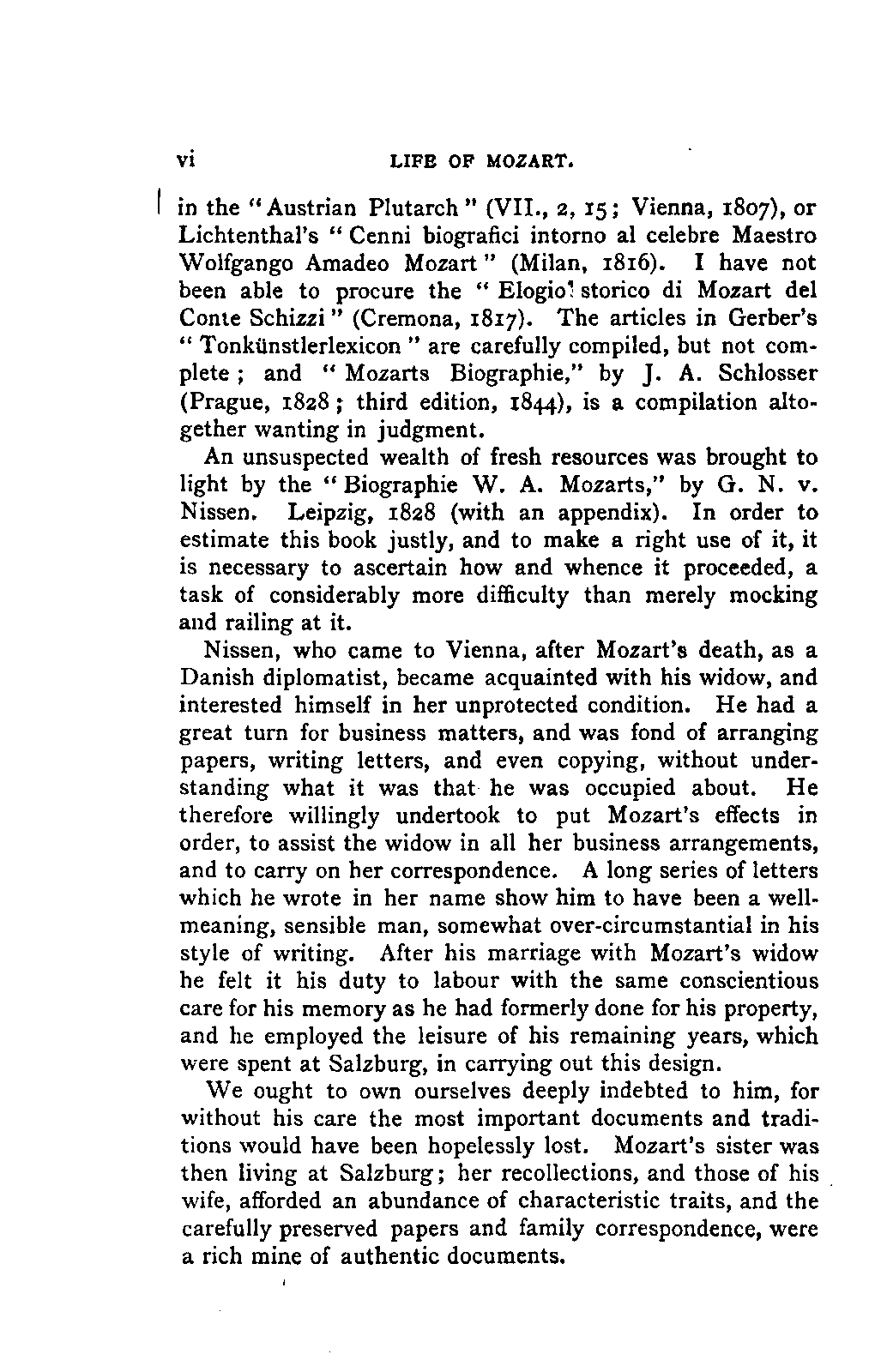 Of no greater intrinsic value are Hormayr's statements: LIFE OF MOZART. [vi] in the "Austrian Plutarch" (VII., 2, 15; Vienna, 1807), or Lichtenthal's "Cenni biografici intorno al celebre Maestro Wolfgango Amadeo Mozart" (Milan, 1816). I have not been able to procure the "Elogio' storico di Mozart del Conte Schizzi" (Cremona, 1817). The articles in Gerber's "Tonkünstlerlexicon" are carefully compiled, but not complete; and "Mozarts Biographie," by J. A. Schlosser (Prague, 1828; third edition, 1844), is a compilation altogether wanting in judgment.