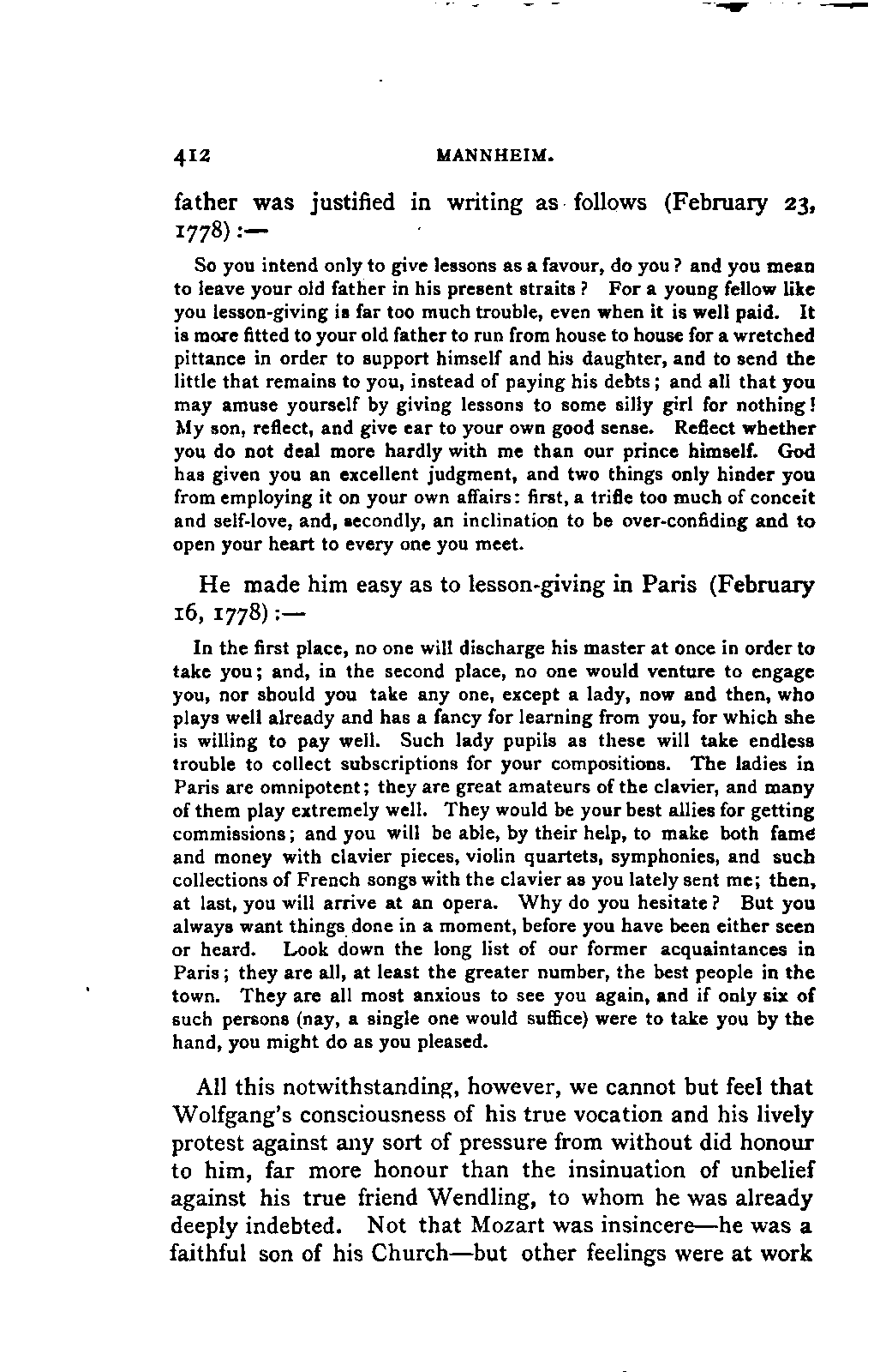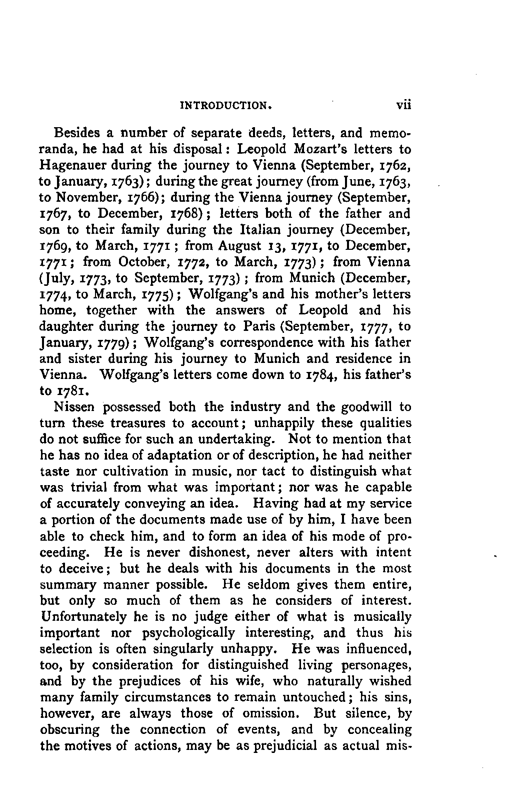 Nissen possessed both the industry and the goodwill to turn these treasures to account; unhappily these qualities do not suffice for such an undertaking. Not to mention that he has no idea of adaptation or of description, he had neither taste nor cultivation in music, nor tact to distinguish what was trivial from what was important; nor was he capable of accurately conveying an idea. Having had at my service a portion of the documents made use of by him, I have been able to check him, and to form an idea of his mode of proceeding. He is never dishonest, never alters with intent to deceive; but he deals with his documents in the most summary manner possible. He seldom gives them entire, but only so much of them as he considers of interest. Unfortunately he is no judge either of what is musically important nor psychologically interesting, and thus his selection is often singularly unhappy. He was influenced, too, by consideration for distinguished living personages, and by the prejudices of his wife, who naturally wished many family circumstances to remain untouched; his sins, however, are always those of omission. But silence, by obscuring the connection of events, and by concealing the motives of actions, may be as prejudicial as actual LIFE OF MOZART. [viii] misstatement to historical accuracy, and the sufferer by a too tender consideration for the feelings of others is invariably the person whose character it is attempted to depict. Fortunately, for the most important years of Mozart's life from 1777 onwards, I have been able myself to make use of the family correspondence; you will see what a different conception I have thereby been enabled to form of this period. It is of less importance, but nevertheless a drawback, that Nissen has thought good to alter the details of style and expression in many of the letters. Neither father nor son were in need of such emendations, both writing clearly and shrewdly, and with an individuality all their own; but even were this not the case, and Nissen the man (which he was not) to correct their defects, such an effacement of individual character would remain altogether inexcusable.