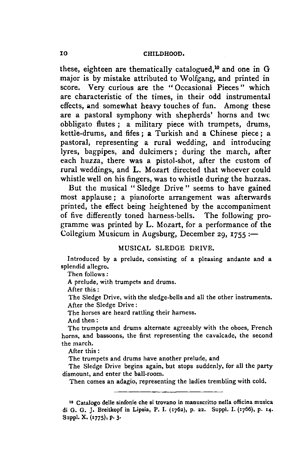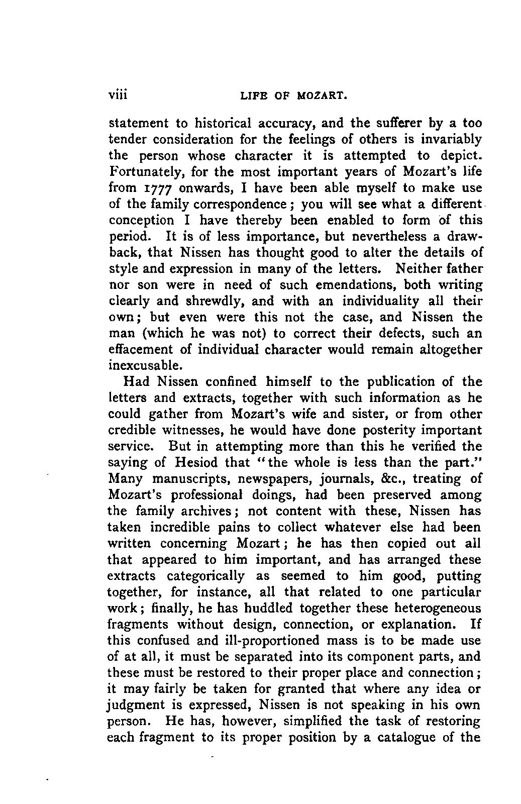 Had Nissen confined himself to the publication of the letters and extracts, together with such information as he could gather from Mozart's wife and sister, or from other credible witnesses, he would have done posterity important service. But in attempting more than this he verified the saying of Hesiod that "the whole is less than the part." Many manuscripts, newspapers, journals, &c., treating of Mozart's professional doings, had been preserved among the family archives; not content with these, Nissen has taken incredible pains to collect whatever else had been written concerning Mozart; he has then copied out all that appeared to him important, and has arranged these extracts categorically as seemed to him good, putting together, for instance, all that related to one particular work; finally, he has huddled together these heterogeneous fragments without design, connection, or explanation. If this confused and ill-proportioned mass is to be made use of at all, it must be separated into its component parts, and these must be restored to their proper place and connection; it may fairly be taken for granted that where any idea or judgment is expressed, Nissen is not speaking in his own person. He has, however, simplified the task of restoring each fragment to its proper position by a catalogue of the INTRODUCTION. [ix] writings in which Mozart is mentioned; and although some documents made use of by him have since disappeared,