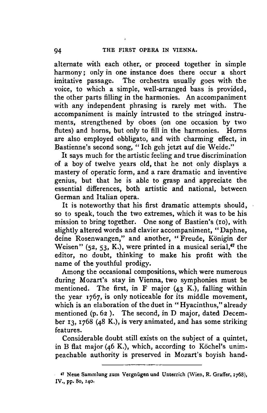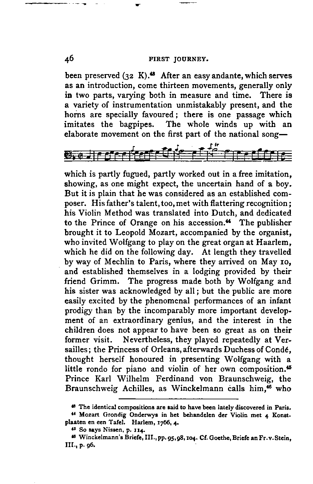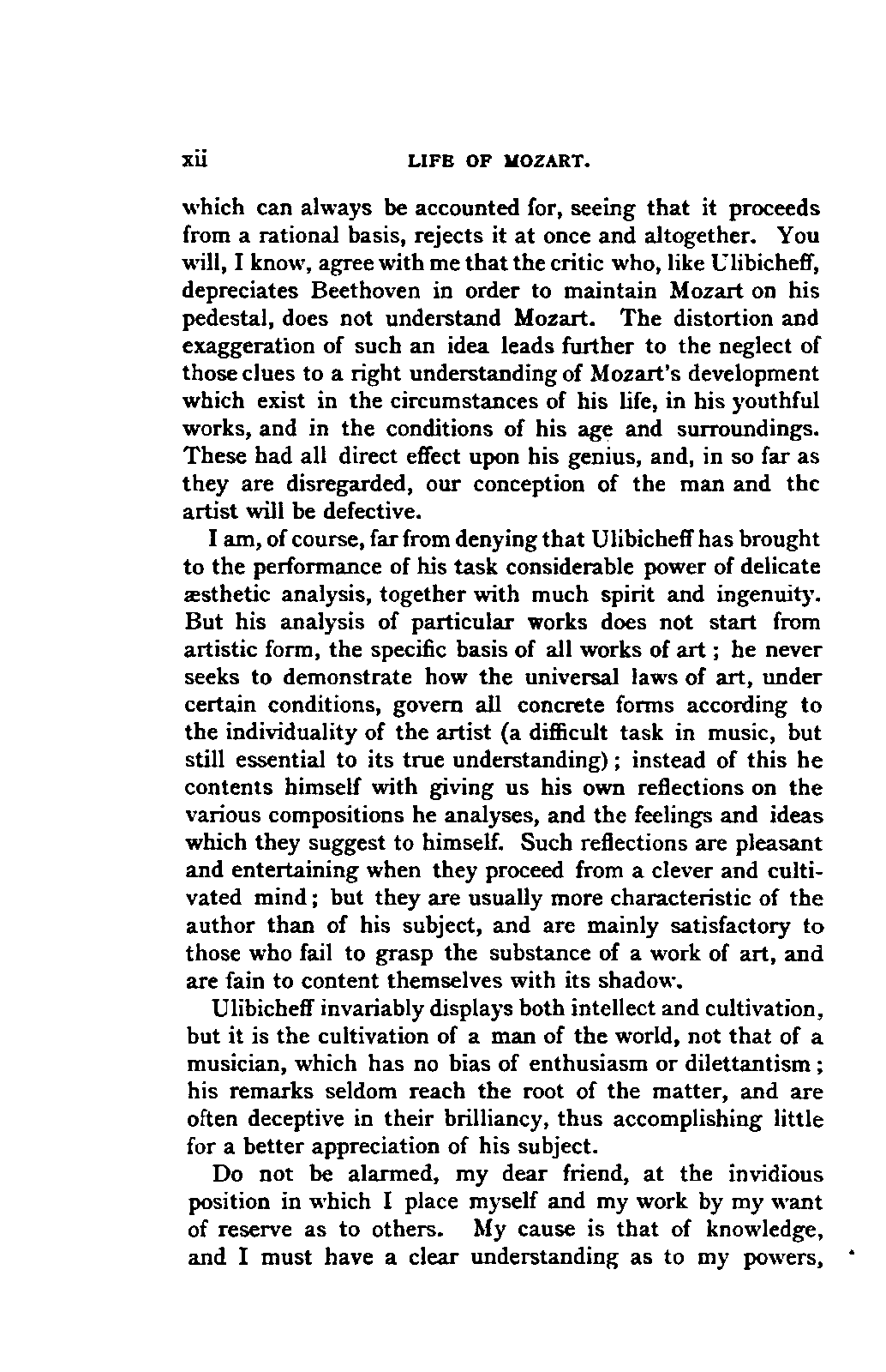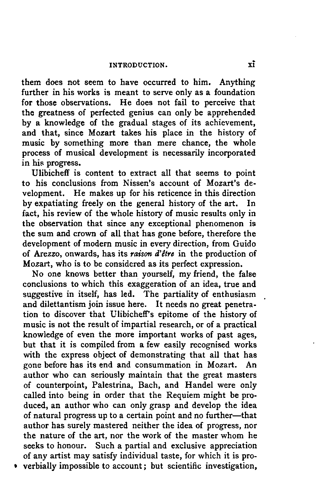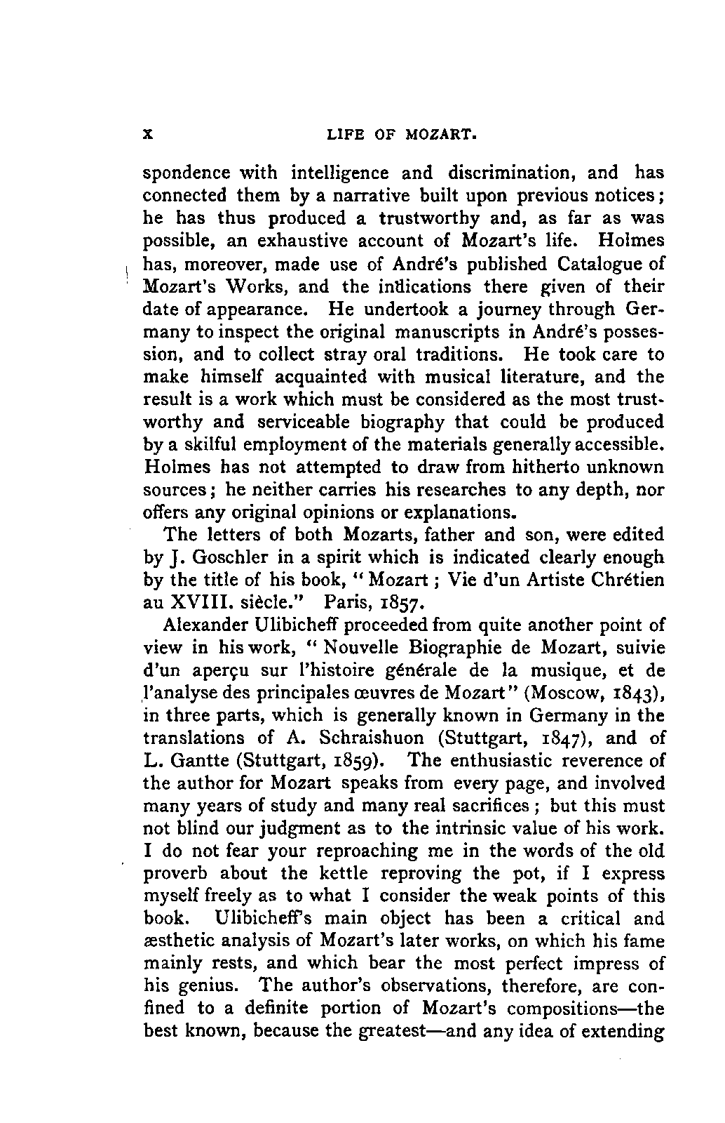 Alexander Ulibichefï proceeded from quite another point of view in his work, "Nouvelle Biographie de Mozart, suivie d'un aperçu sur l'histoire générale de la musique, et de l'analyse des principales ouvres de Mozart" (Moscow, 1843), in three parts, which is generally known in Germany in the translations of A. Schraishuon (Stuttgart, 1847), and of L. Gantte (Stuttgart, 1859). The enthusiastic reverence of the author for Mozart speaks from every page, and involved many years of study and many real sacrifices; but this must not blind our judgment as to the intrinsic value of his work. I do not fear your reproaching me in the words of the old proverb about the kettle reproving the pot, if I express myself freely as to what I consider the weak points of this book. Ulibicheffs main object has been a critical and aesthetic analysis of Mozart's later works, on which his fame mainly rests, and which bear the most perfect impress of his genius. The author's observations, therefore, are confined to a definite portion of Mozart's compositions—the best known, because the greatest—and any idea of extending INTRODUCTION. [xi] them does not seem to have occurred to him. Anything further in his works is meant to serve only as a foundation for those observations. He does not fail to perceive that the greatness of perfected genius can only be apprehended by a knowledge of the gradual stages of its achievement, and that, since Mozart takes his place in the history of music by something more than mere chance, the whole process of musical development is necessarily incorporated in his progress.