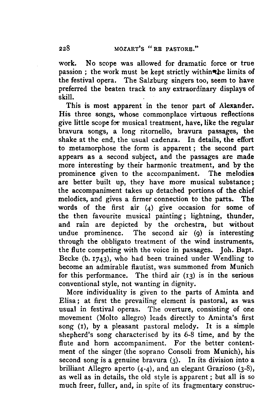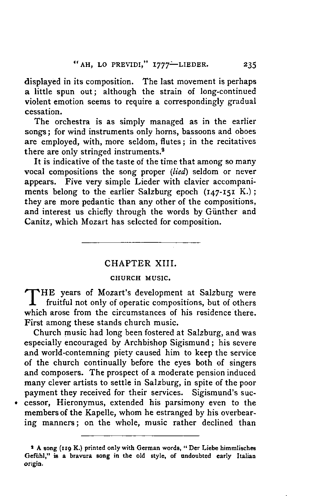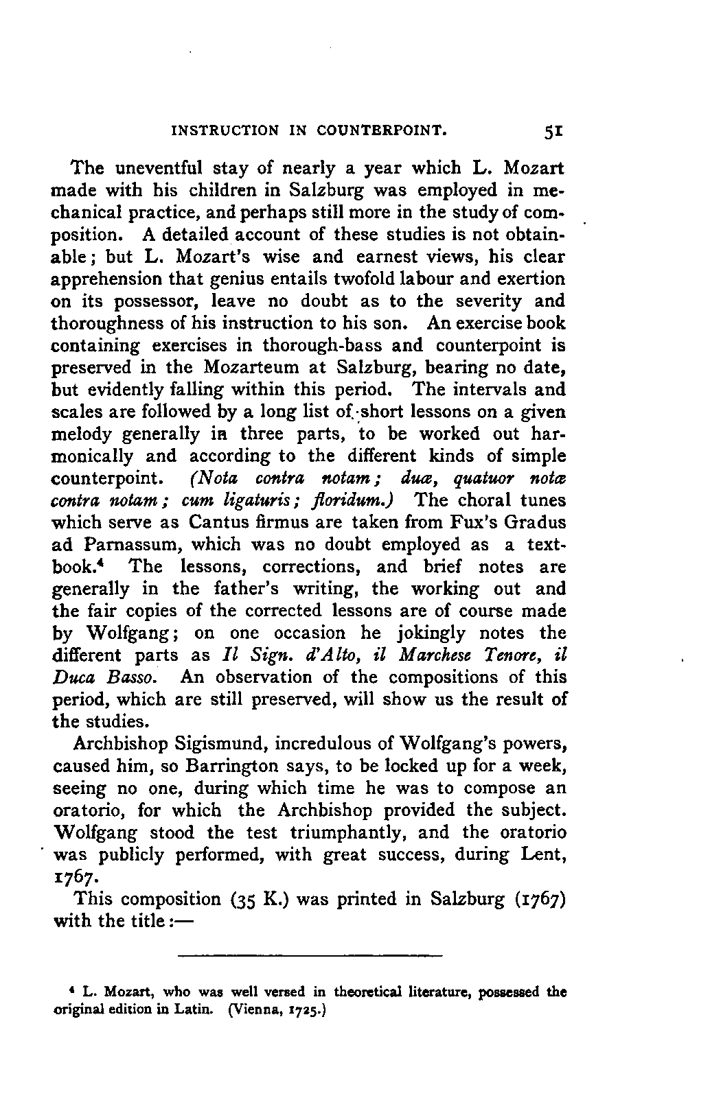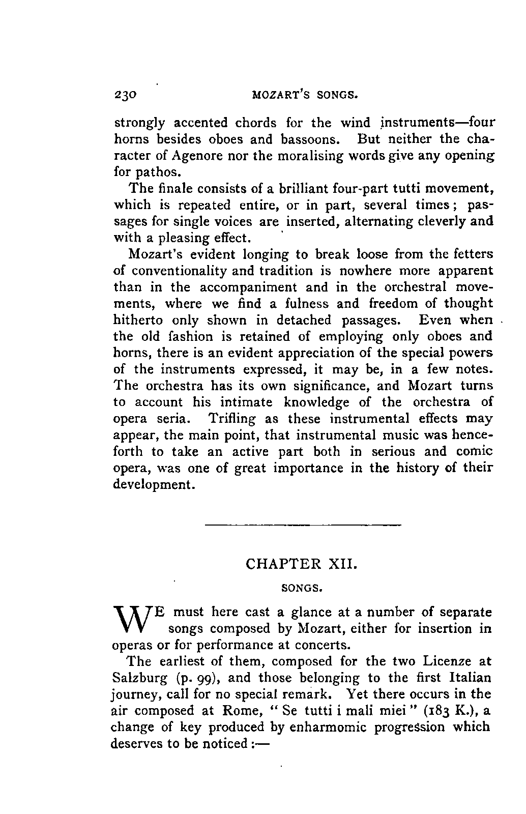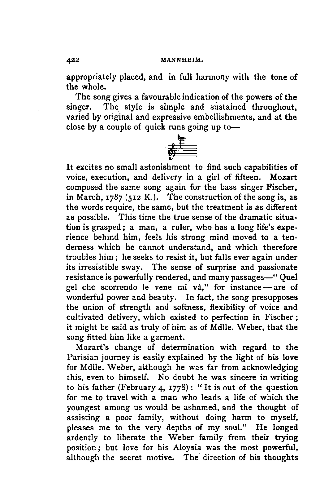 Alexander Ulibichefï proceeded from quite another point of view in his work, "Nouvelle Biographie de Mozart, suivie d'un aperçu sur l'histoire générale de la musique, et de l'analyse des principales ouvres de Mozart" (Moscow, 1843), in three parts, which is generally known in Germany in the translations of A. Schraishuon (Stuttgart, 1847), and of L. Gantte (Stuttgart, 1859). The enthusiastic reverence of the author for Mozart speaks from every page, and involved many years of study and many real sacrifices; but this must not blind our judgment as to the intrinsic value of his work. I do not fear your reproaching me in the words of the old proverb about the kettle reproving the pot, if I express myself freely as to what I consider the weak points of this book. Ulibicheffs main object has been a critical and aesthetic analysis of Mozart's later works, on which his fame mainly rests, and which bear the most perfect impress of his genius. The author's observations, therefore, are confined to a definite portion of Mozart's compositions—the best known, because the greatest—and any idea of extending INTRODUCTION. [xi] them does not seem to have occurred to him. Anything further in his works is meant to serve only as a foundation for those observations. He does not fail to perceive that the greatness of perfected genius can only be apprehended by a knowledge of the gradual stages of its achievement, and that, since Mozart takes his place in the history of music by something more than mere chance, the whole process of musical development is necessarily incorporated in his progress.