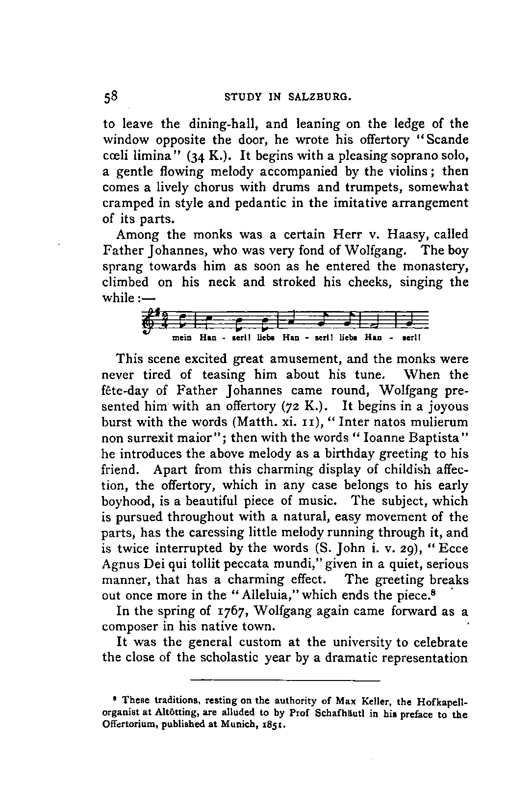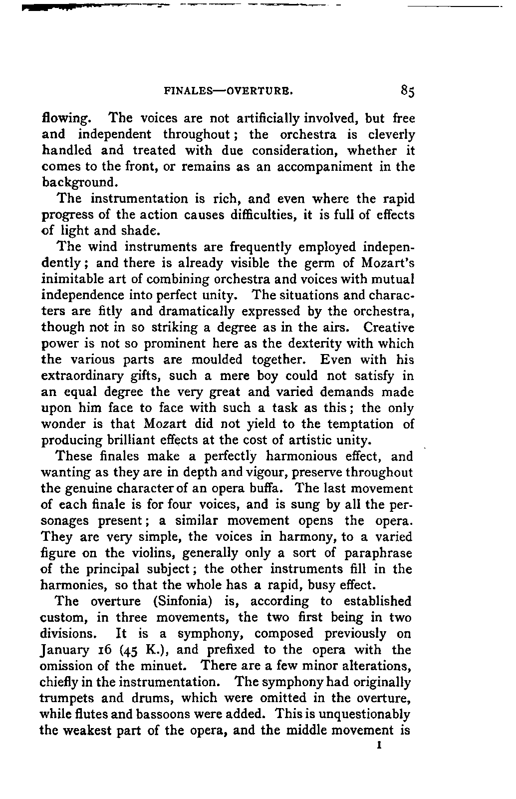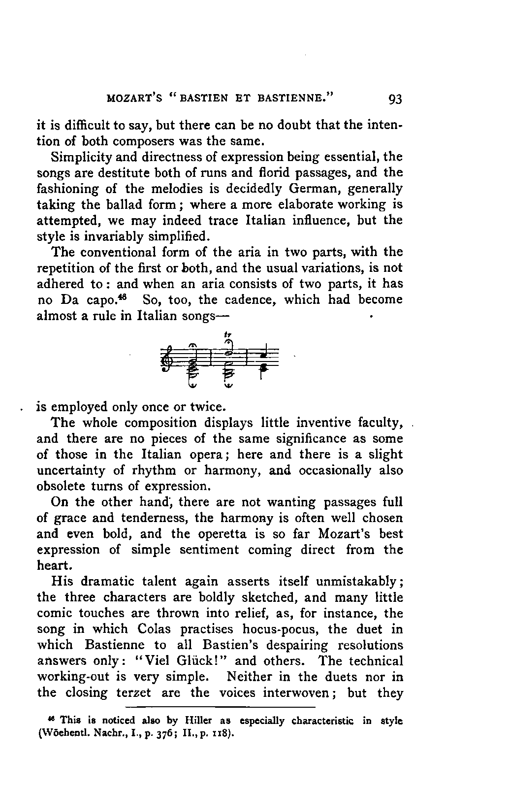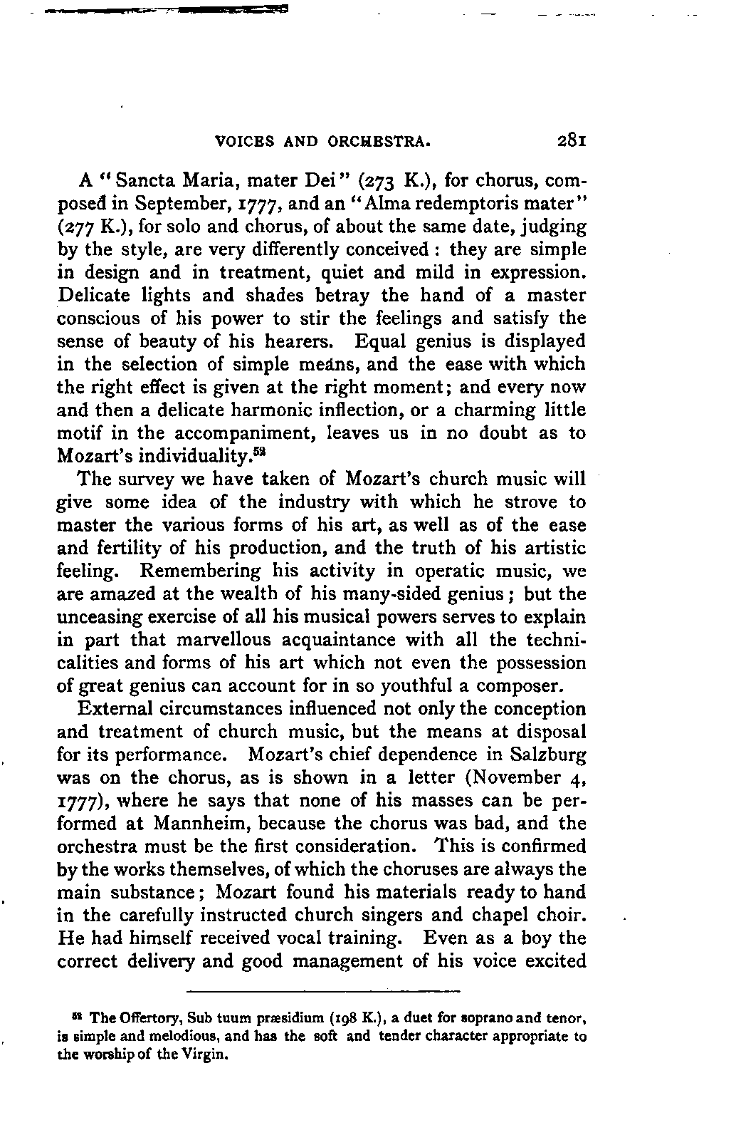 Alexander Ulibichefï proceeded from quite another point of view in his work, "Nouvelle Biographie de Mozart, suivie d'un aperçu sur l'histoire générale de la musique, et de l'analyse des principales ouvres de Mozart" (Moscow, 1843), in three parts, which is generally known in Germany in the translations of A. Schraishuon (Stuttgart, 1847), and of L. Gantte (Stuttgart, 1859). The enthusiastic reverence of the author for Mozart speaks from every page, and involved many years of study and many real sacrifices; but this must not blind our judgment as to the intrinsic value of his work. I do not fear your reproaching me in the words of the old proverb about the kettle reproving the pot, if I express myself freely as to what I consider the weak points of this book. Ulibicheffs main object has been a critical and aesthetic analysis of Mozart's later works, on which his fame mainly rests, and which bear the most perfect impress of his genius. The author's observations, therefore, are confined to a definite portion of Mozart's compositions—the best known, because the greatest—and any idea of extending INTRODUCTION. [xi] them does not seem to have occurred to him. Anything further in his works is meant to serve only as a foundation for those observations. He does not fail to perceive that the greatness of perfected genius can only be apprehended by a knowledge of the gradual stages of its achievement, and that, since Mozart takes his place in the history of music by something more than mere chance, the whole process of musical development is necessarily incorporated in his progress.