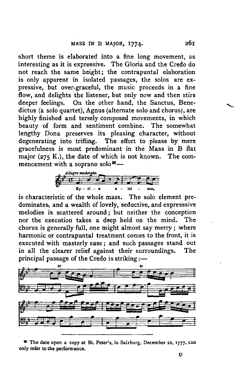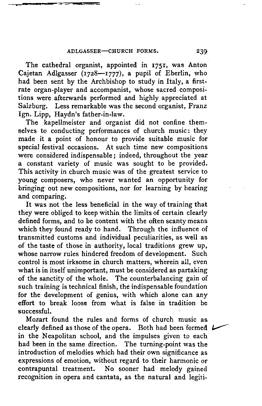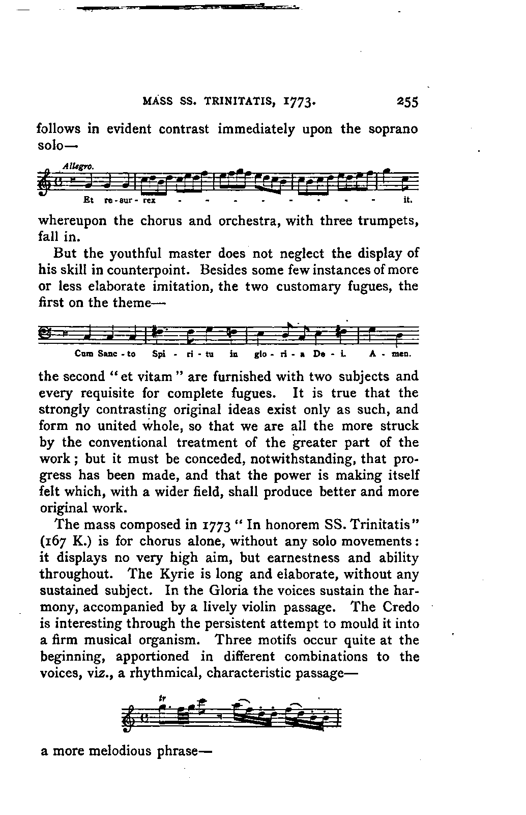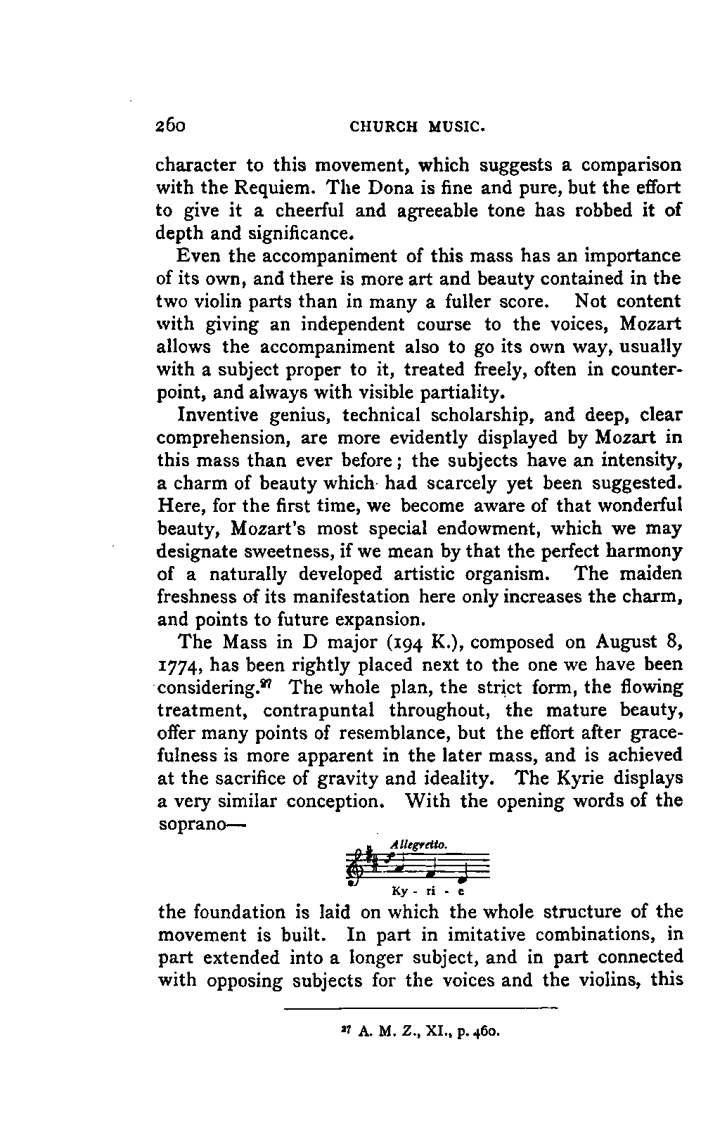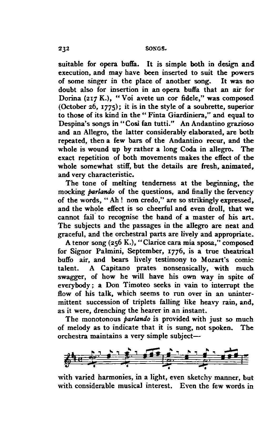 Alexander Ulibichefï proceeded from quite another point of view in his work, "Nouvelle Biographie de Mozart, suivie d'un aperçu sur l'histoire générale de la musique, et de l'analyse des principales ouvres de Mozart" (Moscow, 1843), in three parts, which is generally known in Germany in the translations of A. Schraishuon (Stuttgart, 1847), and of L. Gantte (Stuttgart, 1859). The enthusiastic reverence of the author for Mozart speaks from every page, and involved many years of study and many real sacrifices; but this must not blind our judgment as to the intrinsic value of his work. I do not fear your reproaching me in the words of the old proverb about the kettle reproving the pot, if I express myself freely as to what I consider the weak points of this book. Ulibicheffs main object has been a critical and aesthetic analysis of Mozart's later works, on which his fame mainly rests, and which bear the most perfect impress of his genius. The author's observations, therefore, are confined to a definite portion of Mozart's compositions—the best known, because the greatest—and any idea of extending INTRODUCTION. [xi] them does not seem to have occurred to him. Anything further in his works is meant to serve only as a foundation for those observations. He does not fail to perceive that the greatness of perfected genius can only be apprehended by a knowledge of the gradual stages of its achievement, and that, since Mozart takes his place in the history of music by something more than mere chance, the whole process of musical development is necessarily incorporated in his progress.