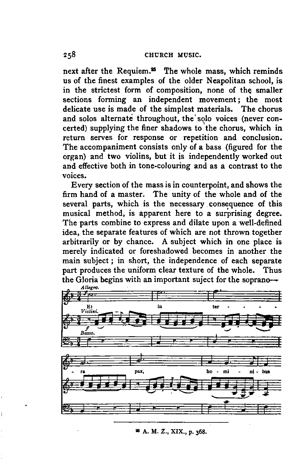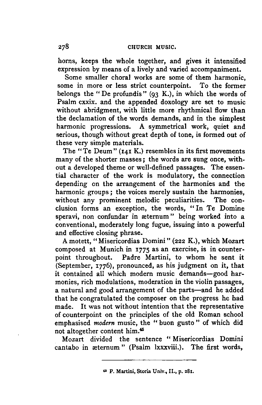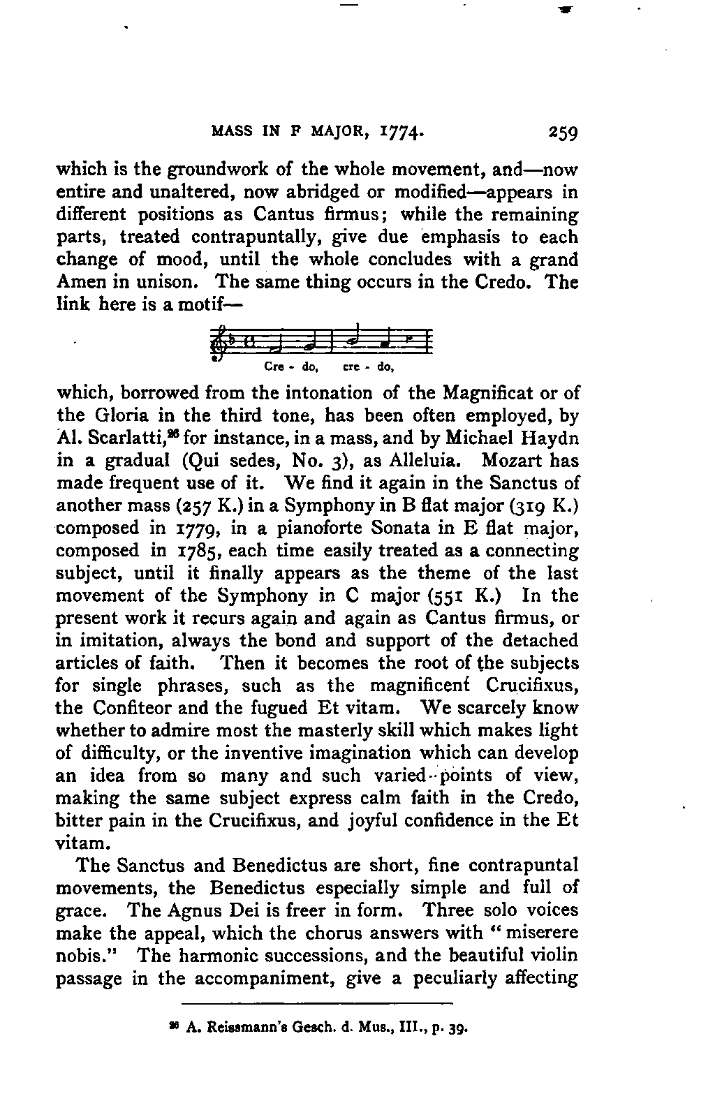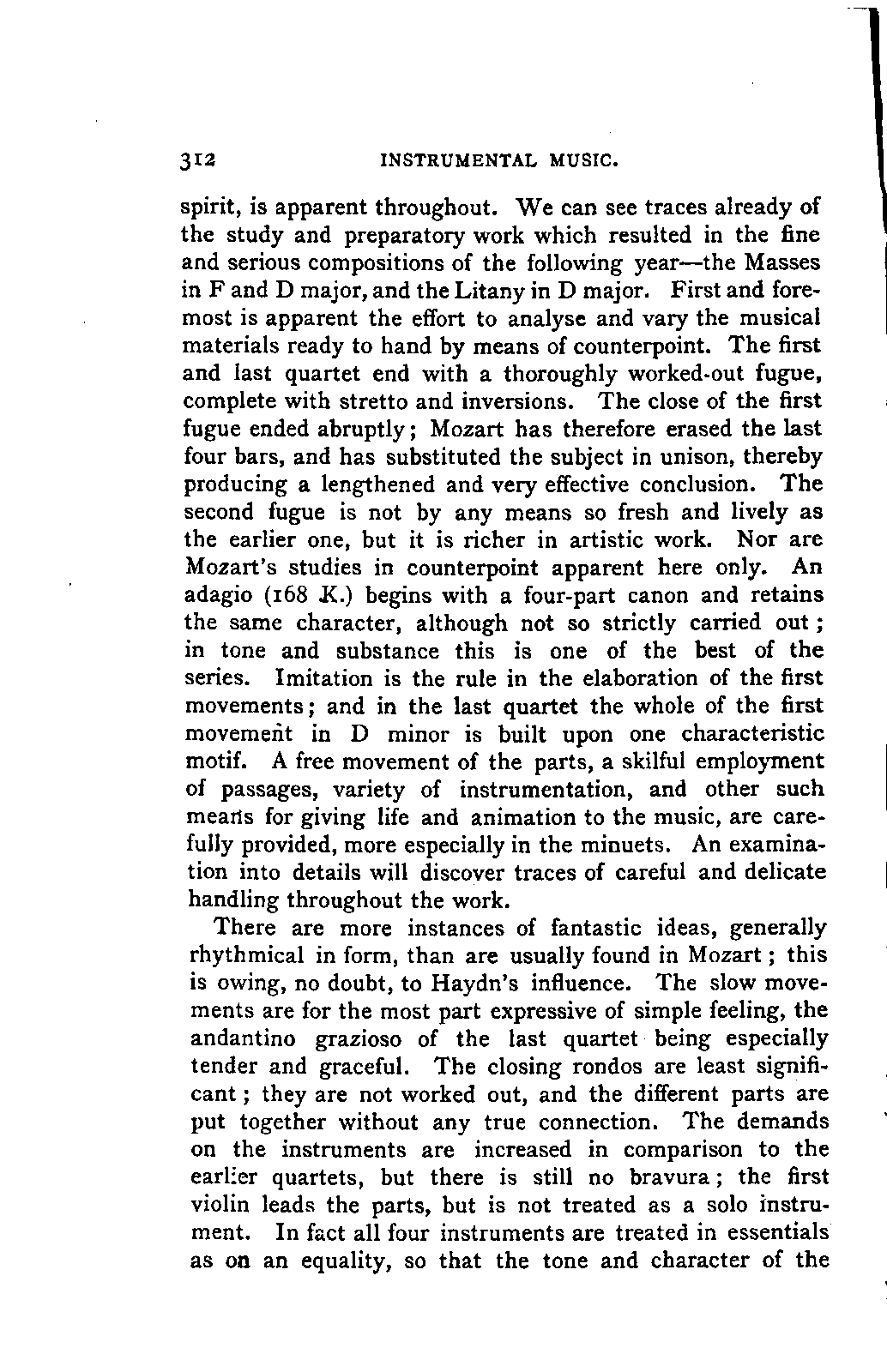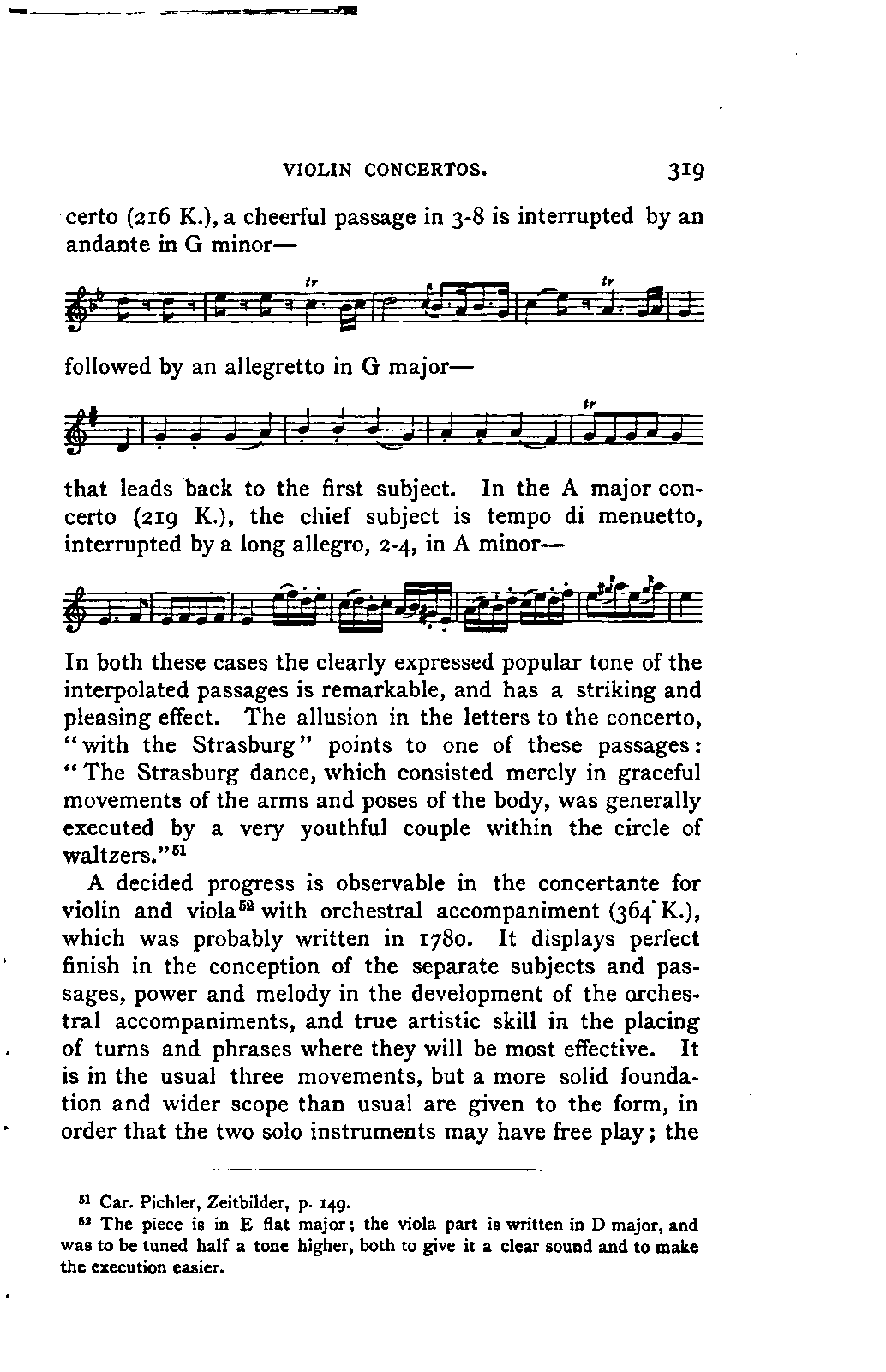 Alexander Ulibichefï proceeded from quite another point of view in his work, "Nouvelle Biographie de Mozart, suivie d'un aperçu sur l'histoire générale de la musique, et de l'analyse des principales ouvres de Mozart" (Moscow, 1843), in three parts, which is generally known in Germany in the translations of A. Schraishuon (Stuttgart, 1847), and of L. Gantte (Stuttgart, 1859). The enthusiastic reverence of the author for Mozart speaks from every page, and involved many years of study and many real sacrifices; but this must not blind our judgment as to the intrinsic value of his work. I do not fear your reproaching me in the words of the old proverb about the kettle reproving the pot, if I express myself freely as to what I consider the weak points of this book. Ulibicheffs main object has been a critical and aesthetic analysis of Mozart's later works, on which his fame mainly rests, and which bear the most perfect impress of his genius. The author's observations, therefore, are confined to a definite portion of Mozart's compositions—the best known, because the greatest—and any idea of extending INTRODUCTION. [xi] them does not seem to have occurred to him. Anything further in his works is meant to serve only as a foundation for those observations. He does not fail to perceive that the greatness of perfected genius can only be apprehended by a knowledge of the gradual stages of its achievement, and that, since Mozart takes his place in the history of music by something more than mere chance, the whole process of musical development is necessarily incorporated in his progress.