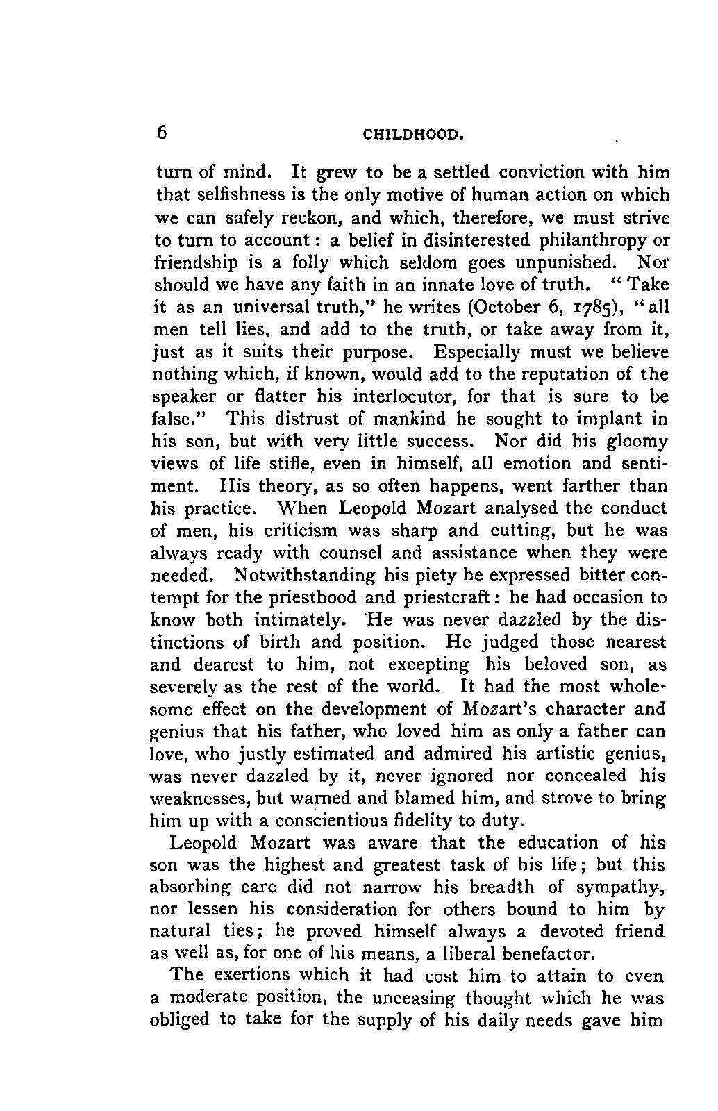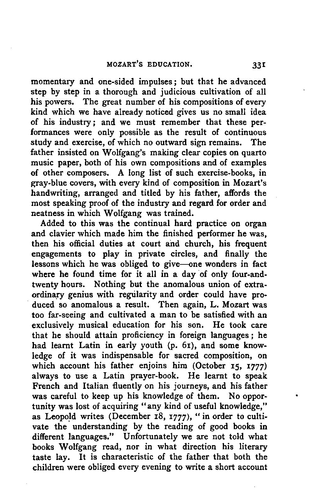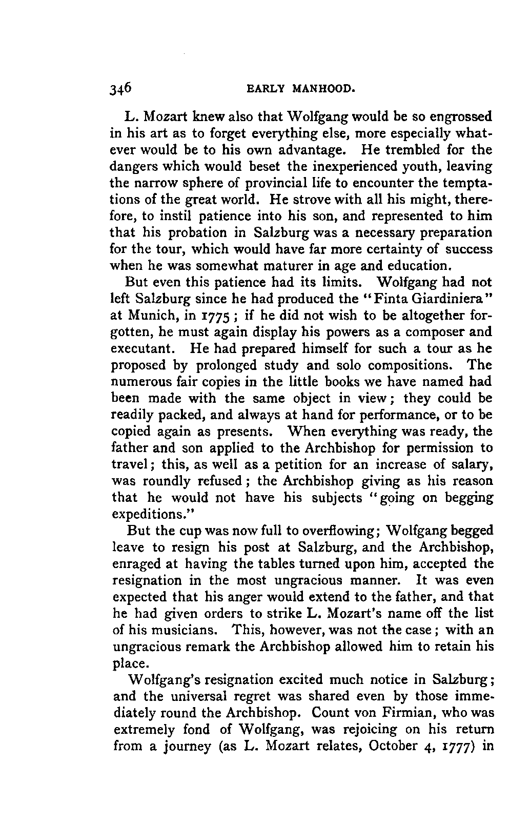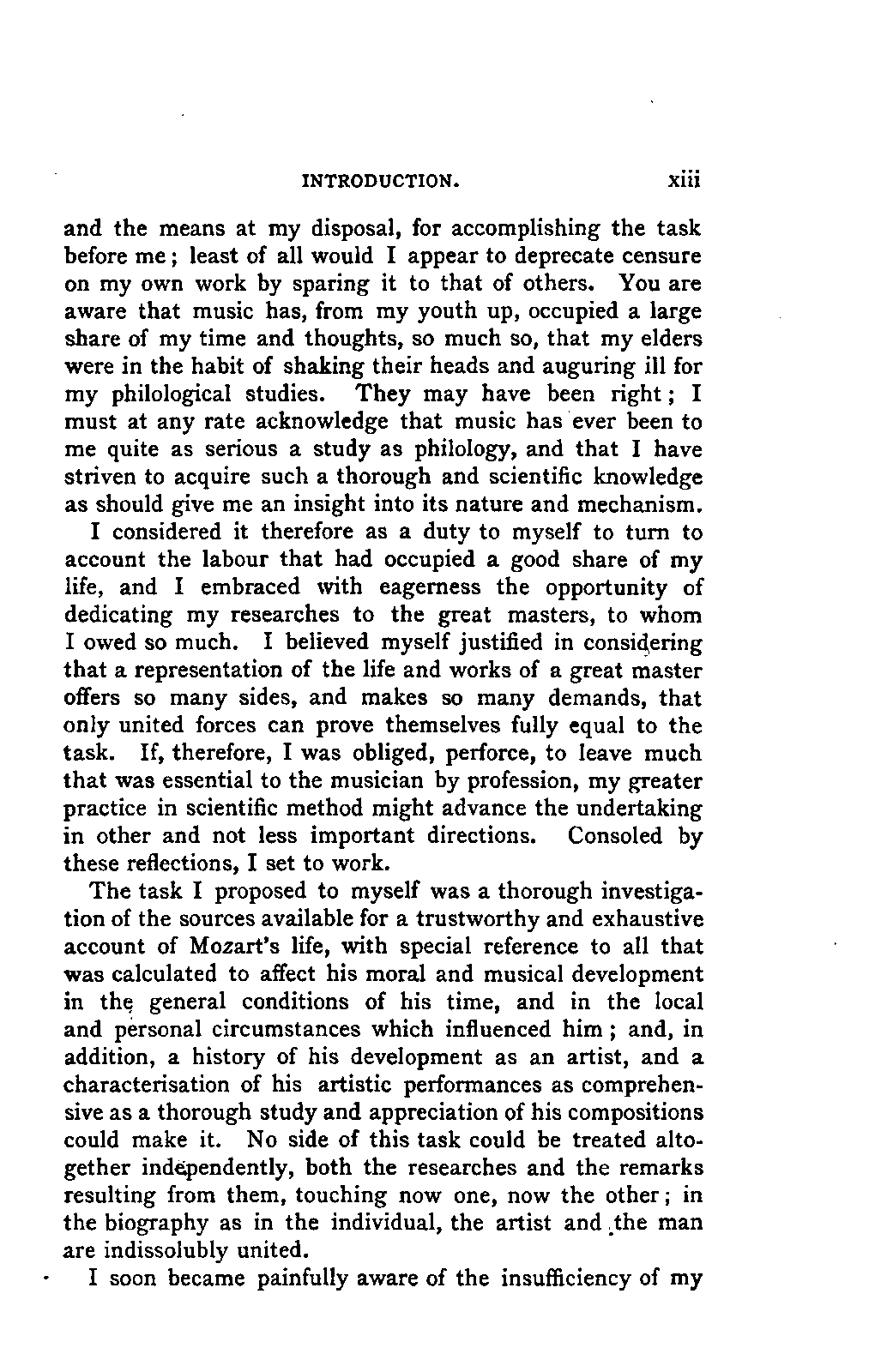 The task I proposed to myself was a thorough investigation of the sources available for a trustworthy and exhaustive account of Mozart's life, with special reference to all that was calculated to affect his moral and musical development in the general conditions of his time, and in the local and personal circumstances which influenced him; and, in addition, a history of his development as an artist, and a characterisation of his artistic performances as comprehensive as a thorough study and appreciation of his compositions could make it. No side of this task could be treated altogether independently, both the researches and the remarks resulting from them, touching now one, now the other; in the biography as in the individual, the artist and the man are indissolubly united