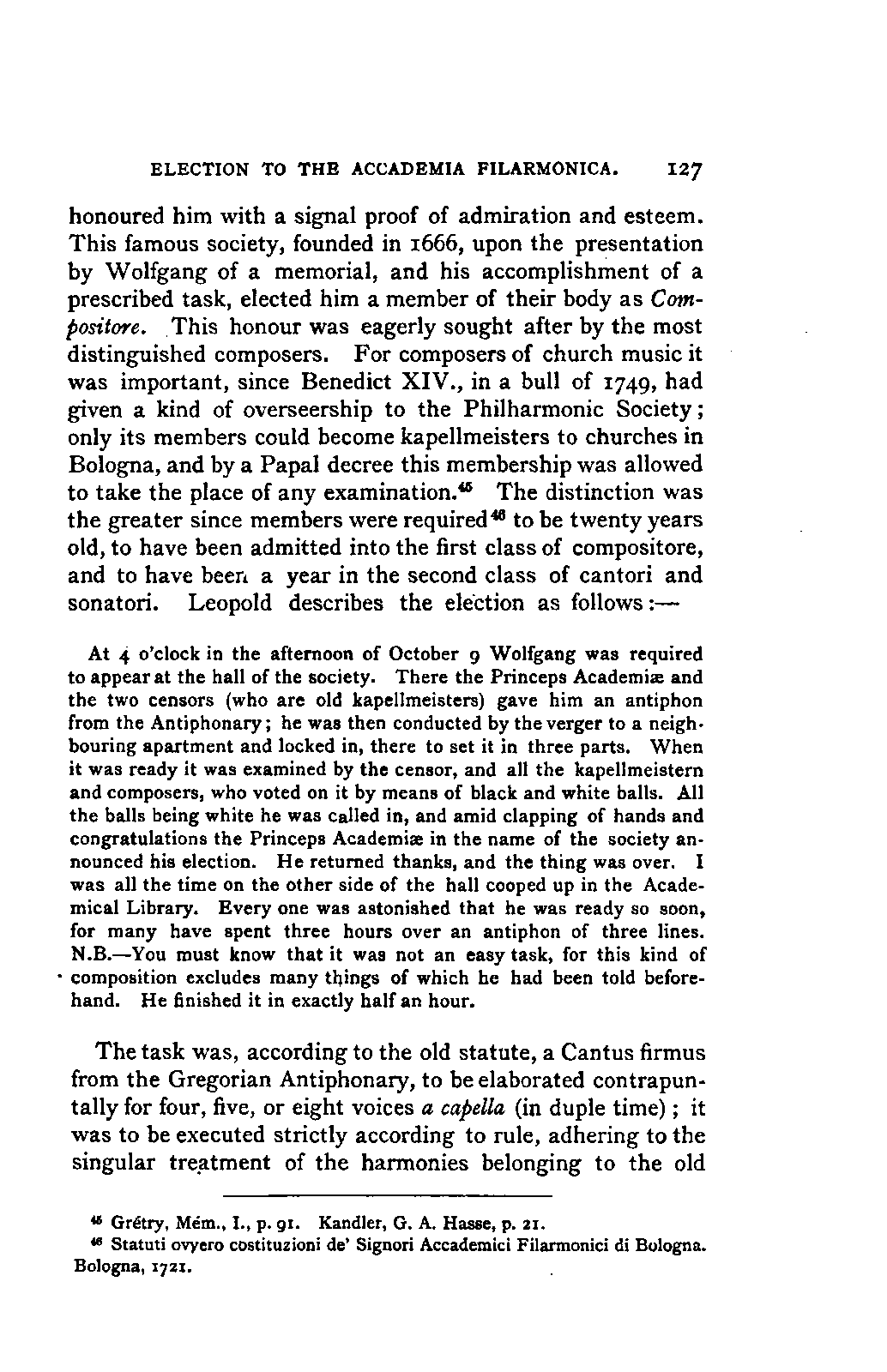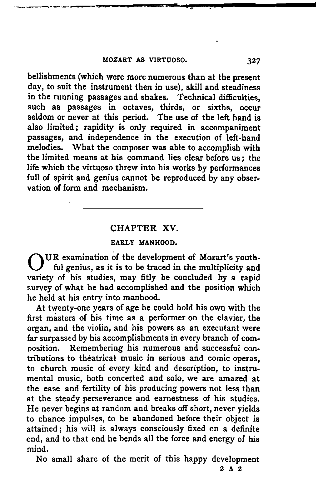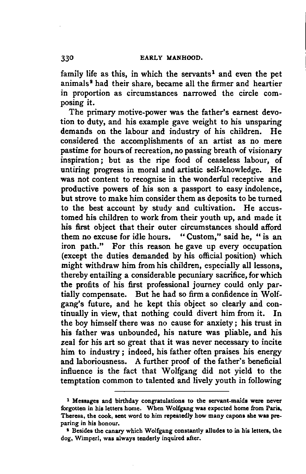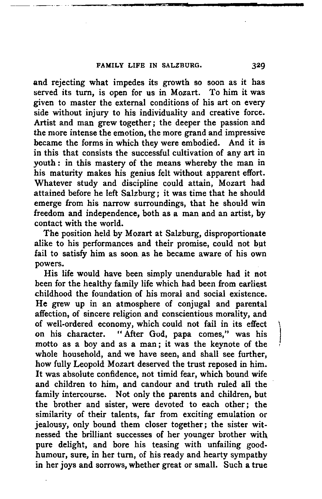 The task I proposed to myself was a thorough investigation of the sources available for a trustworthy and exhaustive account of Mozart's life, with special reference to all that was calculated to affect his moral and musical development in the general conditions of his time, and in the local and personal circumstances which influenced him; and, in addition, a history of his development as an artist, and a characterisation of his artistic performances as comprehensive as a thorough study and appreciation of his compositions could make it. No side of this task could be treated altogether independently, both the researches and the remarks resulting from them, touching now one, now the other; in the biography as in the individual, the artist and the man are indissolubly united