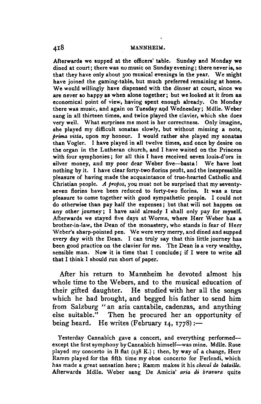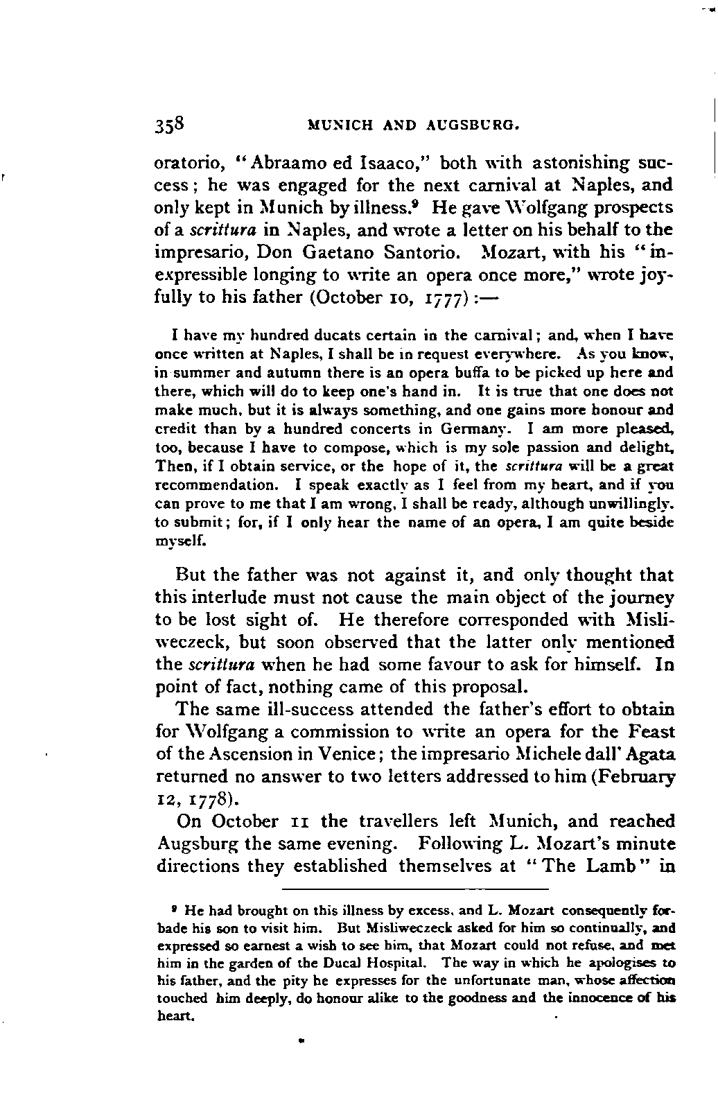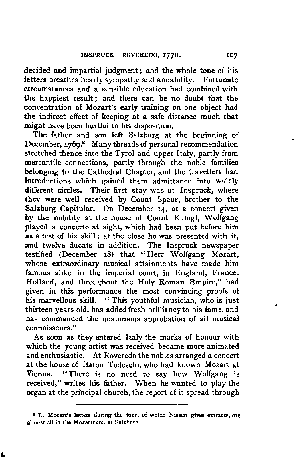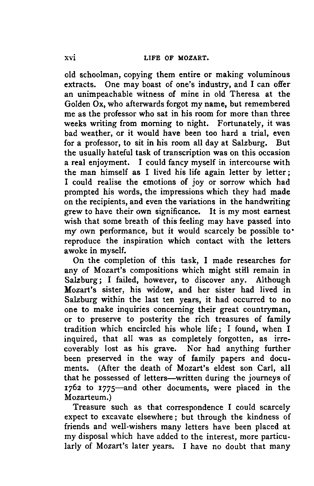 The greatest service which he rendered me, however, was the intelligence that all that were preserved of Mozart's letters had been presented to the Mozarteum in Salzburg by the Frau Baroni-Cavalcabo, to whom they were bequeathed by Mozart's son Wolfgang. In November of the same year I repaired, therefore, to Salzburg. I here found the only remains of that complete correspondence which Nissen had edited, viz., the letters between 1777 and 1784, just as he had made use of them; fortunately they embraced the most important period of the biography. A cursory glance convinced me that Nissen had been not only inexact and arbitrary in his selections in matters of detail, but that he had altogether suppressed the most important events affecting the proper understanding of the period. Here, then was much to be done; but it was richly worth the trouble. Through the kind assistance of the secretary of the Mozarteum, Dr. v. Hilleprandt, and of the custodian, Jelinek, I was enabled to give my whole attention to the work. I collated the letters printed by Nissen, like an LIFE OF MOZART. [xvi] old schoolman, copying them entire or making voluminous extracts. One may boast of one's industry, and I can offer an unimpeachable witness of mine in old Theresa at the Golden Ox, who afterwards forgot my name, but remembered me as the professor who sat in his room for more than three weeks writing from morning to night. Fortunately, it was bad weather, or it would have been too hard a trial, even for a professor, to sit in his room all day at Salzburg. But the usually hateful task of transcription was on this occasion a real enjoyment. I could fancy myself in intercourse with the man himself as I lived his life again letter by letter.