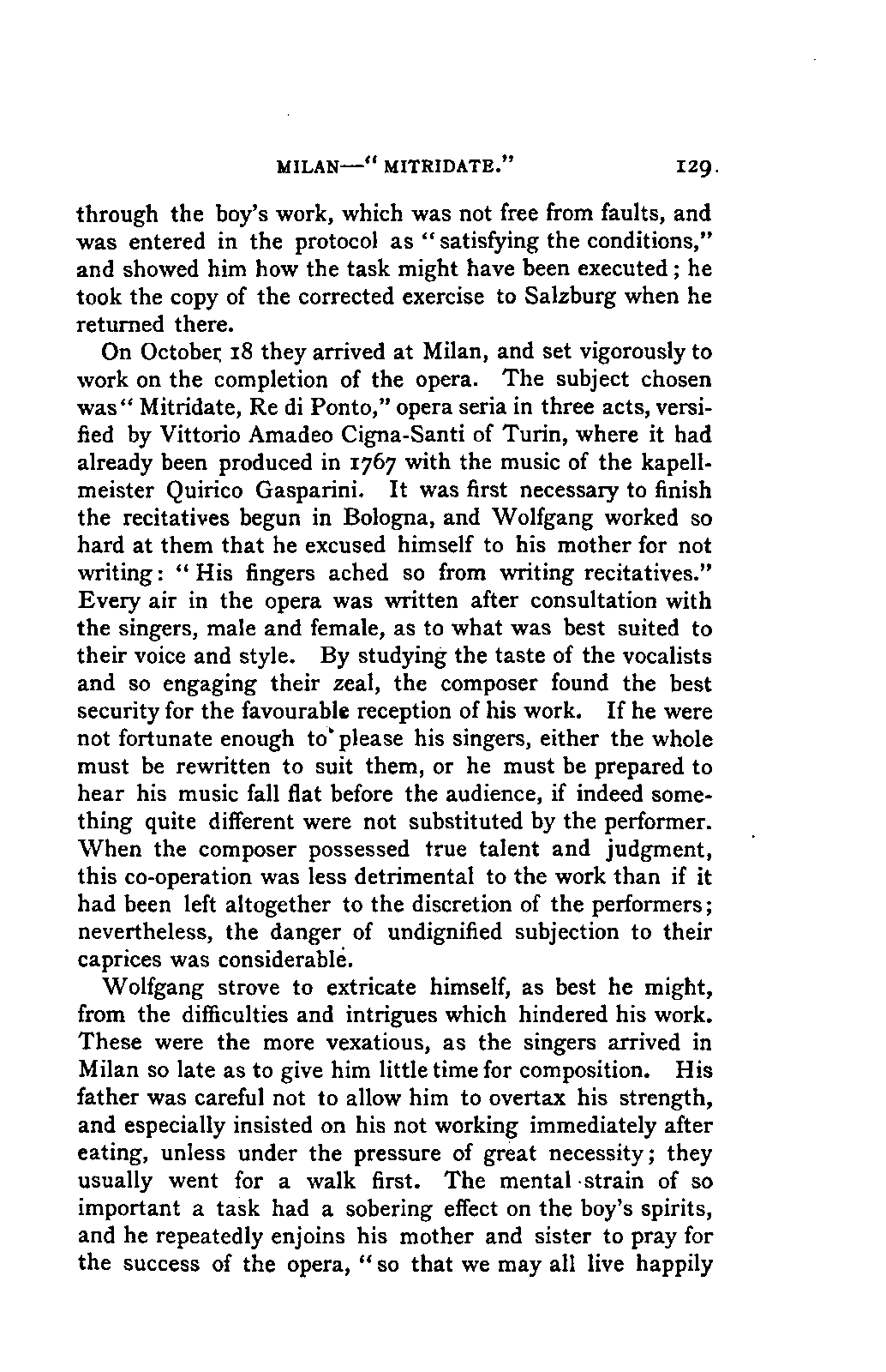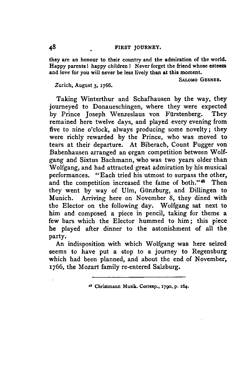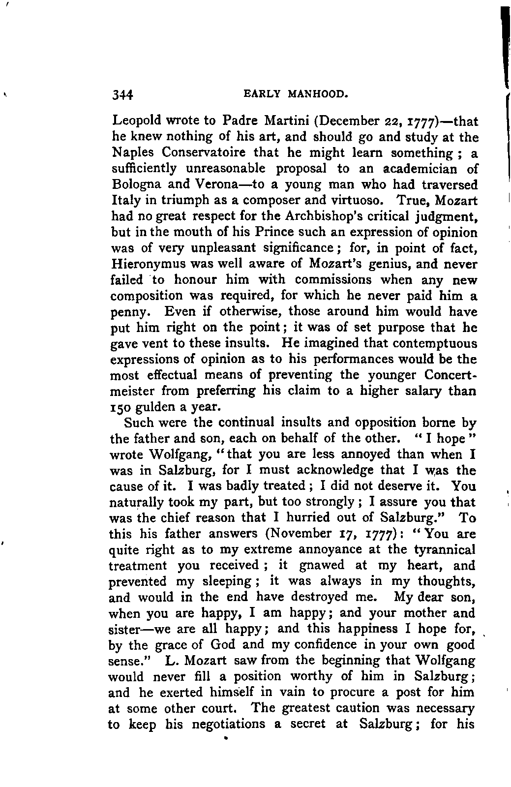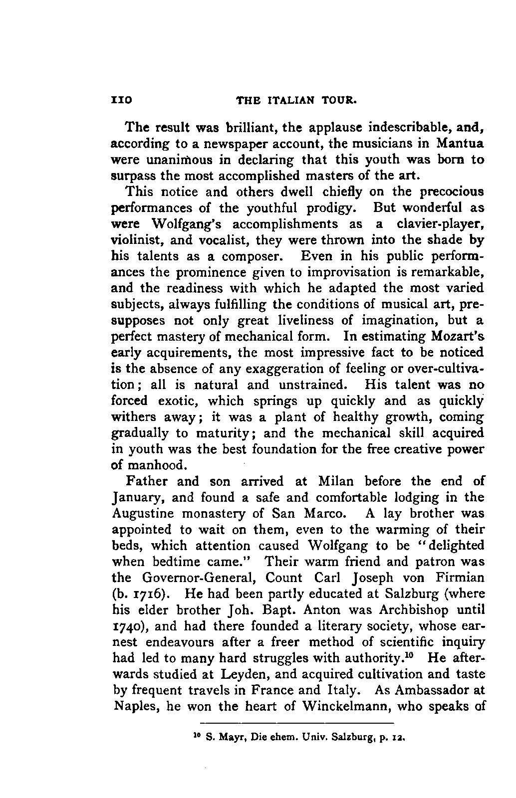 The greatest service which he rendered me, however, was the intelligence that all that were preserved of Mozart's letters had been presented to the Mozarteum in Salzburg by the Frau Baroni-Cavalcabo, to whom they were bequeathed by Mozart's son Wolfgang. In November of the same year I repaired, therefore, to Salzburg. I here found the only remains of that complete correspondence which Nissen had edited, viz., the letters between 1777 and 1784, just as he had made use of them; fortunately they embraced the most important period of the biography. A cursory glance convinced me that Nissen had been not only inexact and arbitrary in his selections in matters of detail, but that he had altogether suppressed the most important events affecting the proper understanding of the period. Here, then was much to be done; but it was richly worth the trouble. Through the kind assistance of the secretary of the Mozarteum, Dr. v. Hilleprandt, and of the custodian, Jelinek, I was enabled to give my whole attention to the work. I collated the letters printed by Nissen, like an LIFE OF MOZART. [xvi] old schoolman, copying them entire or making voluminous extracts. One may boast of one's industry, and I can offer an unimpeachable witness of mine in old Theresa at the Golden Ox, who afterwards forgot my name, but remembered me as the professor who sat in his room for more than three weeks writing from morning to night. Fortunately, it was bad weather, or it would have been too hard a trial, even for a professor, to sit in his room all day at Salzburg. But the usually hateful task of transcription was on this occasion a real enjoyment. I could fancy myself in intercourse with the man himself as I lived his life again letter by letter.