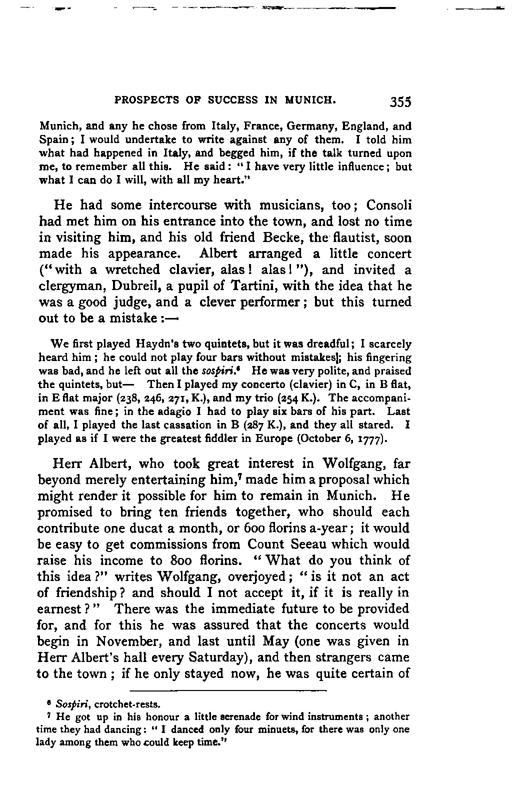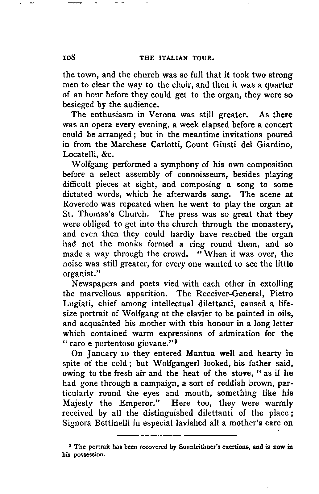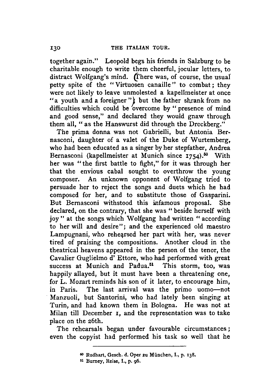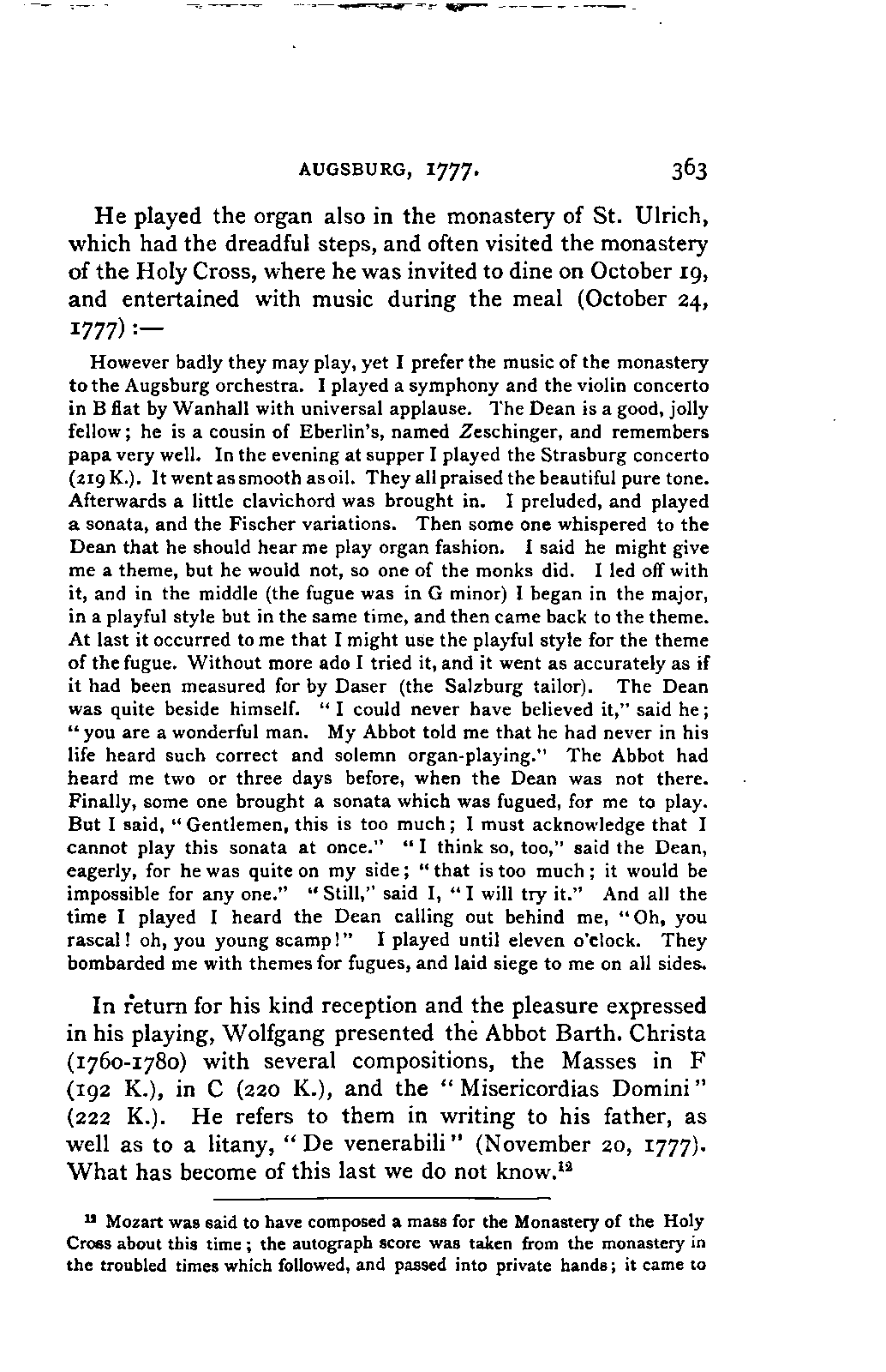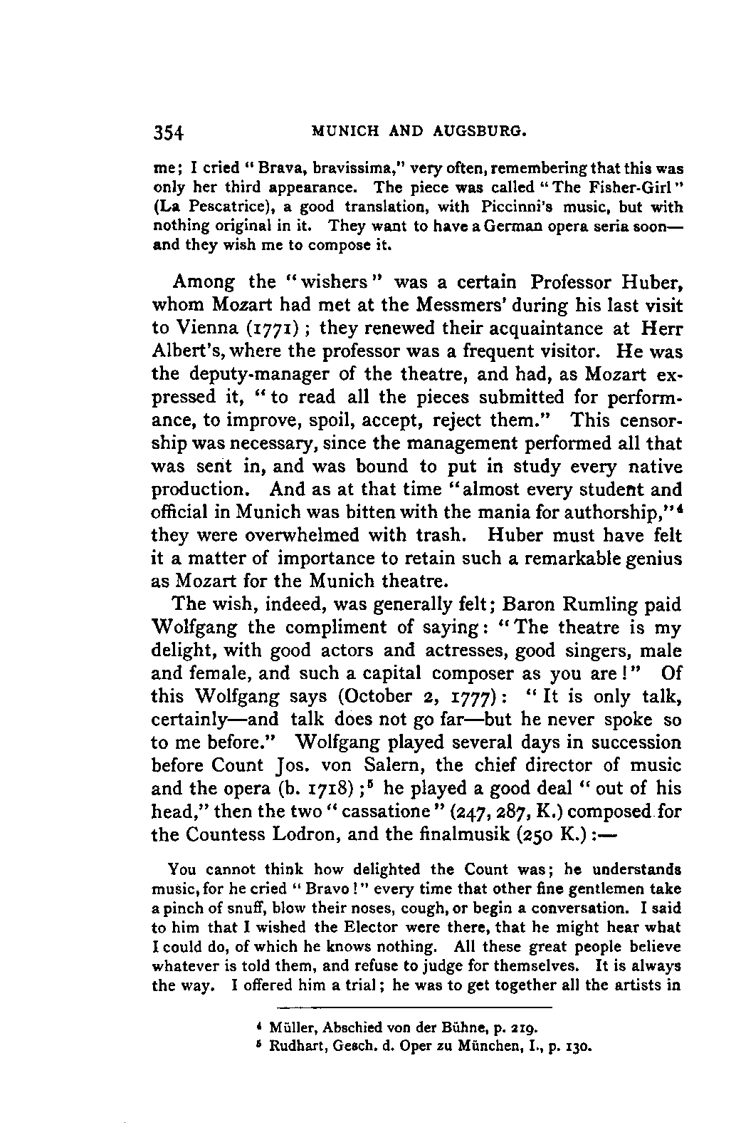 The greatest service which he rendered me, however, was the intelligence that all that were preserved of Mozart's letters had been presented to the Mozarteum in Salzburg by the Frau Baroni-Cavalcabo, to whom they were bequeathed by Mozart's son Wolfgang. In November of the same year I repaired, therefore, to Salzburg. I here found the only remains of that complete correspondence which Nissen had edited, viz., the letters between 1777 and 1784, just as he had made use of them; fortunately they embraced the most important period of the biography. A cursory glance convinced me that Nissen had been not only inexact and arbitrary in his selections in matters of detail, but that he had altogether suppressed the most important events affecting the proper understanding of the period. Here, then was much to be done; but it was richly worth the trouble. Through the kind assistance of the secretary of the Mozarteum, Dr. v. Hilleprandt, and of the custodian, Jelinek, I was enabled to give my whole attention to the work. I collated the letters printed by Nissen, like an LIFE OF MOZART. [xvi] old schoolman, copying them entire or making voluminous extracts. One may boast of one's industry, and I can offer an unimpeachable witness of mine in old Theresa at the Golden Ox, who afterwards forgot my name, but remembered me as the professor who sat in his room for more than three weeks writing from morning to night. Fortunately, it was bad weather, or it would have been too hard a trial, even for a professor, to sit in his room all day at Salzburg. But the usually hateful task of transcription was on this occasion a real enjoyment. I could fancy myself in intercourse with the man himself as I lived his life again letter by letter.