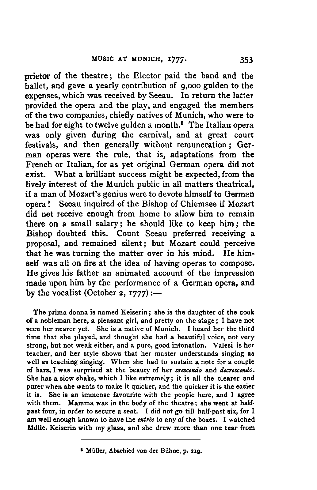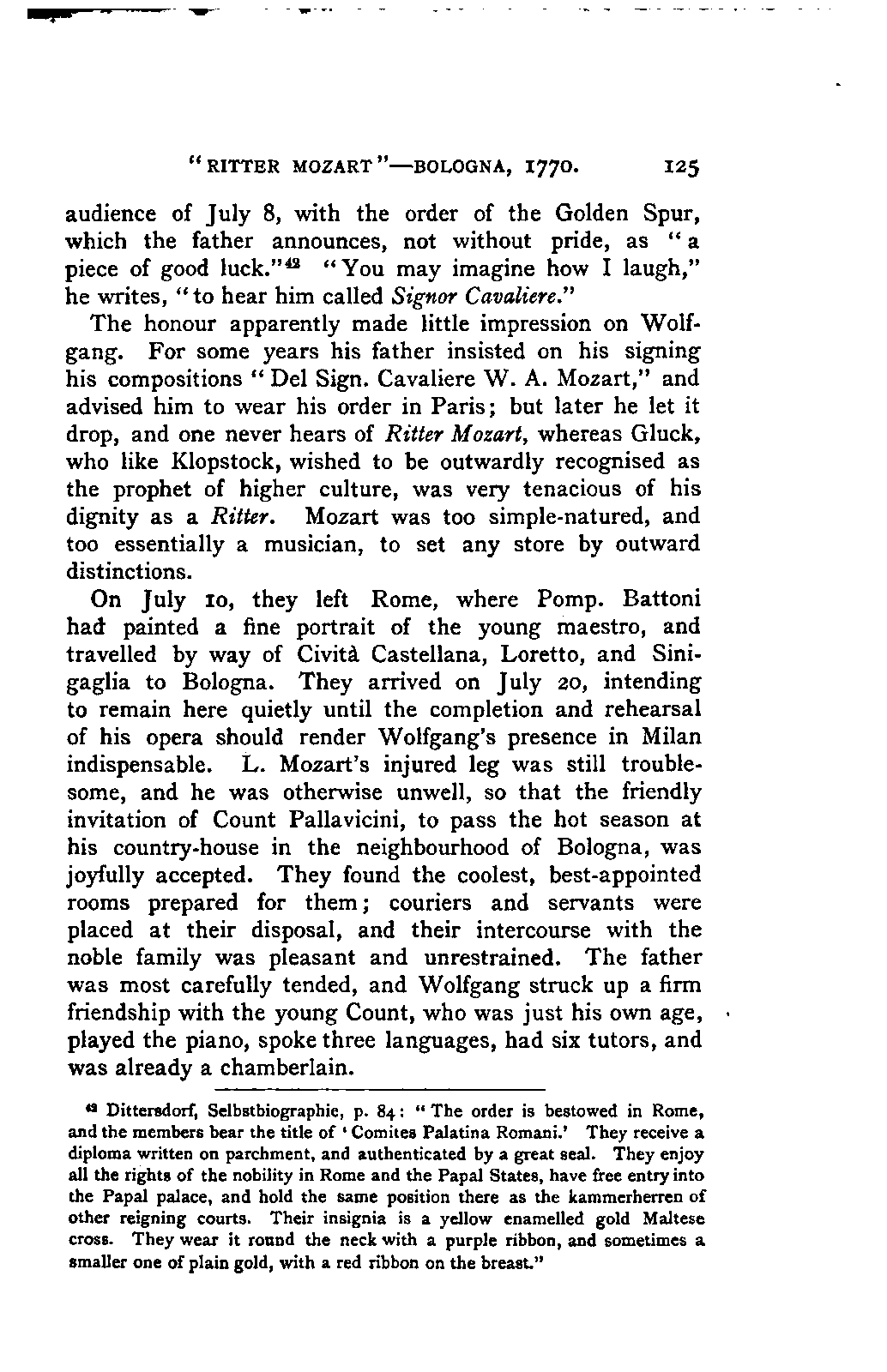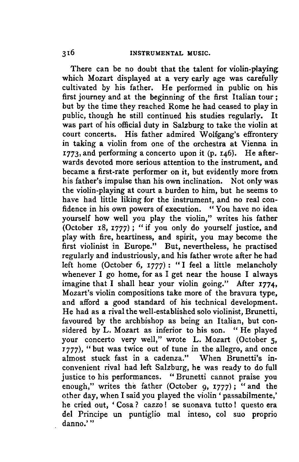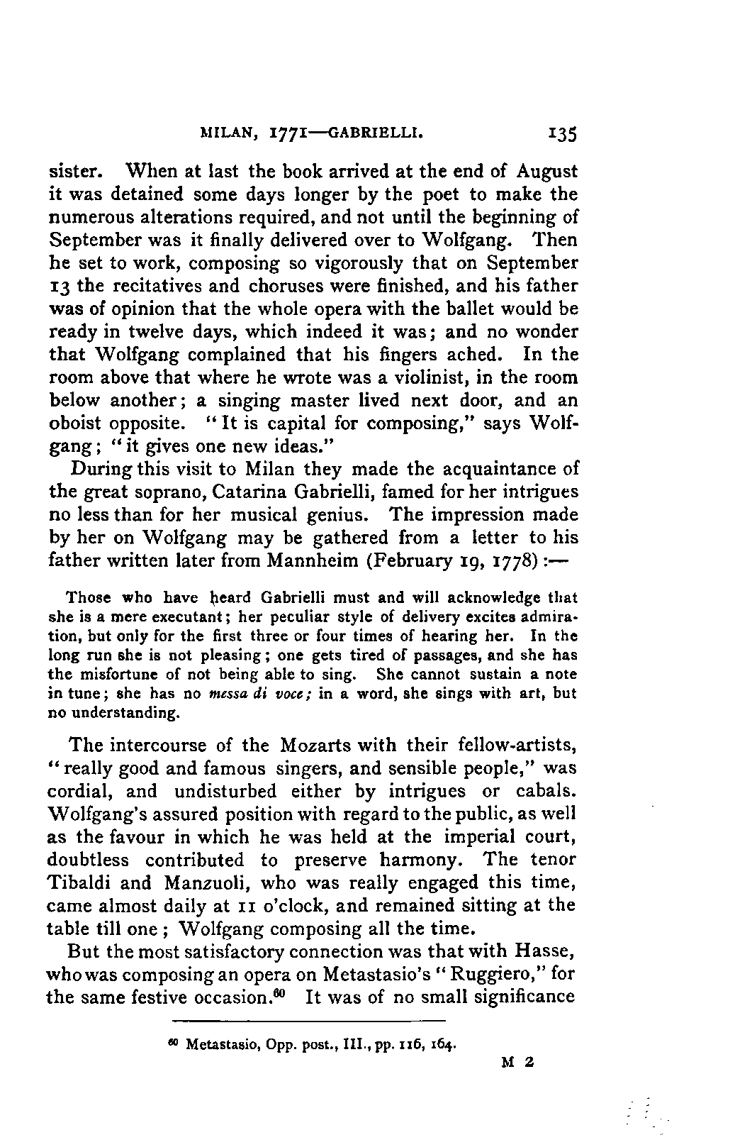 The greatest service which he rendered me, however, was the intelligence that all that were preserved of Mozart's letters had been presented to the Mozarteum in Salzburg by the Frau Baroni-Cavalcabo, to whom they were bequeathed by Mozart's son Wolfgang. In November of the same year I repaired, therefore, to Salzburg. I here found the only remains of that complete correspondence which Nissen had edited, viz., the letters between 1777 and 1784, just as he had made use of them; fortunately they embraced the most important period of the biography. A cursory glance convinced me that Nissen had been not only inexact and arbitrary in his selections in matters of detail, but that he had altogether suppressed the most important events affecting the proper understanding of the period. Here, then was much to be done; but it was richly worth the trouble. Through the kind assistance of the secretary of the Mozarteum, Dr. v. Hilleprandt, and of the custodian, Jelinek, I was enabled to give my whole attention to the work. I collated the letters printed by Nissen, like an LIFE OF MOZART. [xvi] old schoolman, copying them entire or making voluminous extracts. One may boast of one's industry, and I can offer an unimpeachable witness of mine in old Theresa at the Golden Ox, who afterwards forgot my name, but remembered me as the professor who sat in his room for more than three weeks writing from morning to night. Fortunately, it was bad weather, or it would have been too hard a trial, even for a professor, to sit in his room all day at Salzburg. But the usually hateful task of transcription was on this occasion a real enjoyment. I could fancy myself in intercourse with the man himself as I lived his life again letter by letter.