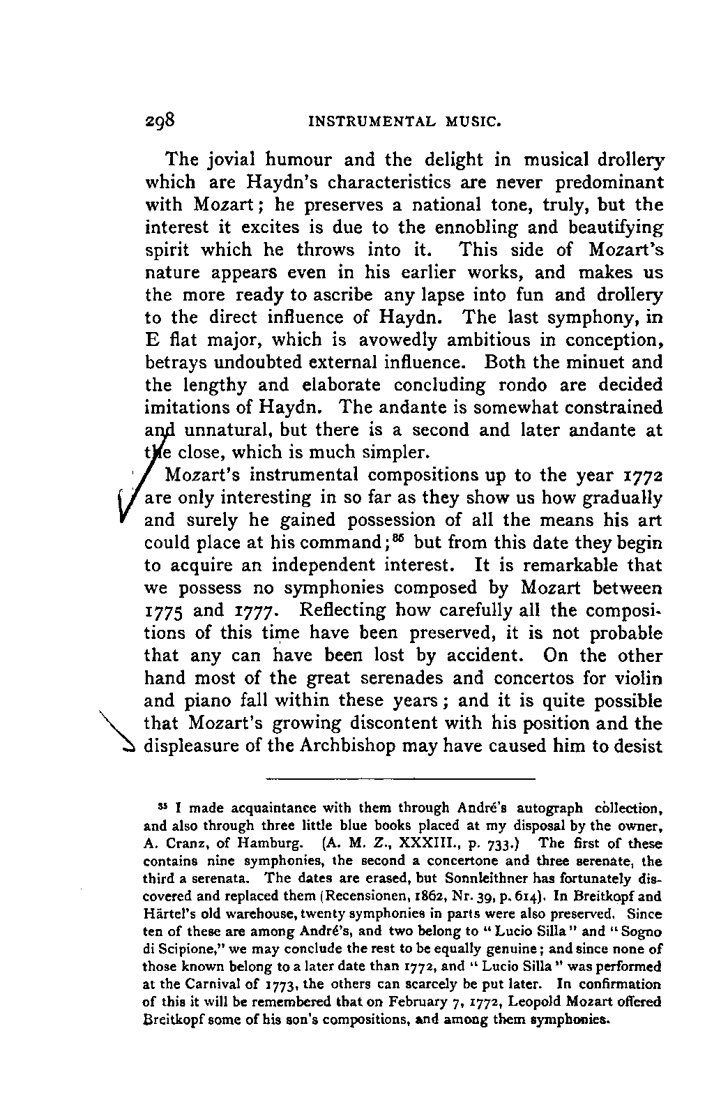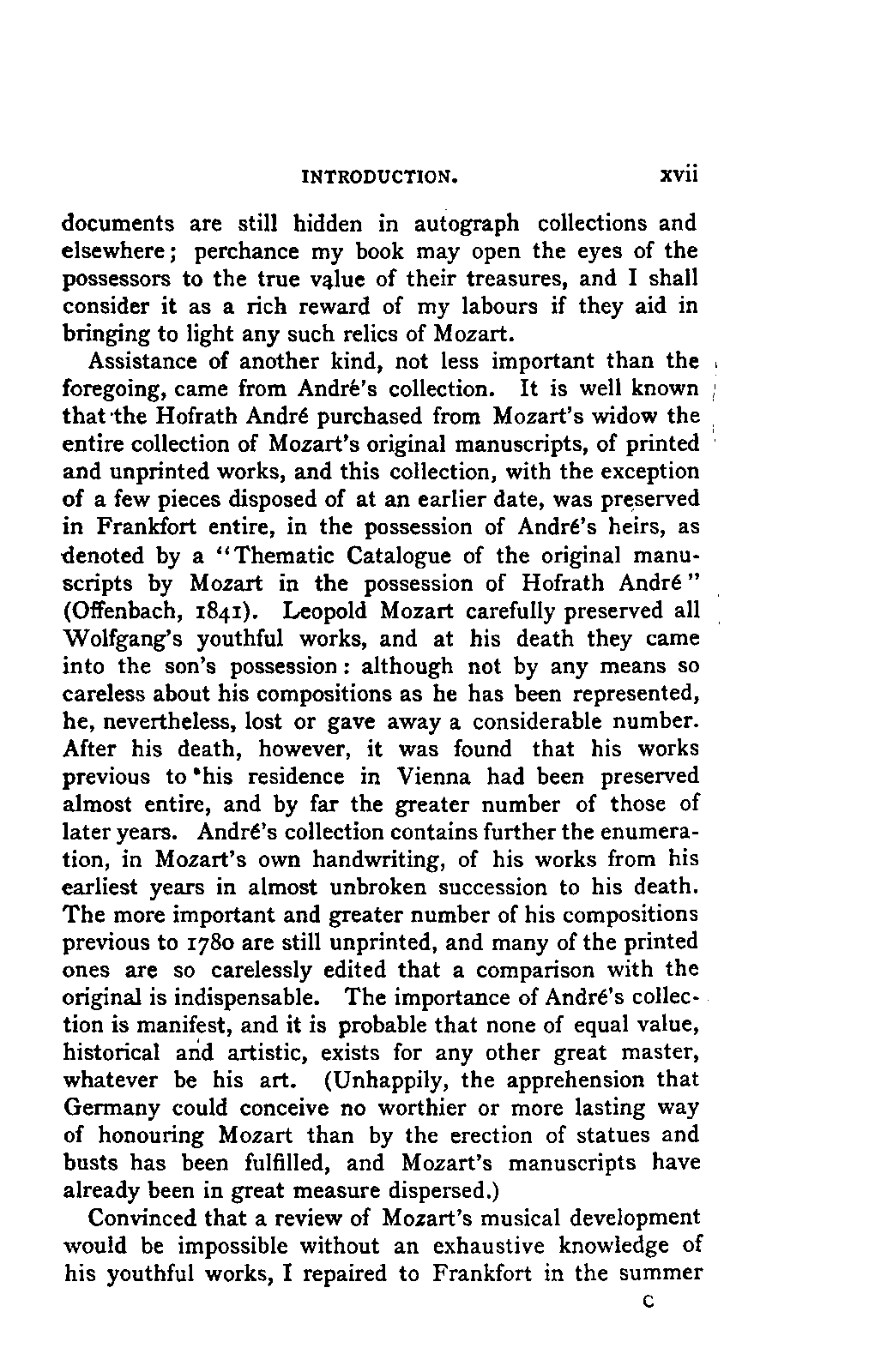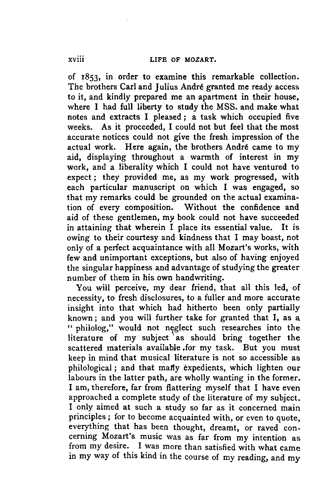 Convinced that a review of Mozart's musical development would be impossible without an exhaustive knowledge of his youthful works, I repaired to Frankfort in the summer LIFE OF MOZART. [xviii] of 1853, in order to examine this remarkable collection. The brothers Carl and Julius André granted me ready access to it, and kindly prepared me an apartment in their house, where I had full liberty to study the MSS. and make what notes and extracts I pleased; a task which occupied five weeks. As it proceeded, I could not but feel that the most accurate notices could not give the fresh impression of the actual work. Here again, the brothers André came to my aid, displaying throughout a warmth of interest in my work, and a liberality which I could not have ventured to expect; they provided me, as my work progressed, with each particular manuscript on which I was engaged, so that my remarks could be grounded on the actual examination of every composition. Without the confidence and aid of these gentlemen, my book could not have succeeded in attaining that wherein I place its essential value. It is owing to their courtesy and kindness that I may boast, not only of a perfect acquaintance with all Mozart's works, with few and unimportant exceptions, but also of having enjoyed the singular happiness and advantage of studying the greater number of them in his own handwriting.