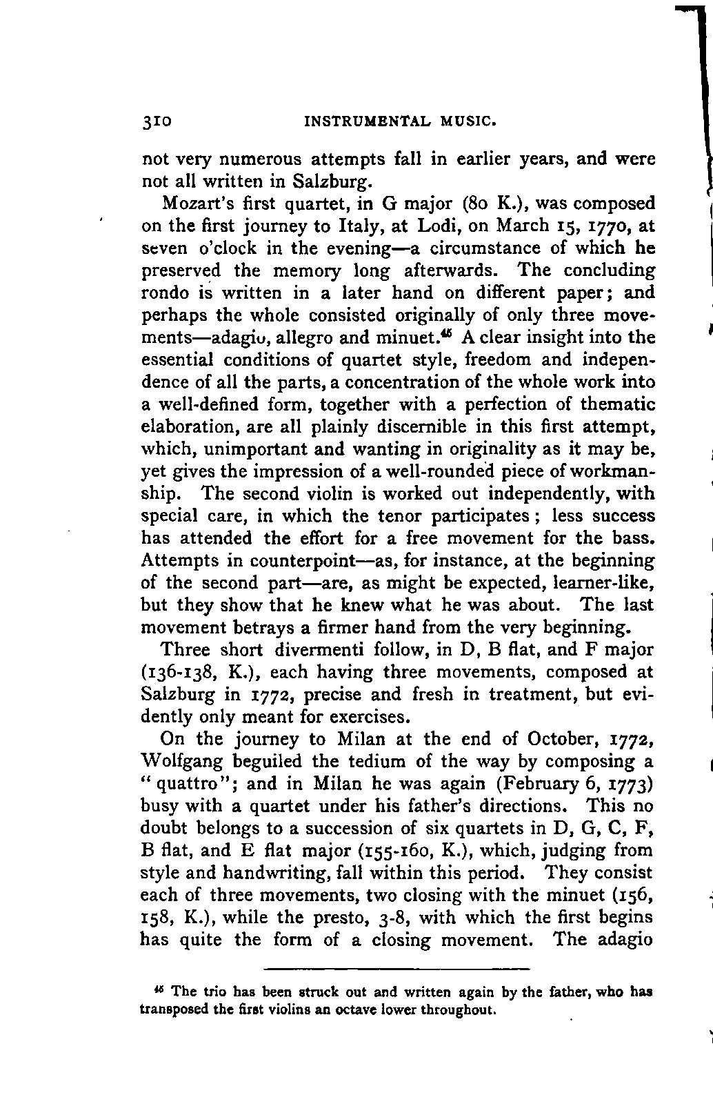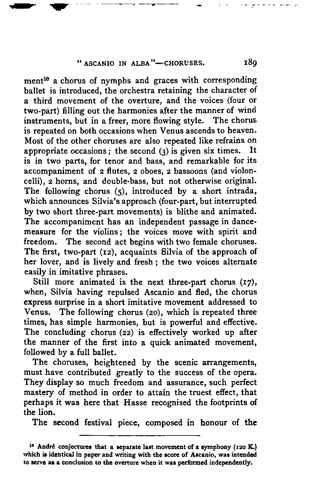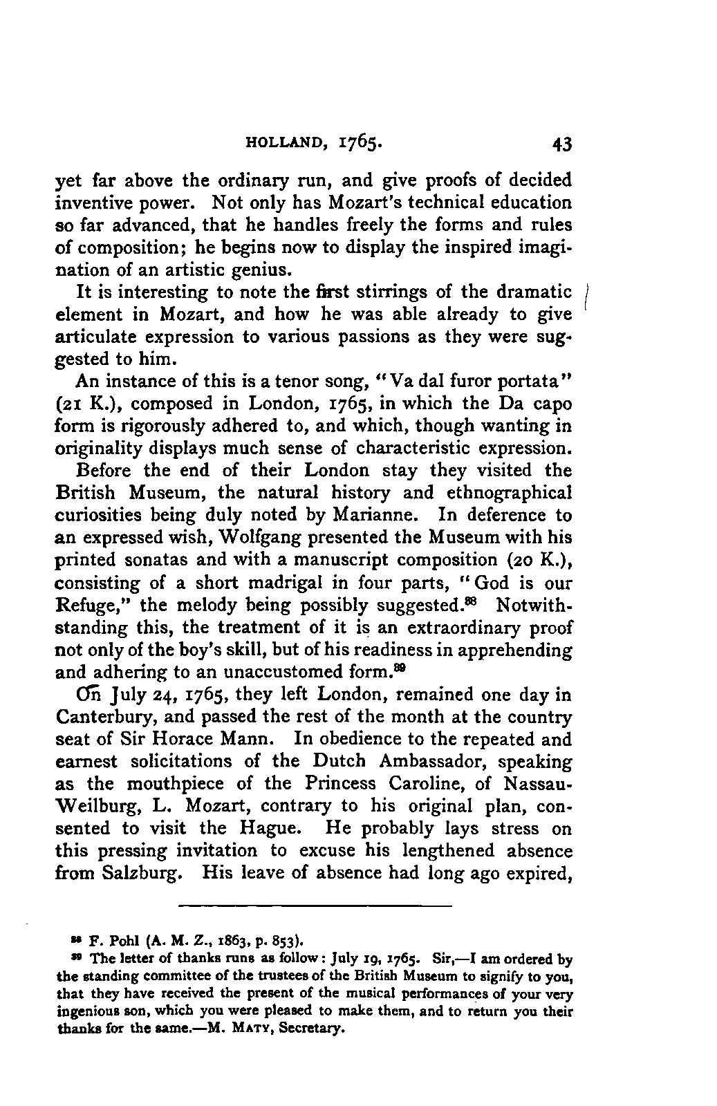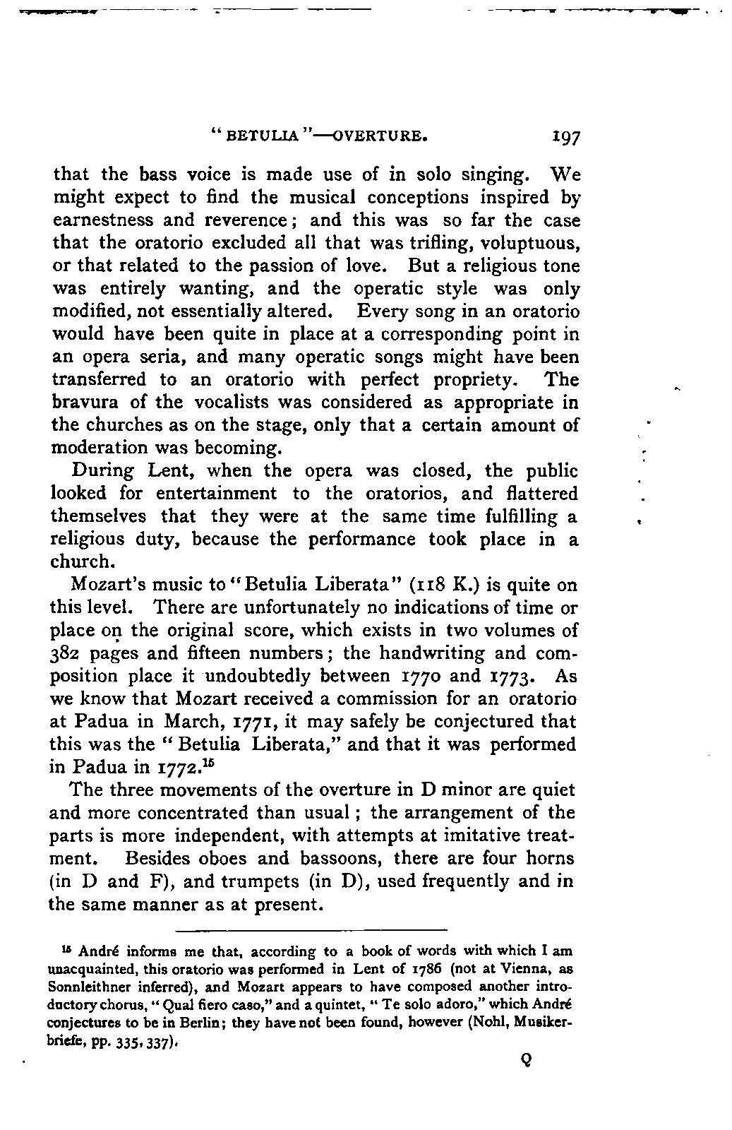 Convinced that a review of Mozart's musical development would be impossible without an exhaustive knowledge of his youthful works, I repaired to Frankfort in the summer LIFE OF MOZART. [xviii] of 1853, in order to examine this remarkable collection. The brothers Carl and Julius André granted me ready access to it, and kindly prepared me an apartment in their house, where I had full liberty to study the MSS. and make what notes and extracts I pleased; a task which occupied five weeks. As it proceeded, I could not but feel that the most accurate notices could not give the fresh impression of the actual work. Here again, the brothers André came to my aid, displaying throughout a warmth of interest in my work, and a liberality which I could not have ventured to expect; they provided me, as my work progressed, with each particular manuscript on which I was engaged, so that my remarks could be grounded on the actual examination of every composition. Without the confidence and aid of these gentlemen, my book could not have succeeded in attaining that wherein I place its essential value. It is owing to their courtesy and kindness that I may boast, not only of a perfect acquaintance with all Mozart's works, with few and unimportant exceptions, but also of having enjoyed the singular happiness and advantage of studying the greater number of them in his own handwriting.