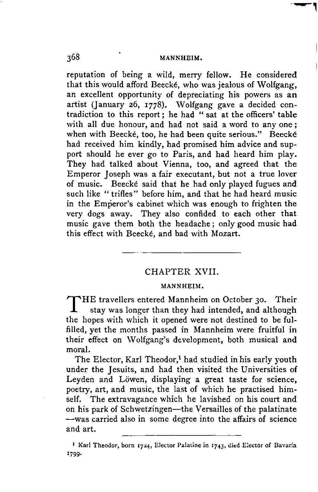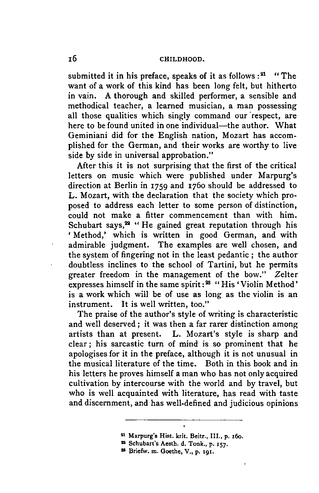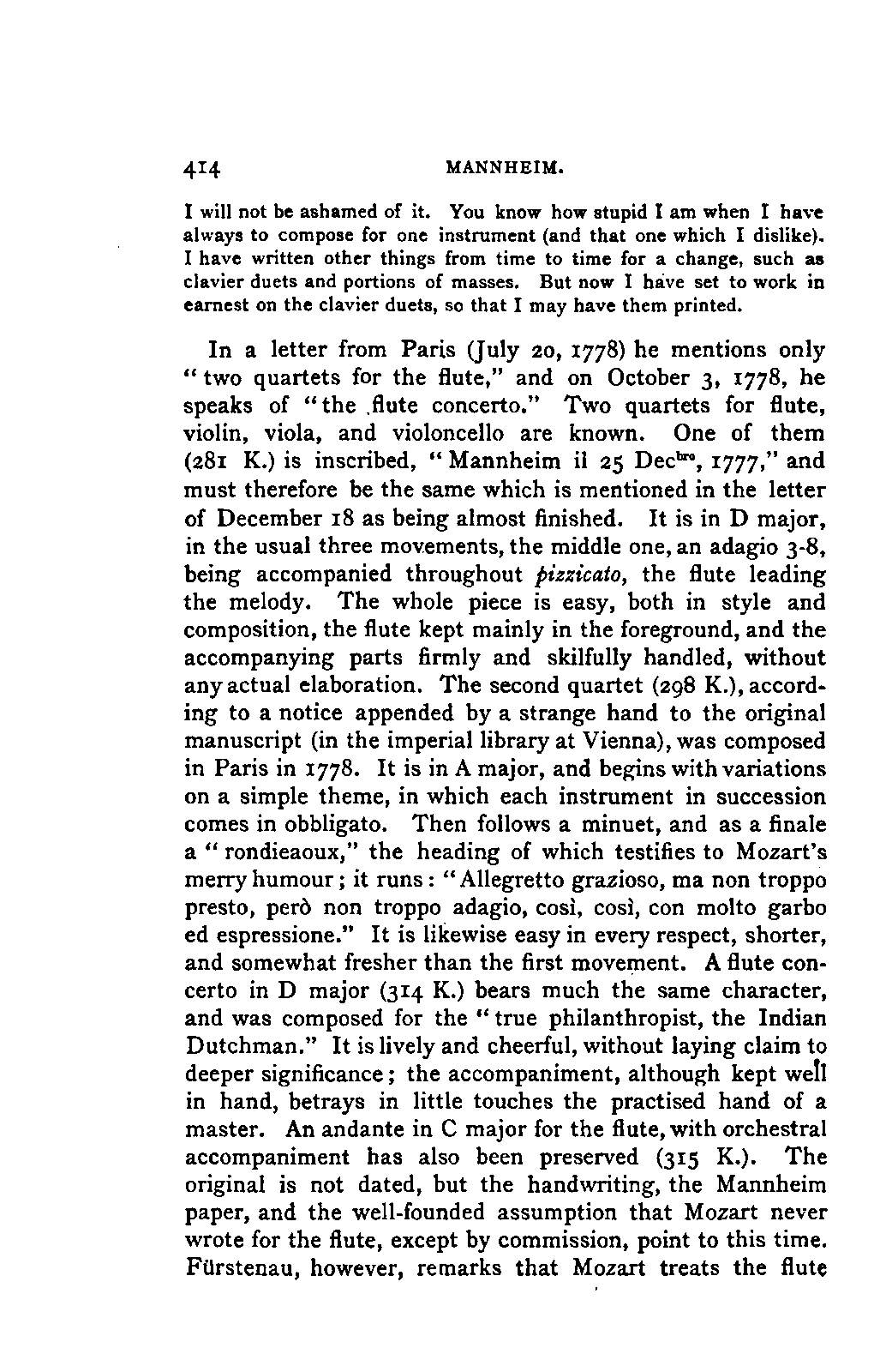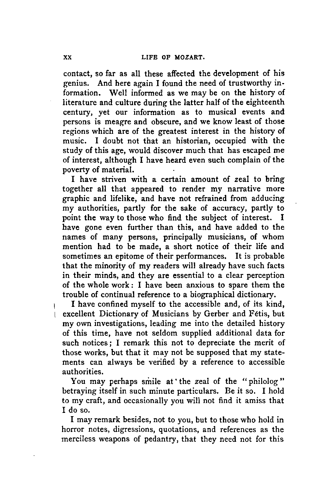 It has been my aim to represent, not only what immediately concerns Mozart, but also the time in which he lived, his circumstances, and the persons with whom he came in LIFE OF MOZART. [xx] contact, so far as all these affected the development of his genius. And here again I found the need of trustworthy information. Well informed as we may be on the history of literature and culture during the latter half of the eighteenth century, yet our information as to musical events and persons is meagre and obscure, and we know least of those regions which are of the greatest interest in the history of music. I doubt not that an historian, occupied with the study of this age, would discover much that has escaped me of interest, although I have heard even such complain of the poverty of material.