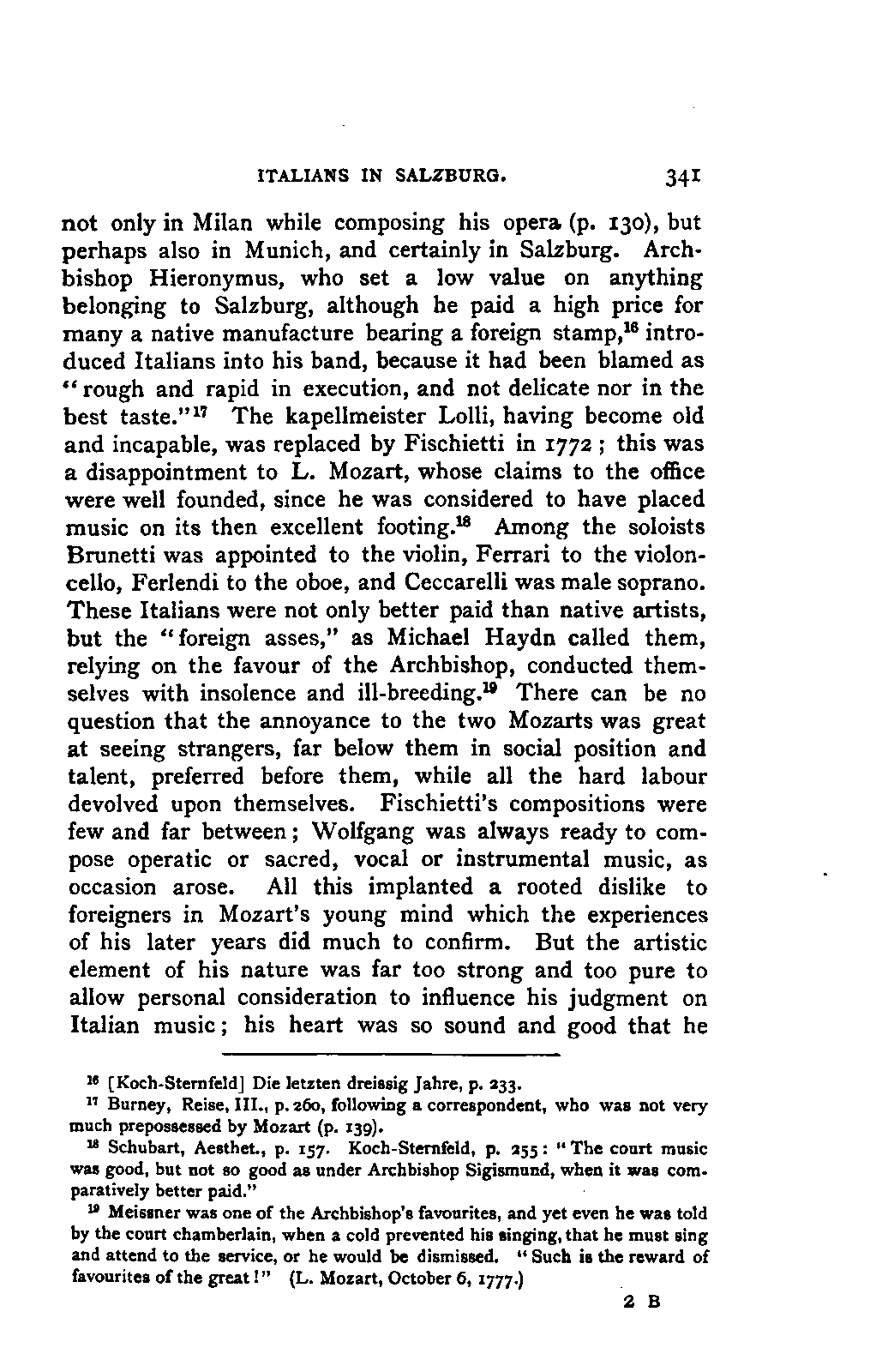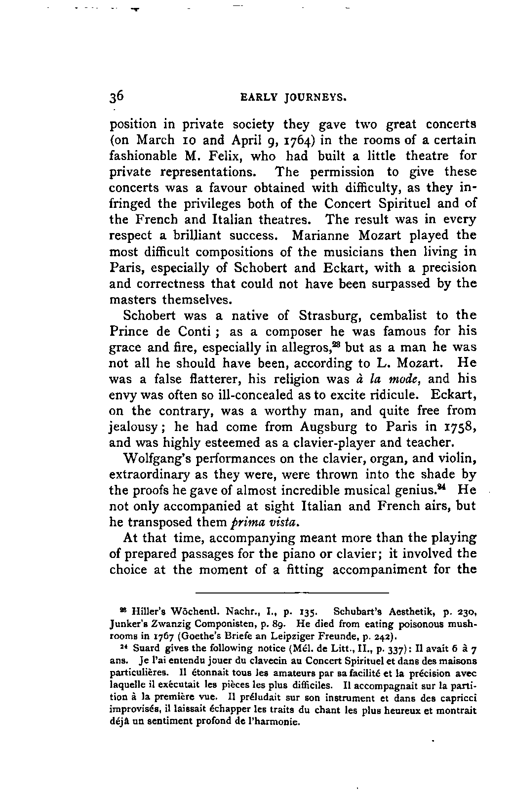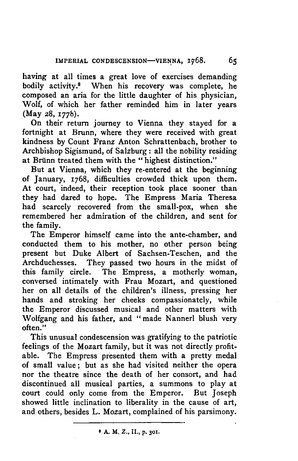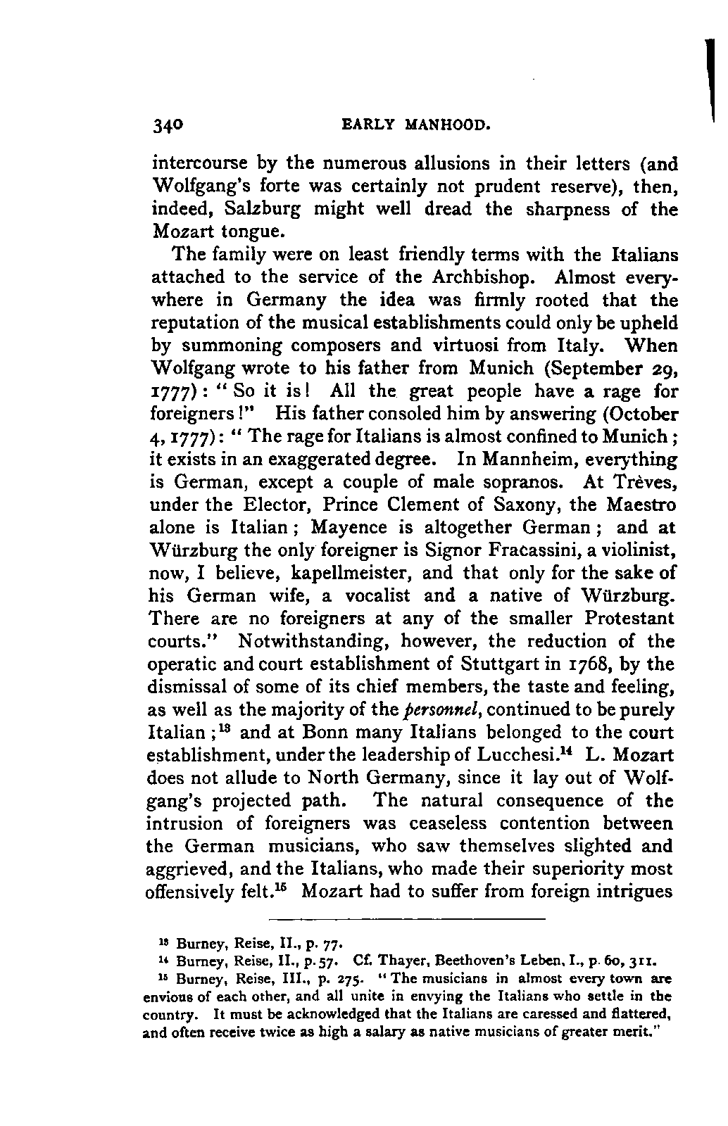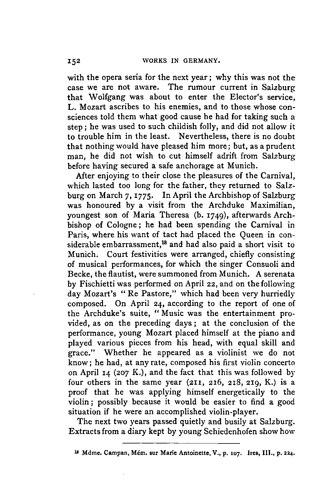 It has been my aim to represent, not only what immediately concerns Mozart, but also the time in which he lived, his circumstances, and the persons with whom he came in LIFE OF MOZART. [xx] contact, so far as all these affected the development of his genius. And here again I found the need of trustworthy information. Well informed as we may be on the history of literature and culture during the latter half of the eighteenth century, yet our information as to musical events and persons is meagre and obscure, and we know least of those regions which are of the greatest interest in the history of music. I doubt not that an historian, occupied with the study of this age, would discover much that has escaped me of interest, although I have heard even such complain of the poverty of material.