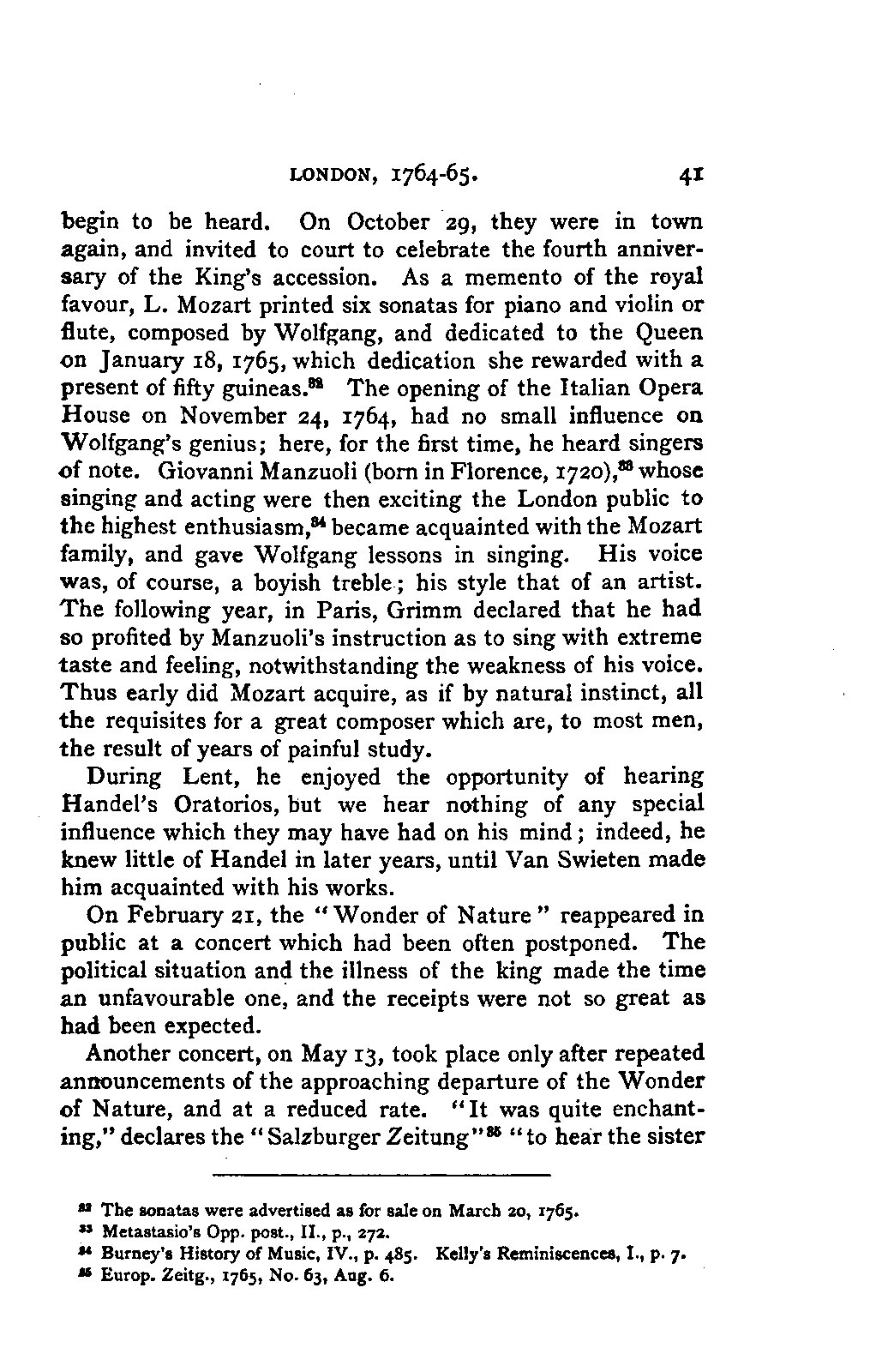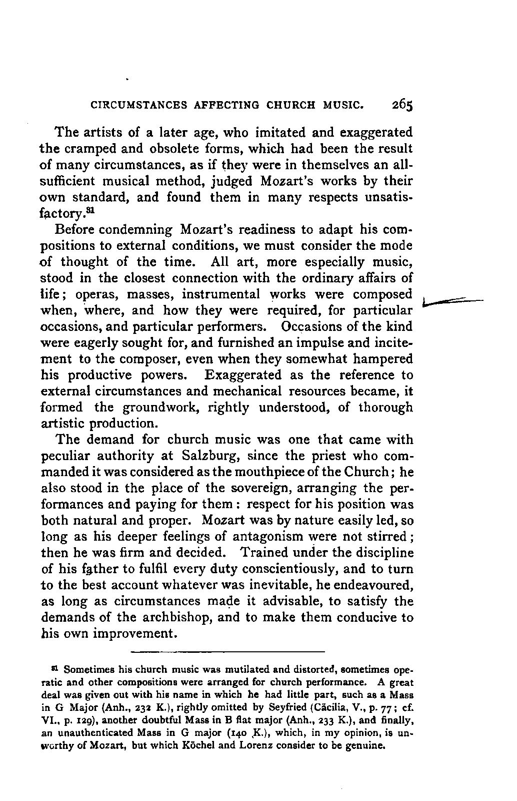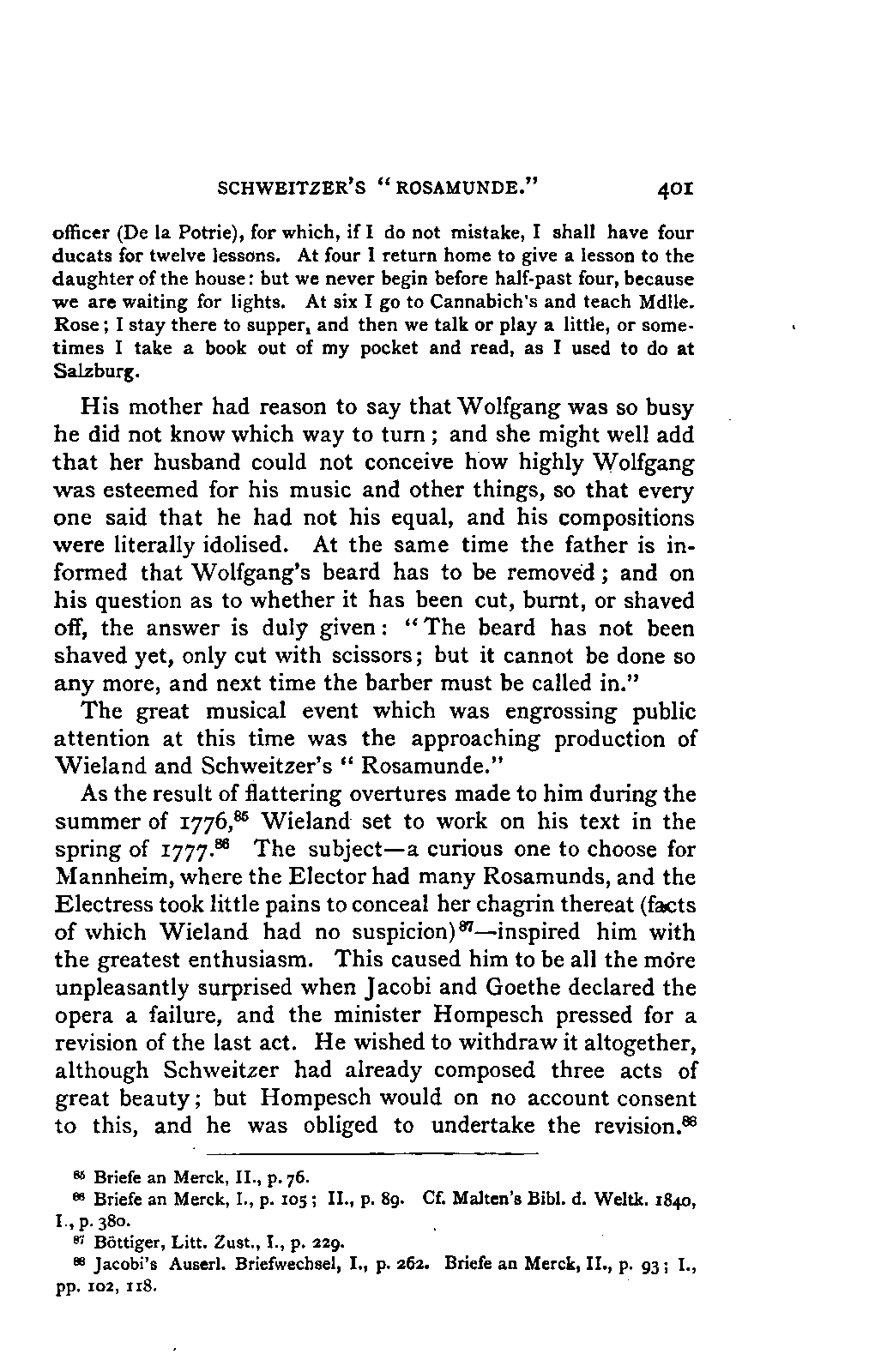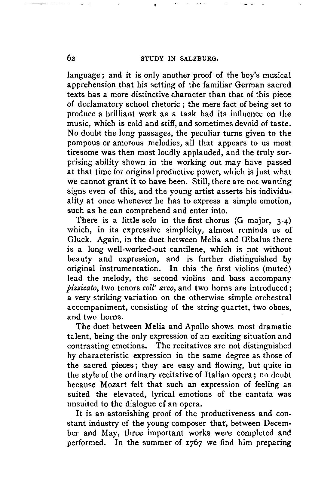 It has been my aim to represent, not only what immediately concerns Mozart, but also the time in which he lived, his circumstances, and the persons with whom he came in LIFE OF MOZART. [xx] contact, so far as all these affected the development of his genius. And here again I found the need of trustworthy information. Well informed as we may be on the history of literature and culture during the latter half of the eighteenth century, yet our information as to musical events and persons is meagre and obscure, and we know least of those regions which are of the greatest interest in the history of music. I doubt not that an historian, occupied with the study of this age, would discover much that has escaped me of interest, although I have heard even such complain of the poverty of material.