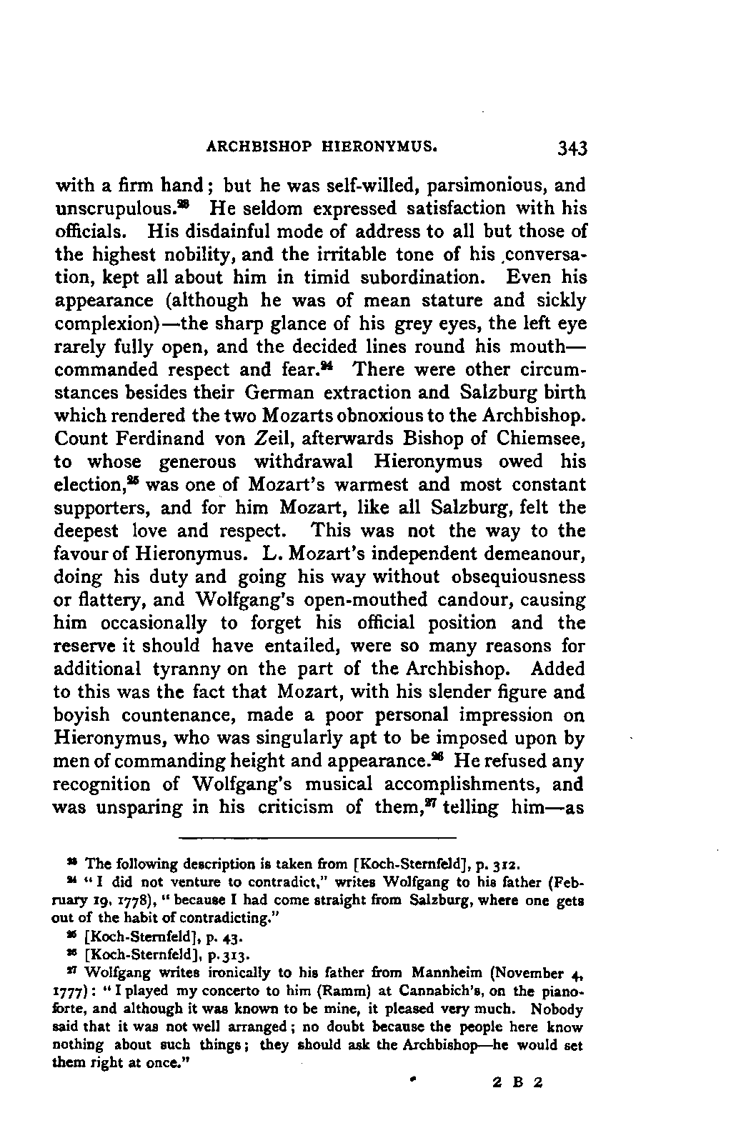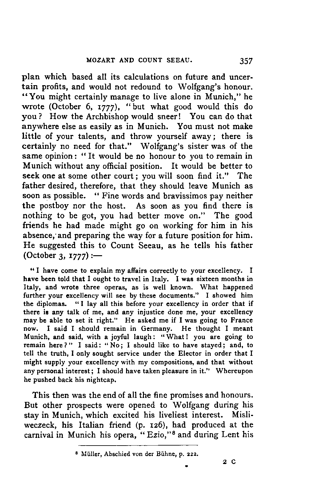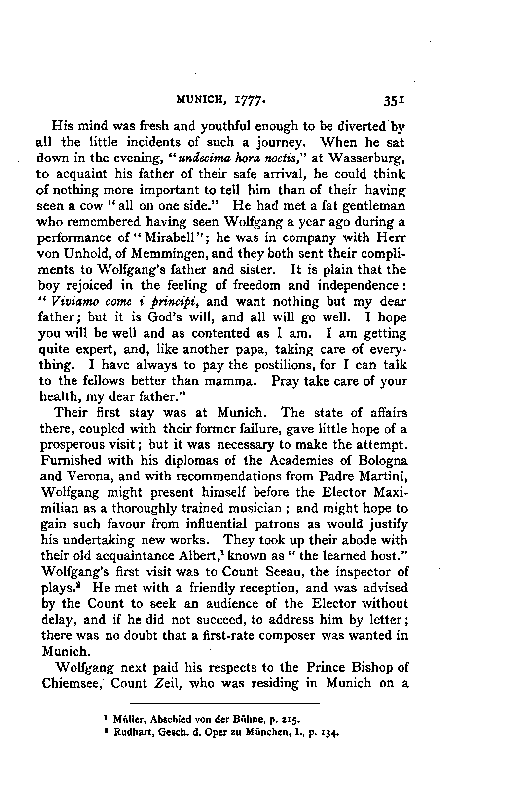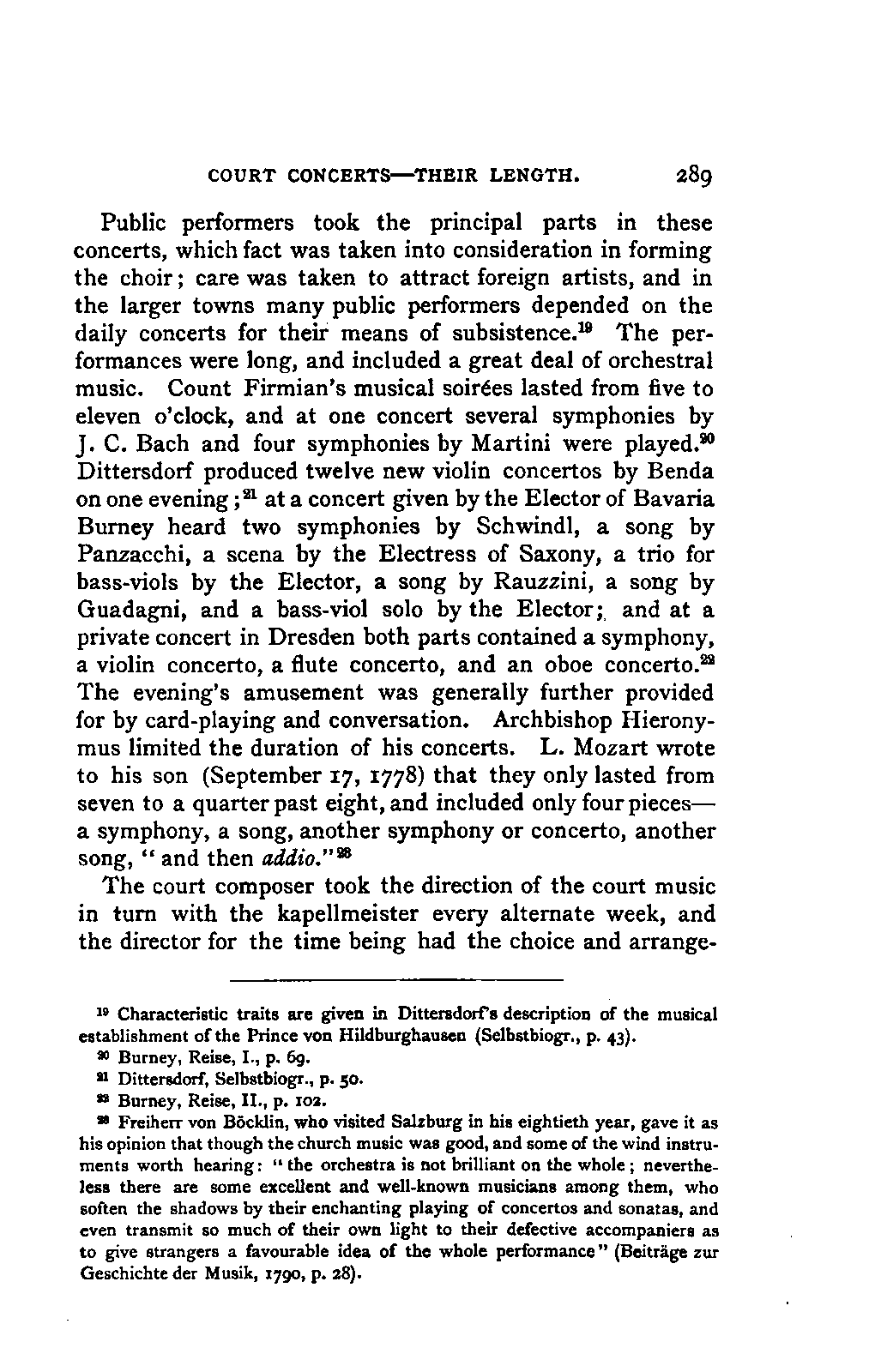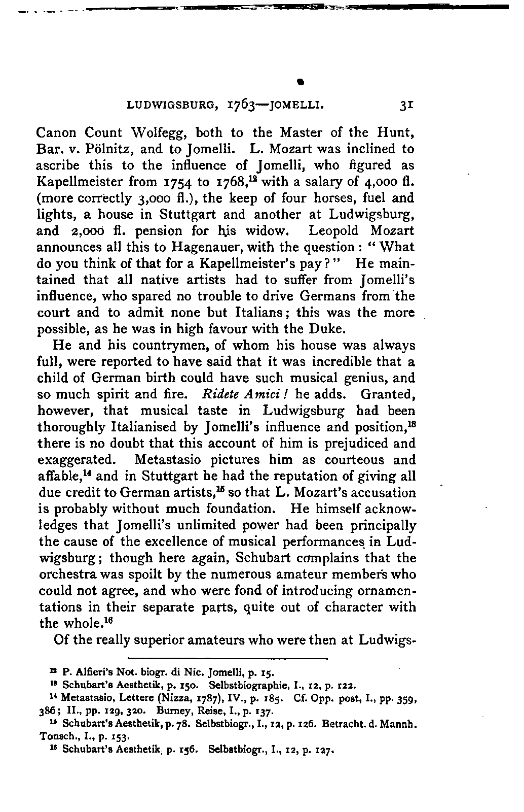 It has been my aim to represent, not only what immediately concerns Mozart, but also the time in which he lived, his circumstances, and the persons with whom he came in LIFE OF MOZART. [xx] contact, so far as all these affected the development of his genius. And here again I found the need of trustworthy information. Well informed as we may be on the history of literature and culture during the latter half of the eighteenth century, yet our information as to musical events and persons is meagre and obscure, and we know least of those regions which are of the greatest interest in the history of music. I doubt not that an historian, occupied with the study of this age, would discover much that has escaped me of interest, although I have heard even such complain of the poverty of material.