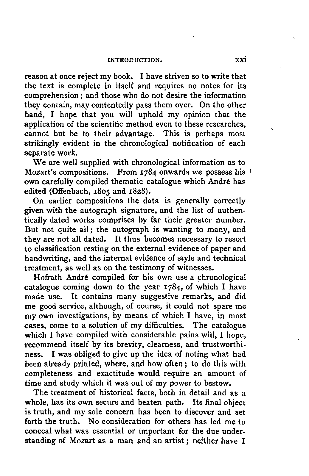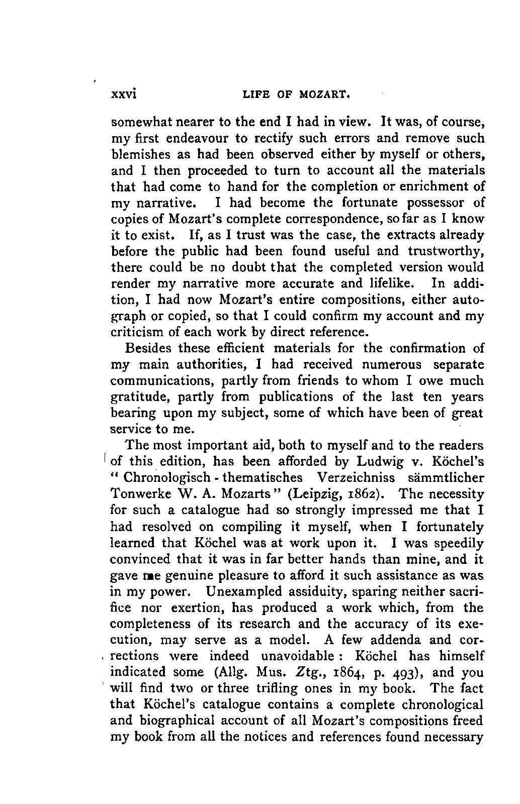 But the most important aid came from Aloys Fuchs. With extraordinary perseverance he had collected every writing that in any way related to Mozart, and with a disinterested liberality, rare among collectors, he placed at my service all that he possessed and all that he knew. INTRODUCTION. [xv] His chronological catalogue of all Mozart's works, published and unpublished, was of the greatest service to me, as well as the long list of documents, newspapers, journals, and pamphlets, which he had either in the original or copies.