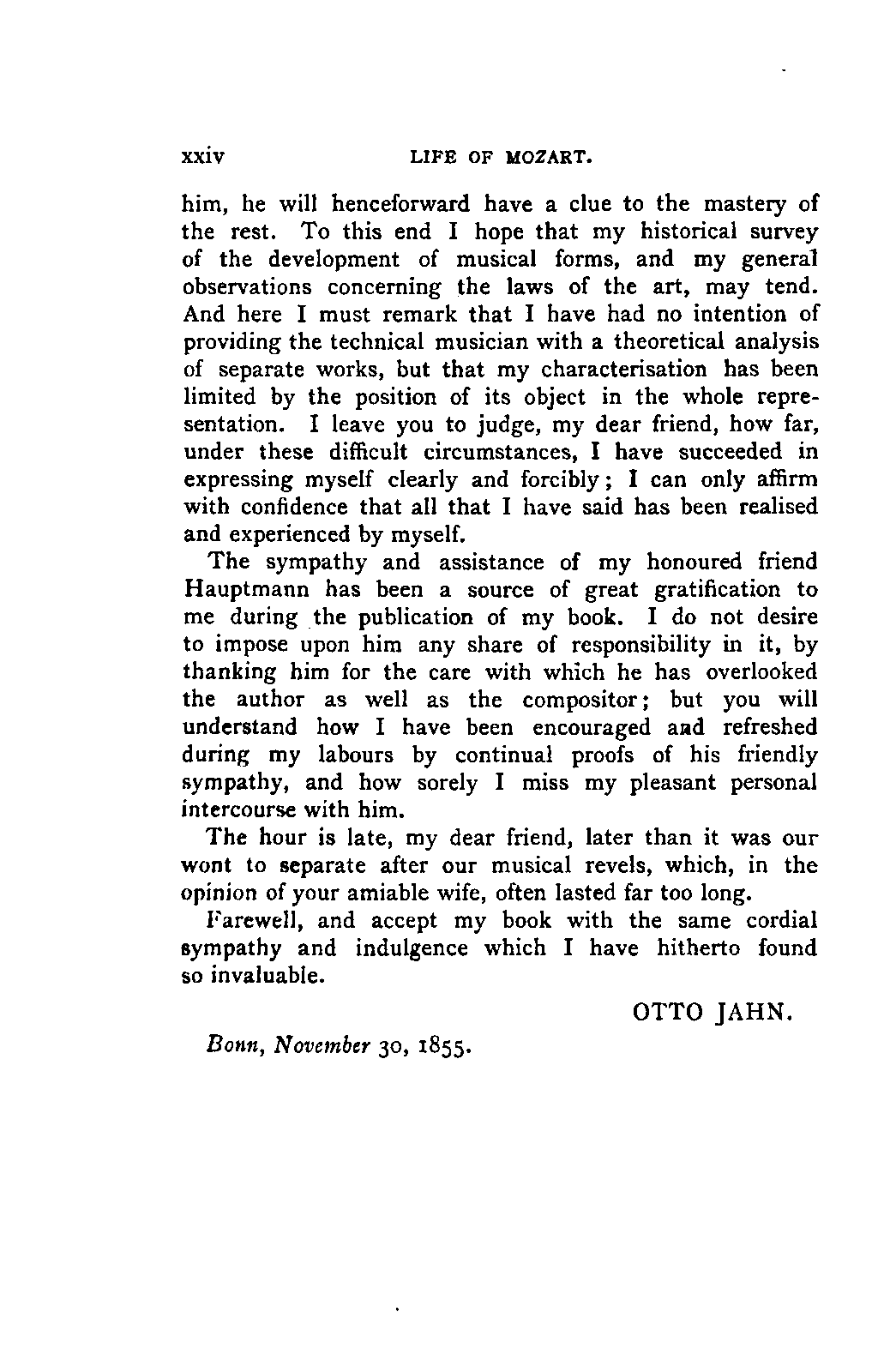 MY DEAR FRIEND,—I have little doubt that the afternoon of November 7, 1847, is as fresh in your memory as in my own. We had assembled in the Johan-niskirche to accompany the remains of Mendelssohn on their last sad journey, and by chance (for I had not been long in Leipzig, and my acquaintance with you was slight) we walked side by side in the long line of mourners. From grief at the early loss of a master, whose cultivation, self-discipline, and endeavours after the good and the beautiful had exercised a truly beneficial influence over the art of our age, our grave talk turned to the more particular consideration of music in itself, and to the great masters of the past! This led us to the interchange of many ideas, and to a conviction of our unanimity of principle and sentiment on most subjects. Thus, for instance, we coincided in our experience that at a certain period of our mental development Mozart's music had seemed cold and unintelligible to our restless spirits, ever soaring into the unknown, and incapable of appreciating a master whose passions in their workings are not laid bare to view, but who offers us perfect beauty victorious over turbulence and impurity. Turning to him again in later years, we are amazed alike at the wondrous wealth of his art, and at our former insensibility to it. For my own part, I confided to you how, after severe illness, which had debarred me from music for many years, it was Mozart who first gave me courage and interest to turn to it again. We agreed, also, that minds which are able to receive and appreciate art for its own sake, must yield themselves captive to Mozart, but without sacrificing their freedom to recognise all that is grand and beautiful elsewhere.