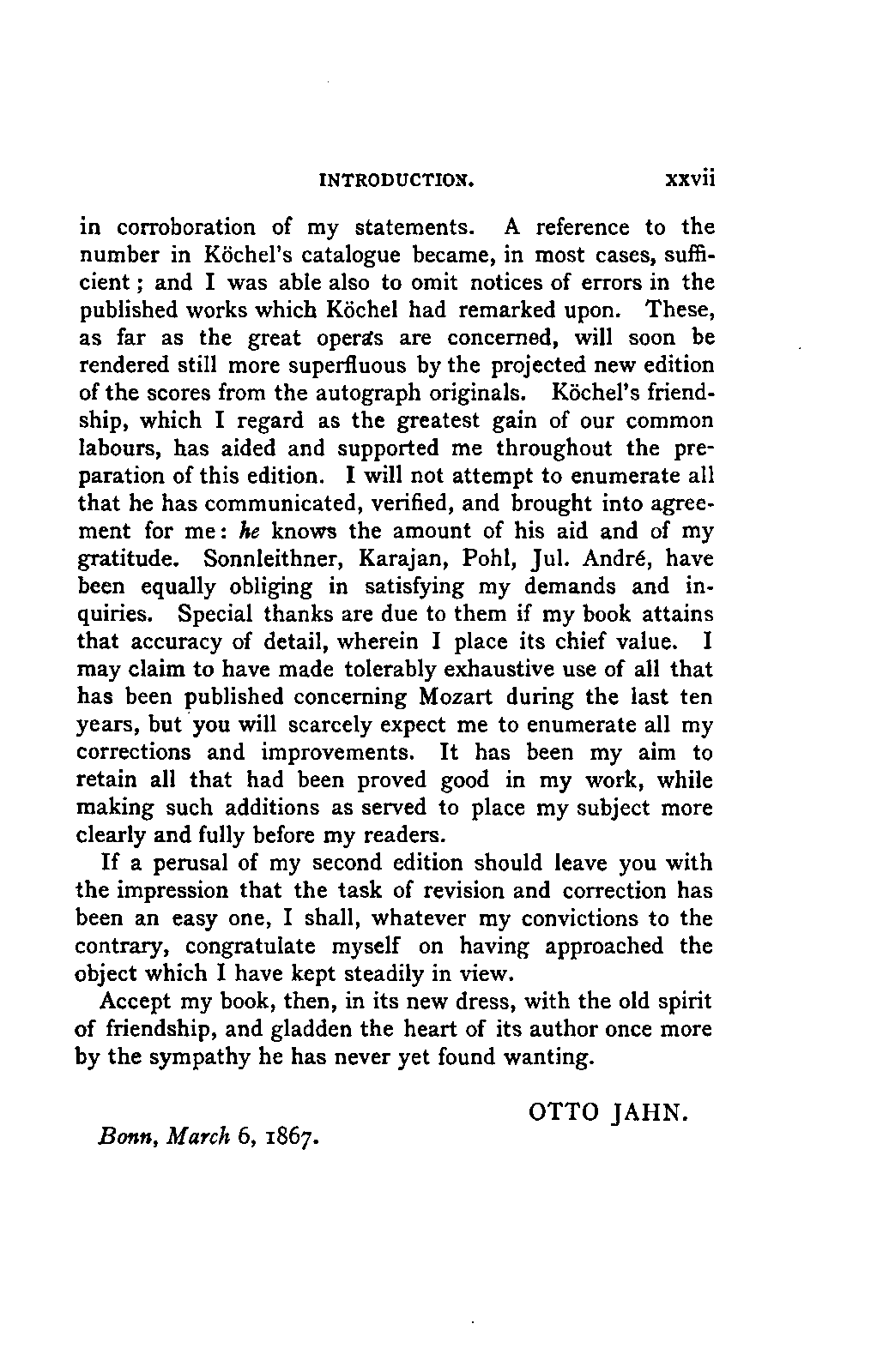 Jahn himself enjoyed even higher advantages for his task than Holmes had done. He was not only a thorough practical musician, a careful and sympathetic critic, and a learned musical bibliographer, but he was a skilled littérateur; an adept in philology and archaeology and in the history of art and literature; the author of many original works on these subjects, and of innumerable editions of the classics, ancient and modern; and imbued with the true spirit of patient investigation and accurate research. His position, and the esteem in which he was held throughout Germany, gave him command of all the materials necessary for his work, even of the most private kind. How he entered on his task, with what true modesty and determination he pursued it, from its first suggestion, during the funeral of Mendelssohn in 1847, down to its completion in 1855,* may be seen from his own interesting and characteristic introduction (pp. i.-xxiv), as well as the pains which he took to revise his work for the second edition,** twelve years later,